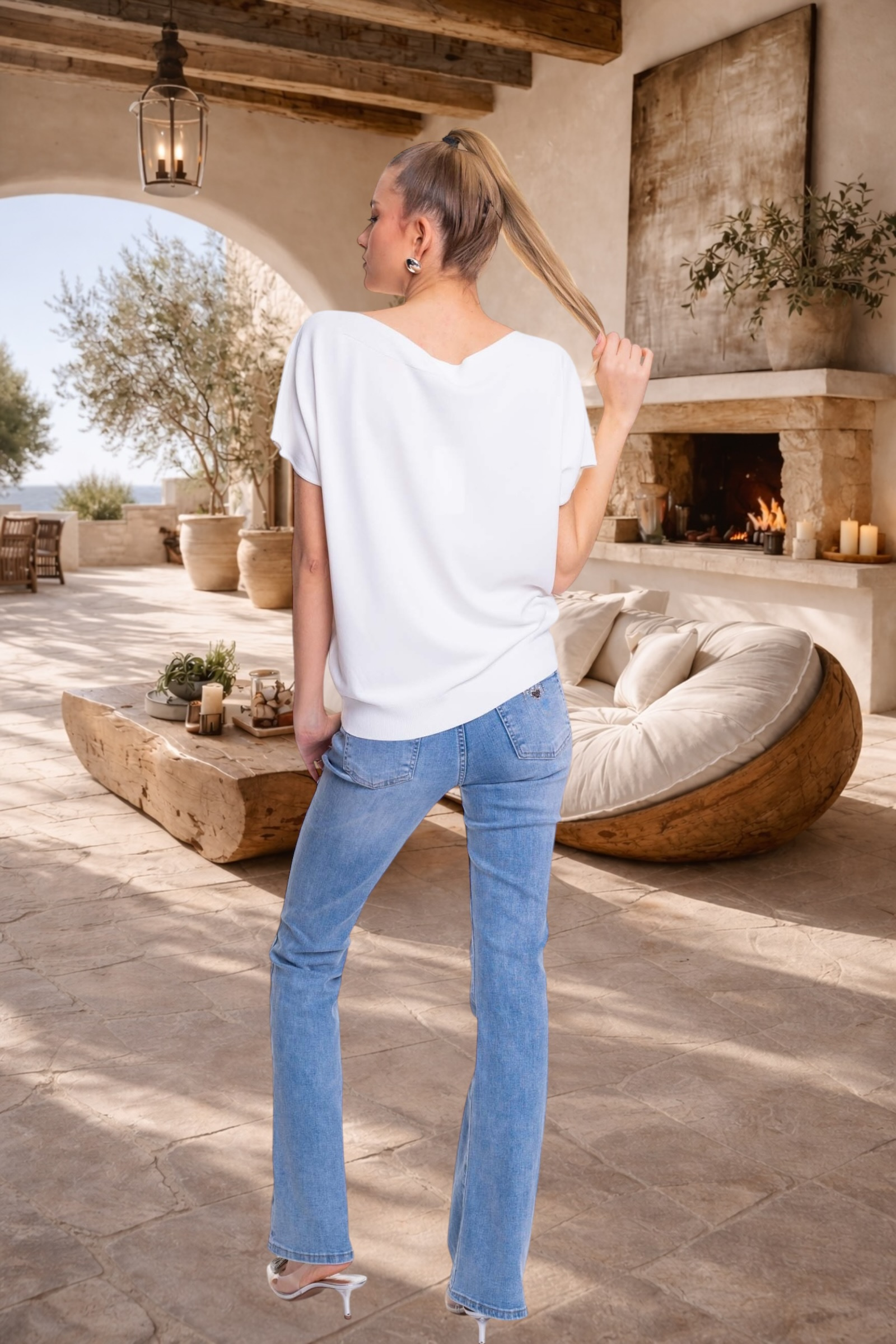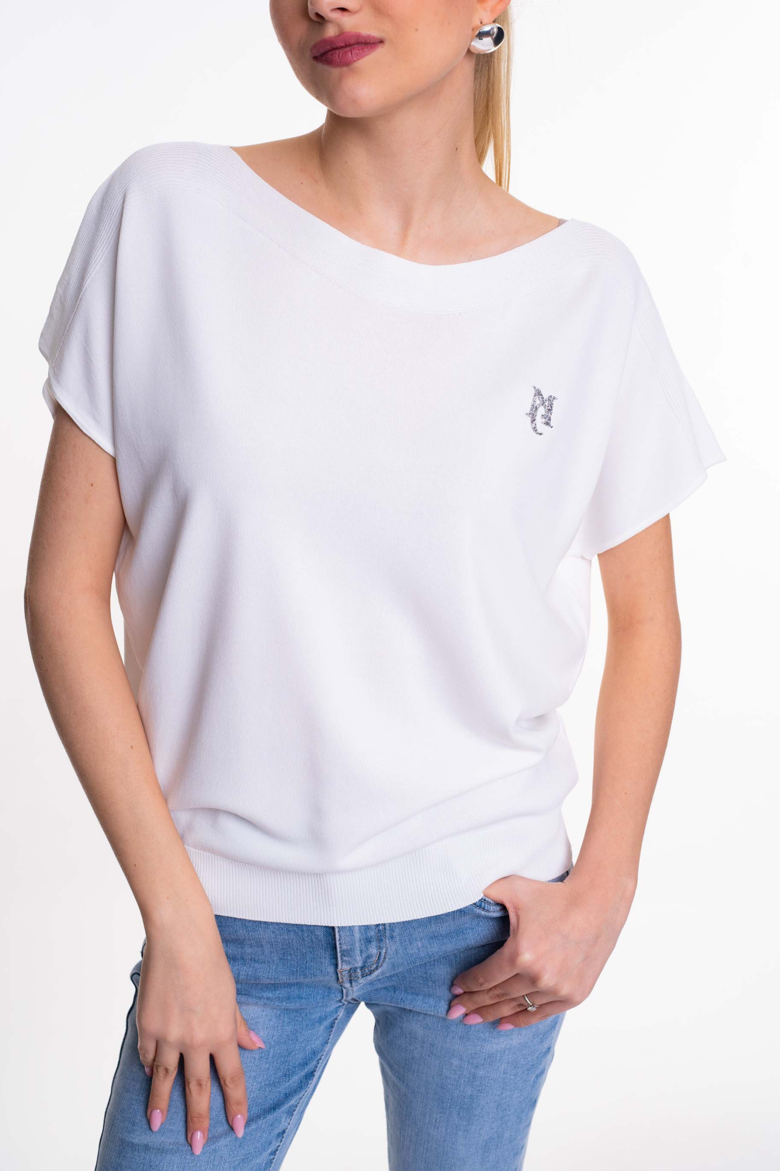 Vékony kötött anyagú, lezser szabásvonalú tavaszi pulóver ejtett vállrésszel, strasszköves matrica nyomott márkajelzéssel.