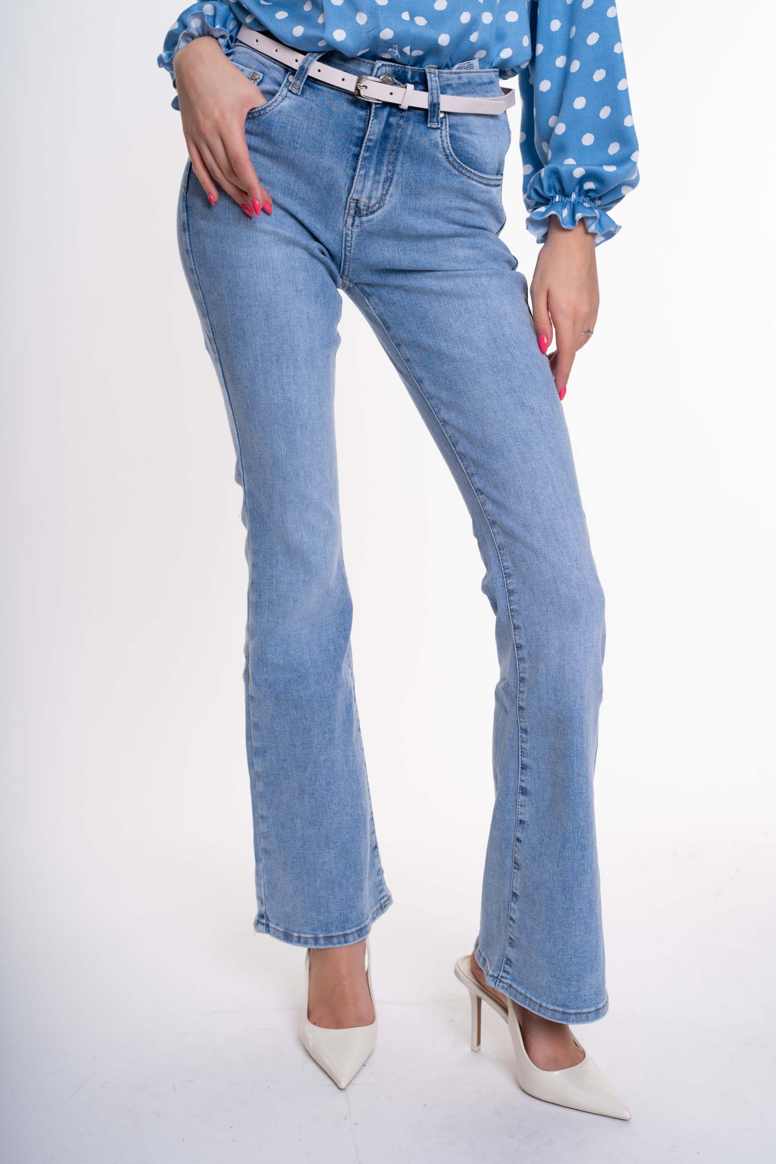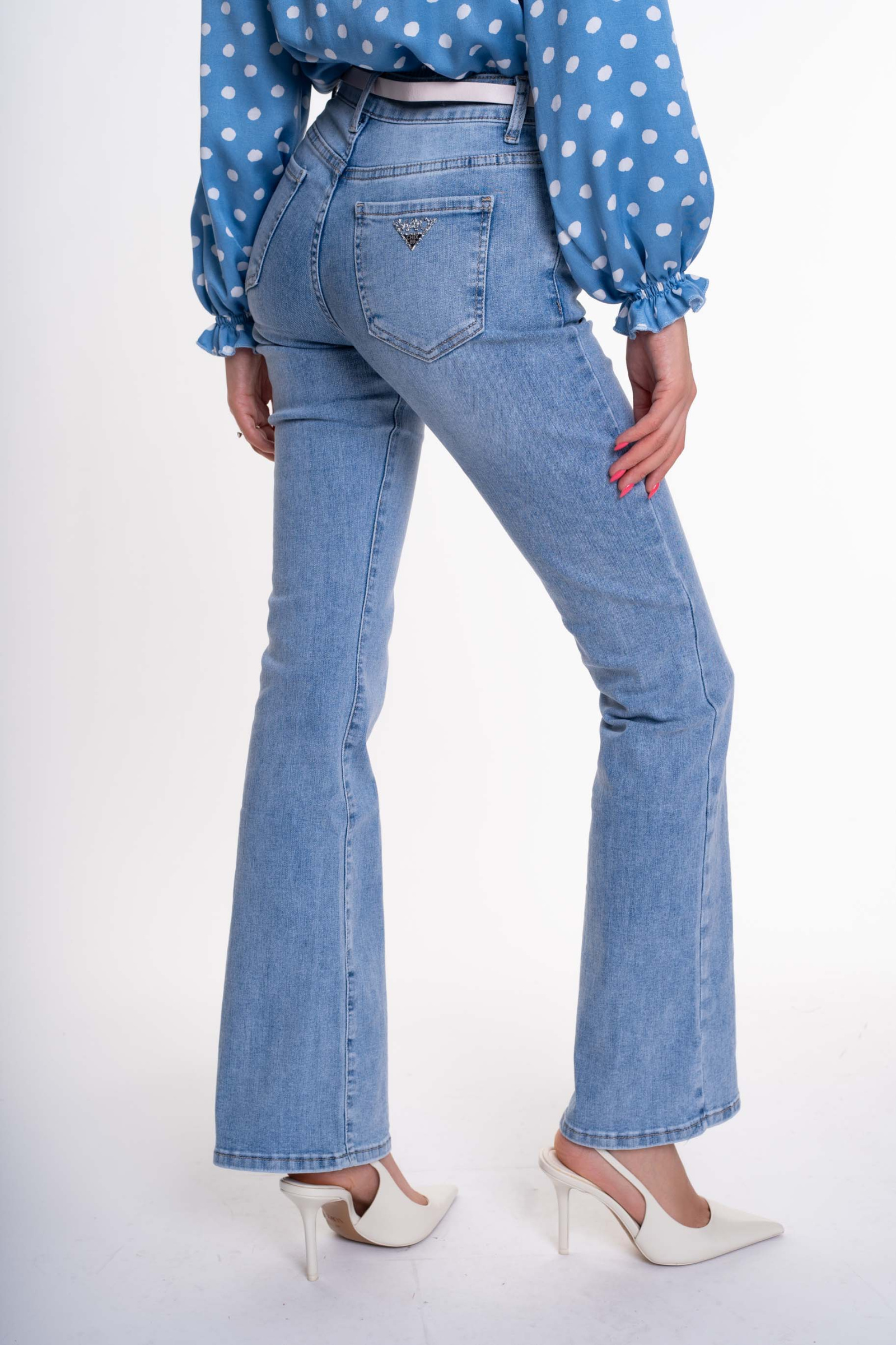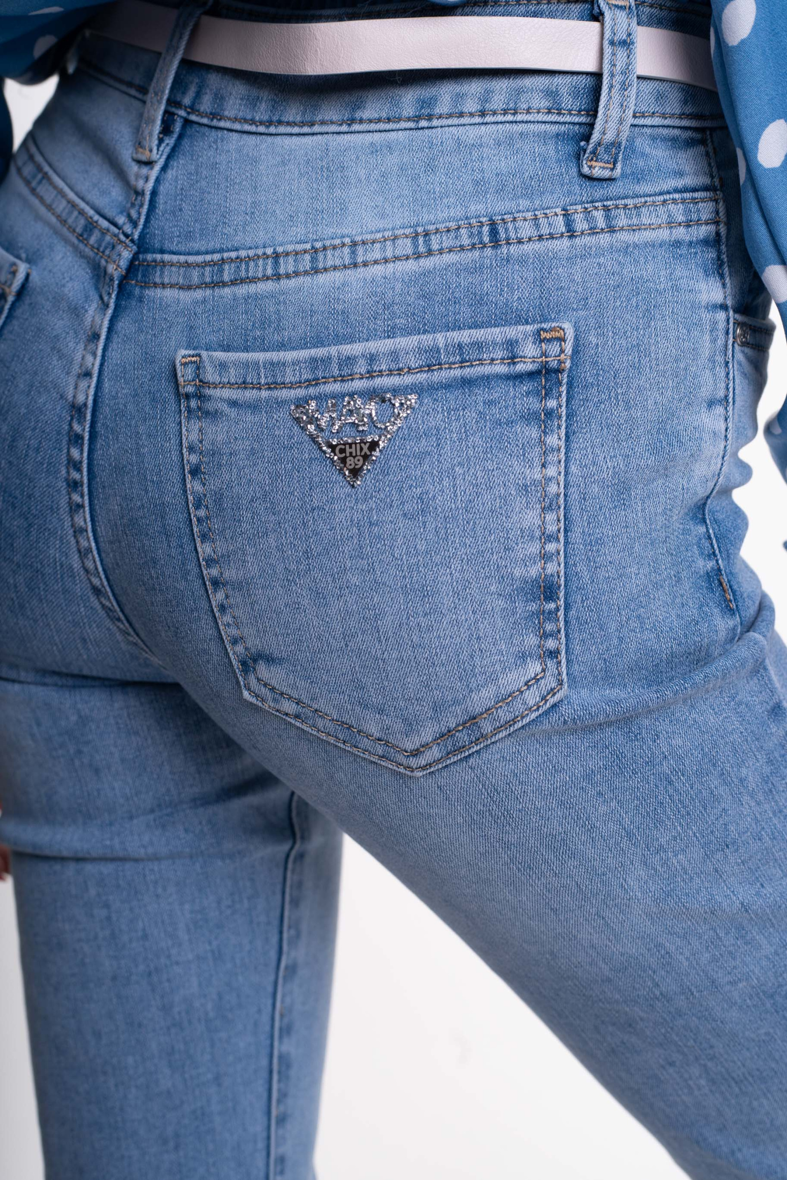 Elasztikus anyagból készült, trapézszárú farmer, strasszos matricanyomott márkajelzéssel, öv kiegészítővel.