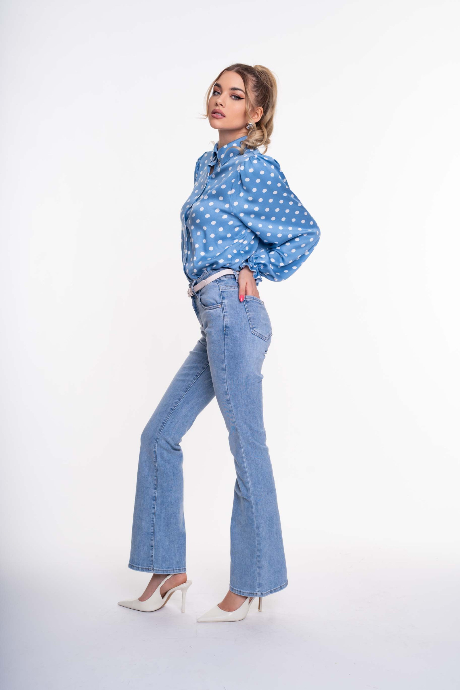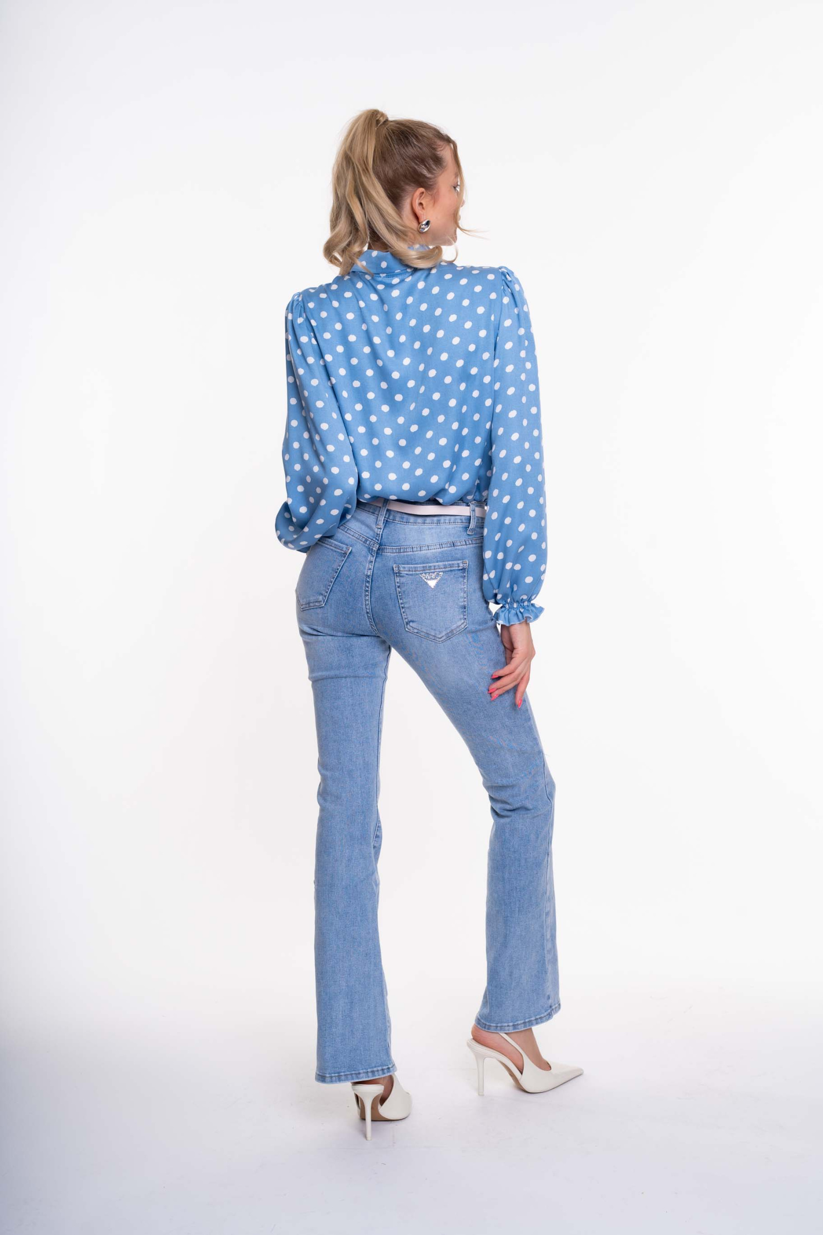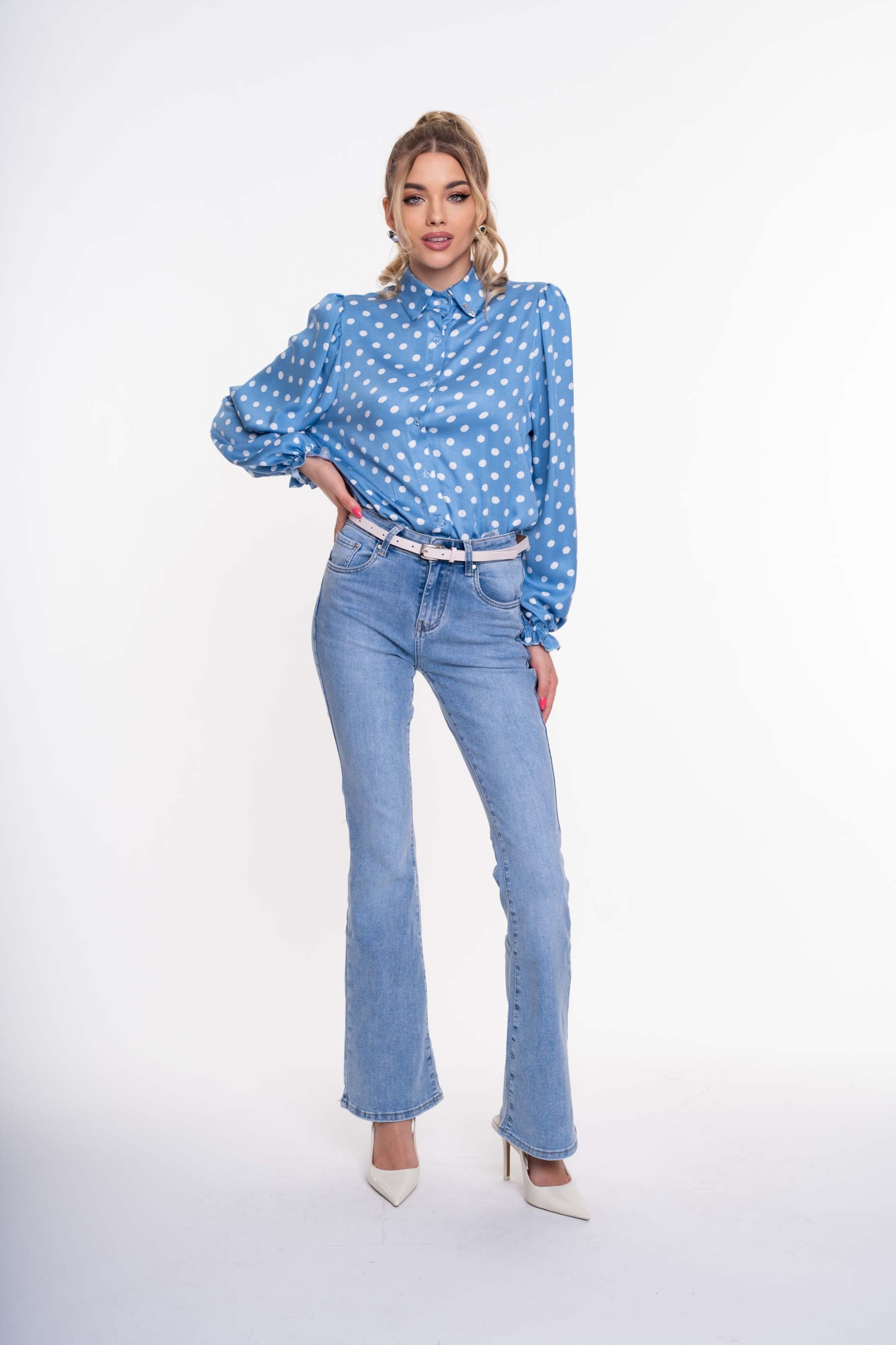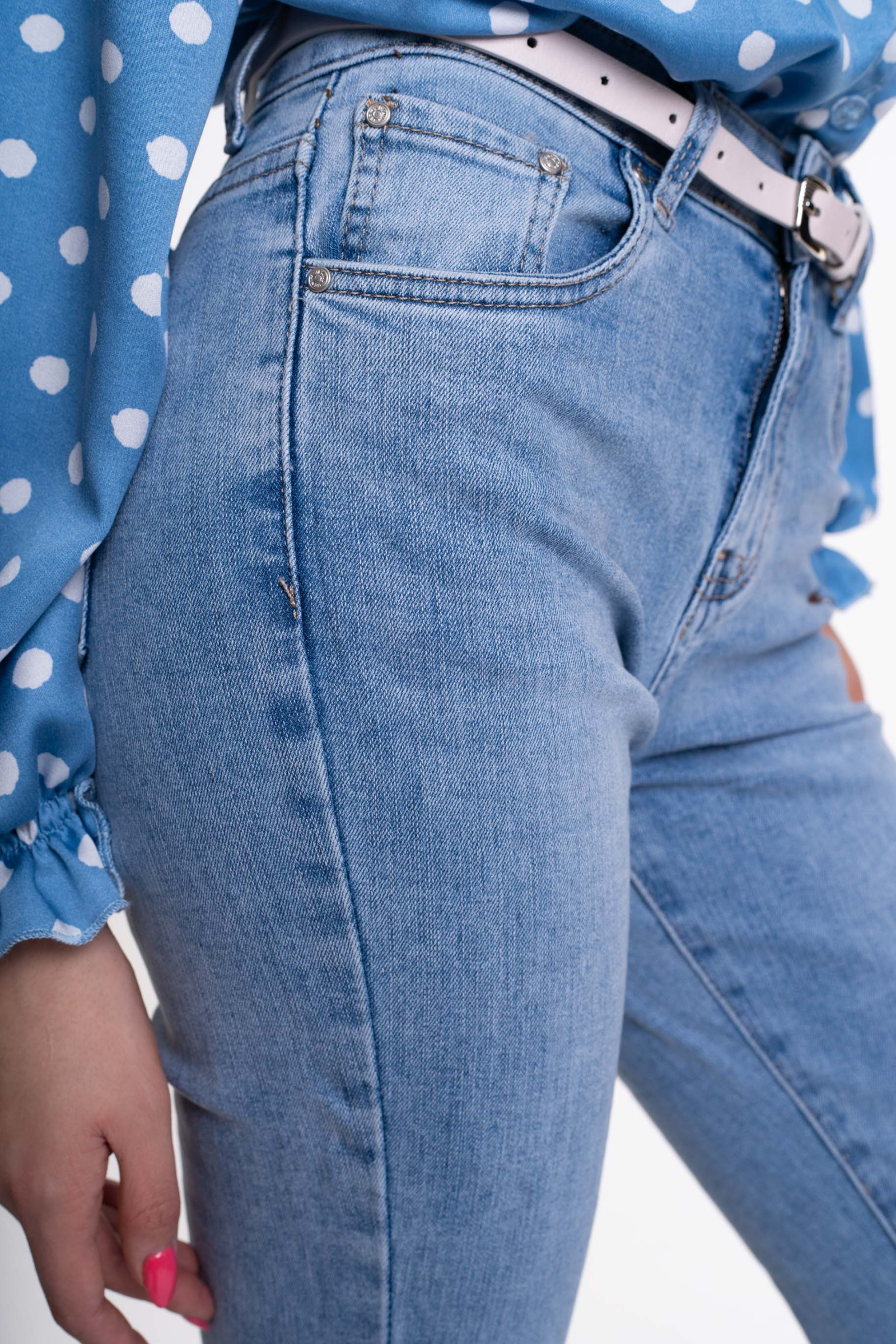 Elasztikus anyagból készült, trapézszárú farmer, strasszos matricanyomott márkajelzéssel, öv kiegészítővel.