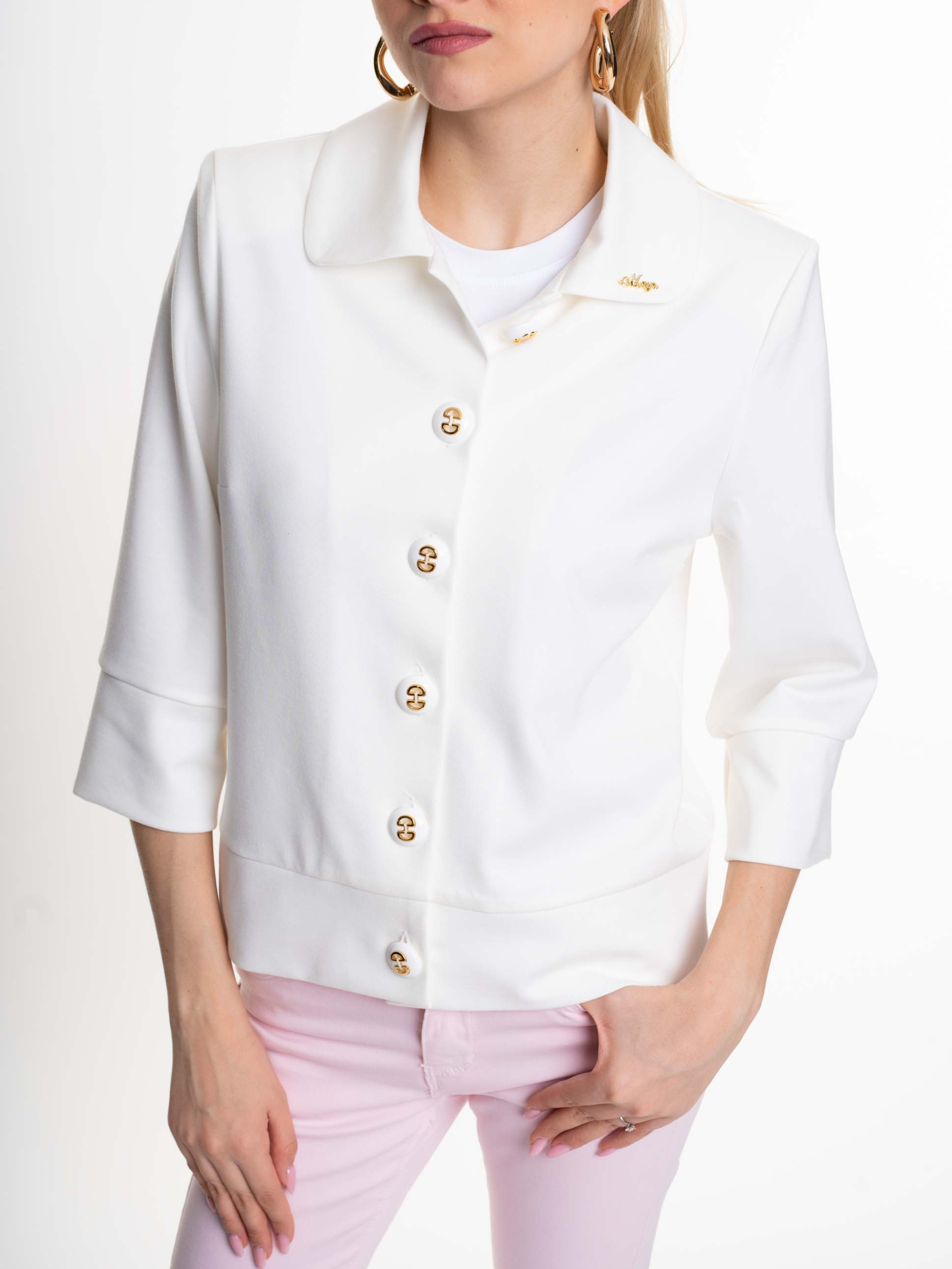 Elasztikus anyagból készül, egyenes szabású blézer válltöméssel, gombos záródással, kis fém márkajelzéssel.