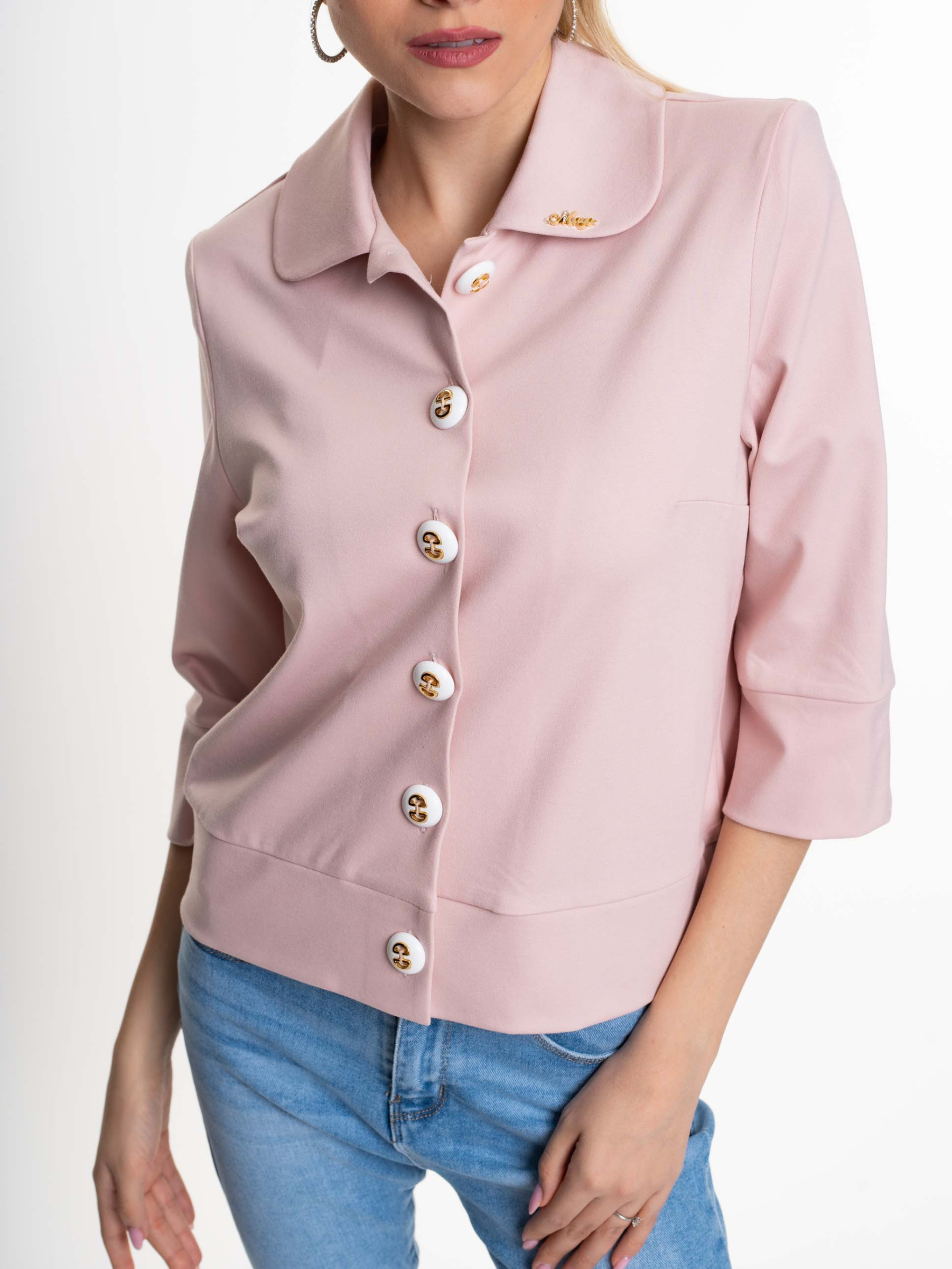 Elasztikus anyagból készül, egyenes szabású blézer válltöméssel, gombos záródással, kis fém márkajelzéssel.