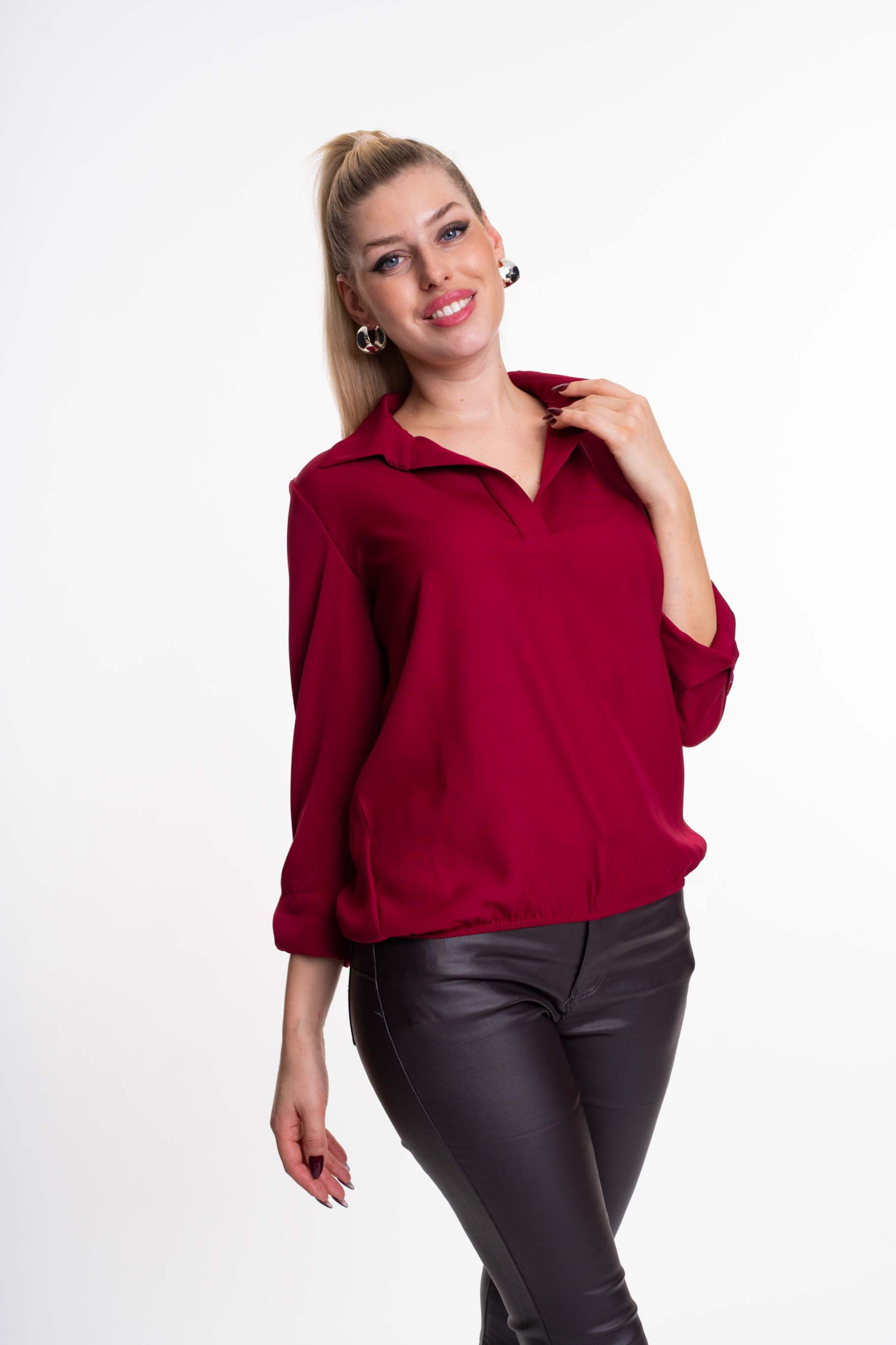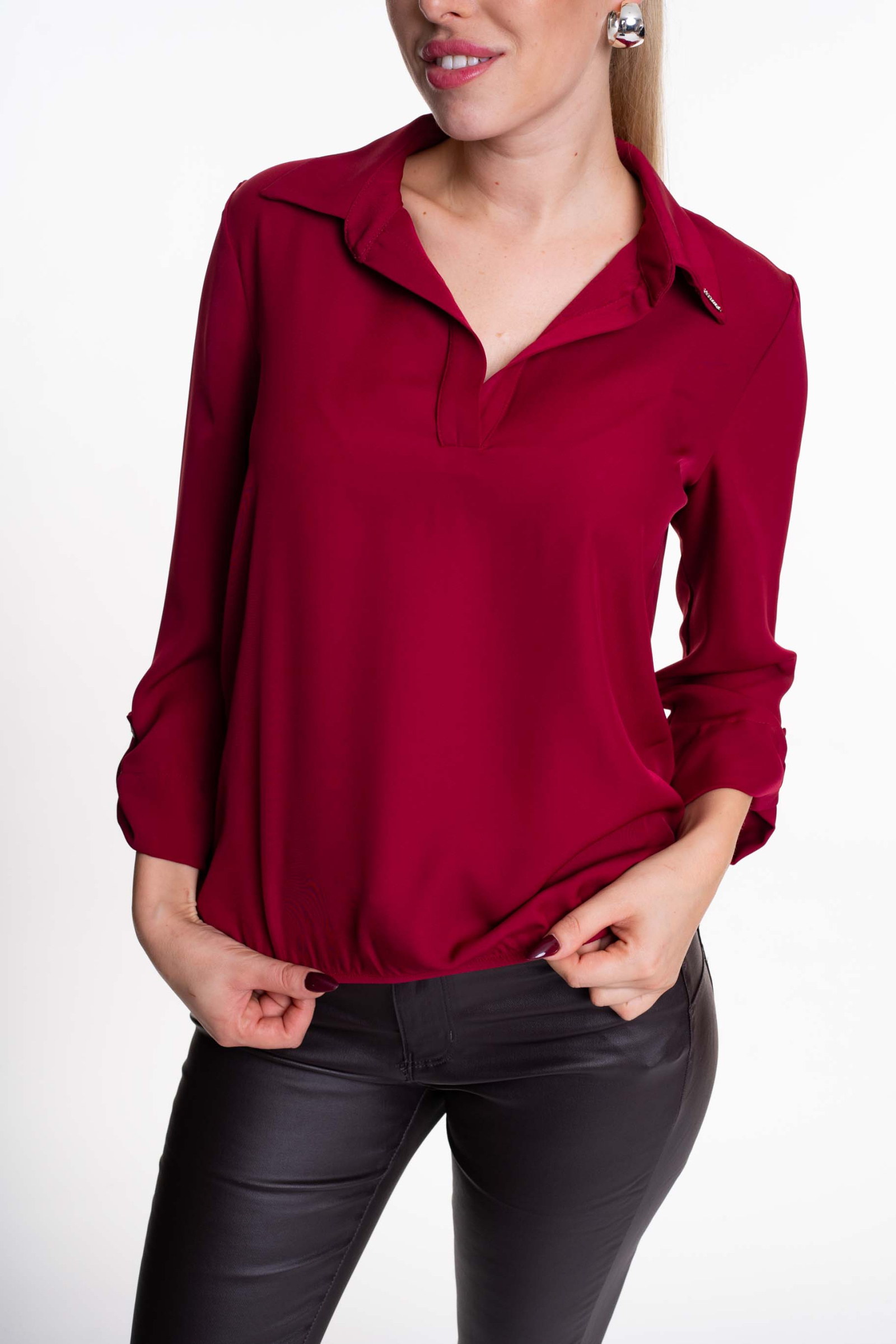 Enyhén elasztikus anyagból készült, lezser szabásvonalú blúz, gumírozott alja résszel, kis fém márkajelzéssel.