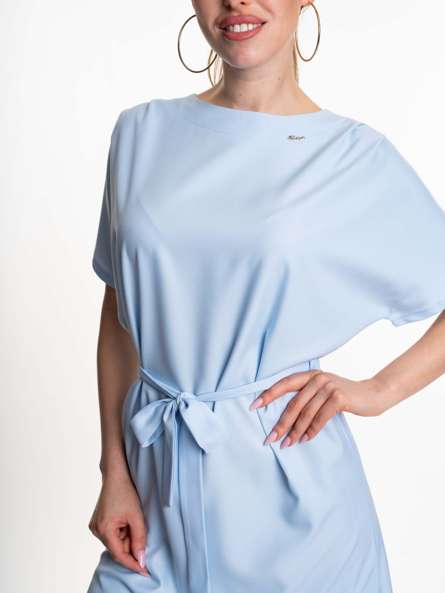 Enyhén elasztikus anyagból készült, lezser szabású ruha, derekán saját anyagából készült megkötővel, vállain hajtásokkal díszítve, kis fém márkajelzéssel.