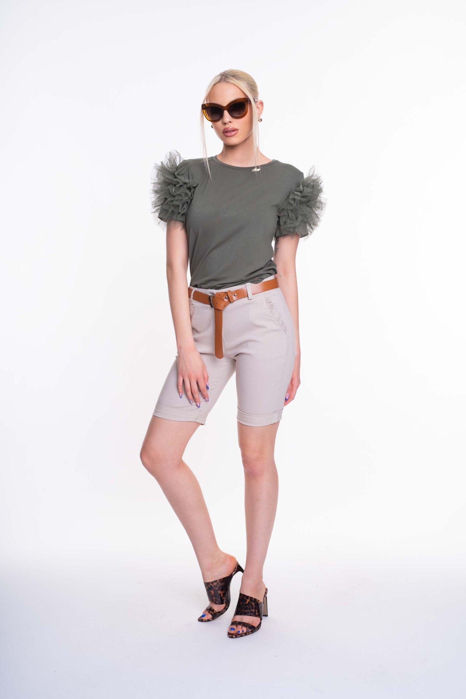 Elasztikus anyagból készült póló ujján tüll díszitéssel, kis fém márkajelzéssel