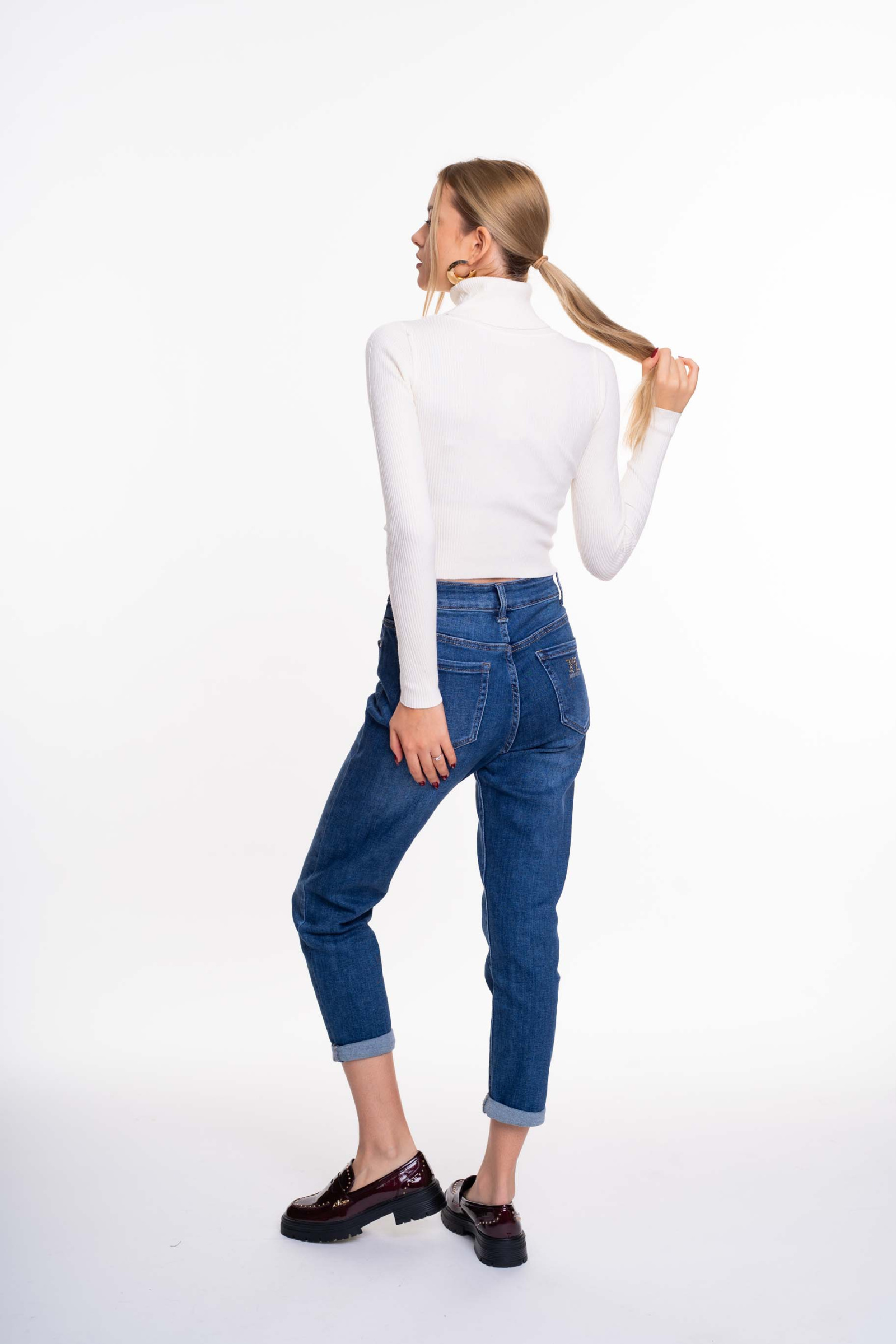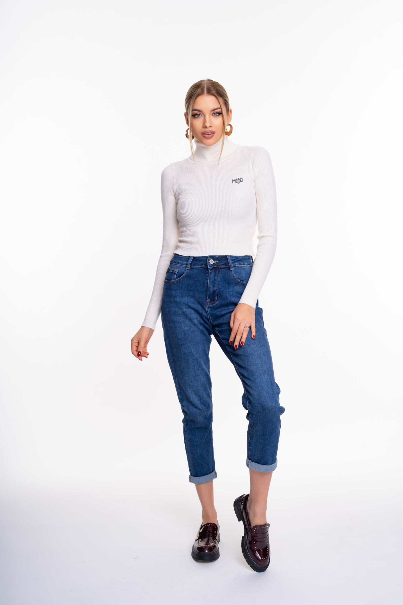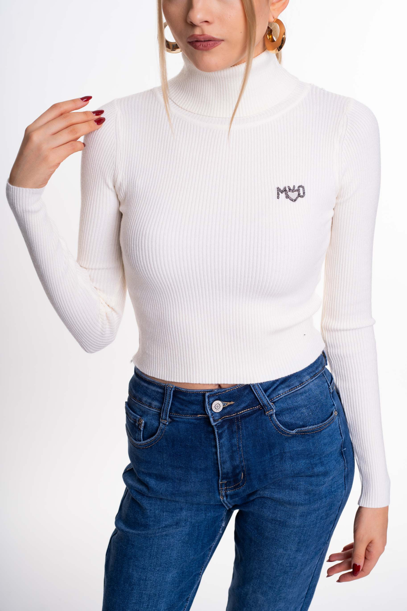 Elasztikus, bordás kötött anyagból készült, rövid fazonú felső, strasszköves matrica nyomott márkajelzéssel.