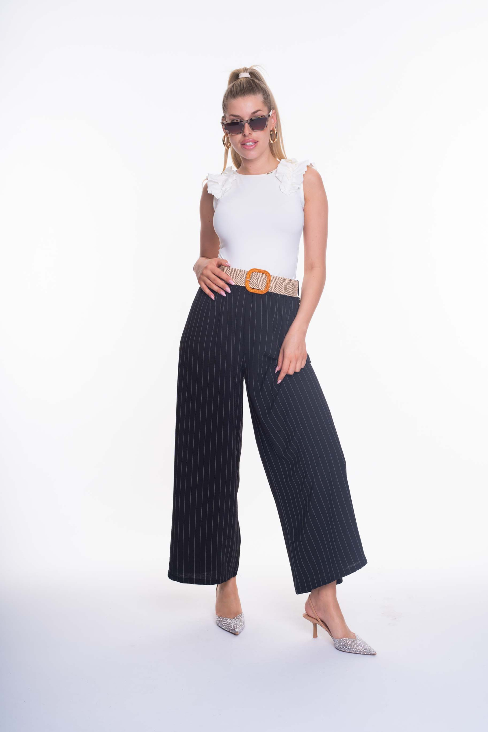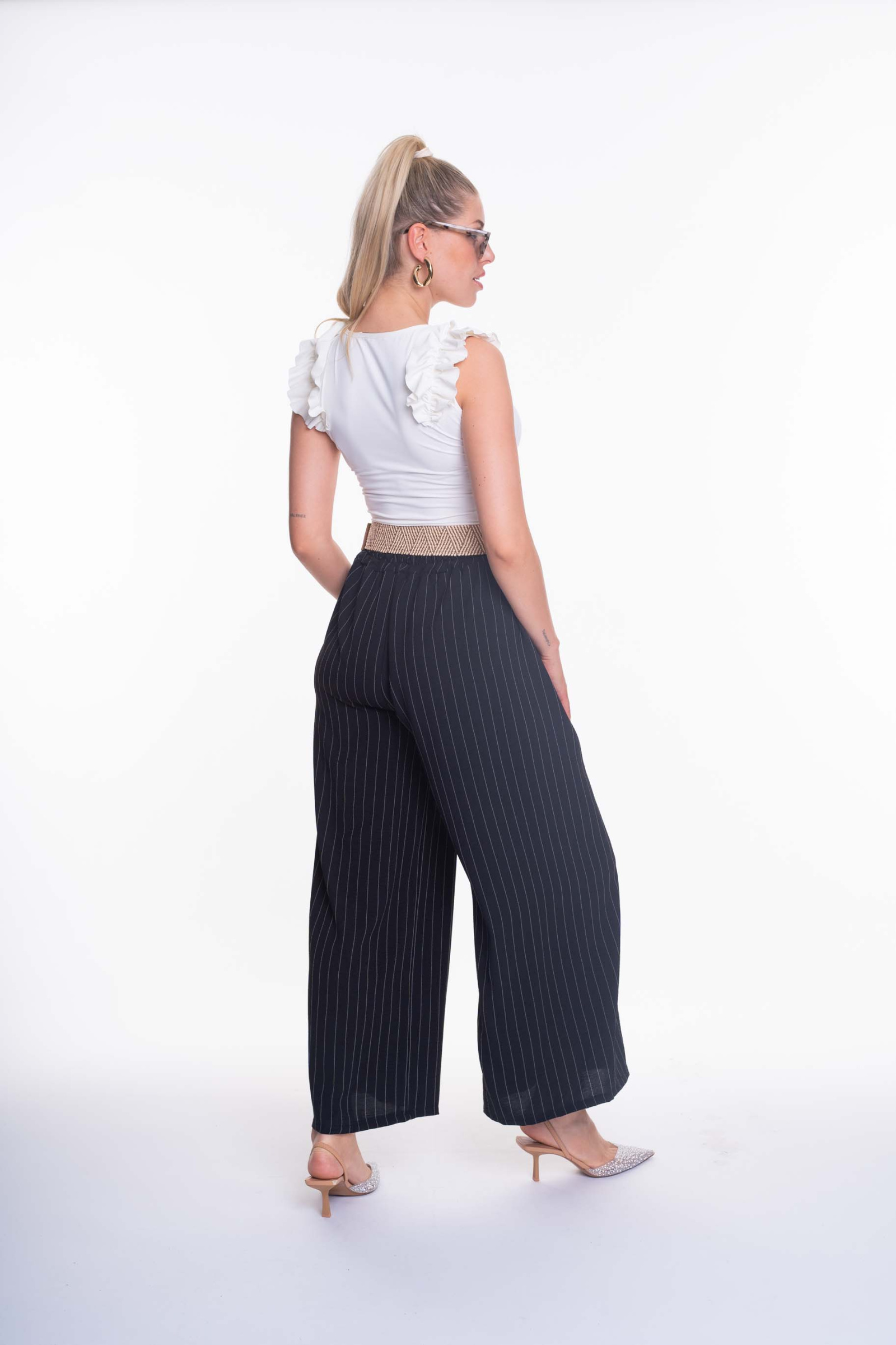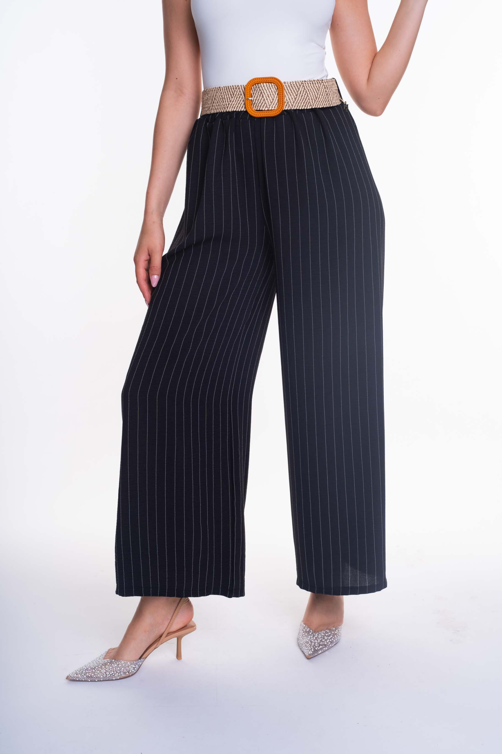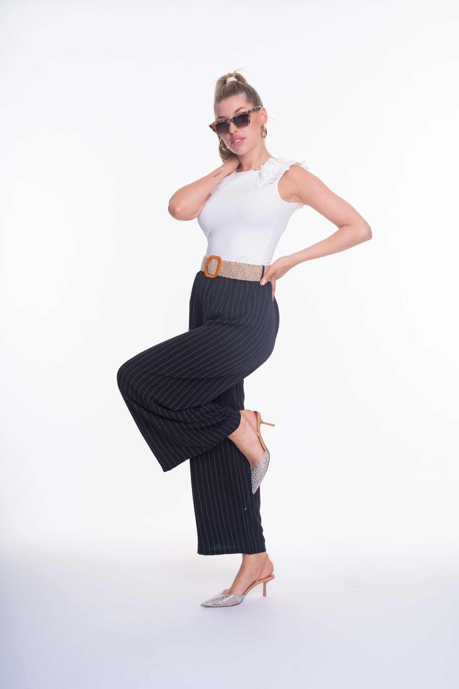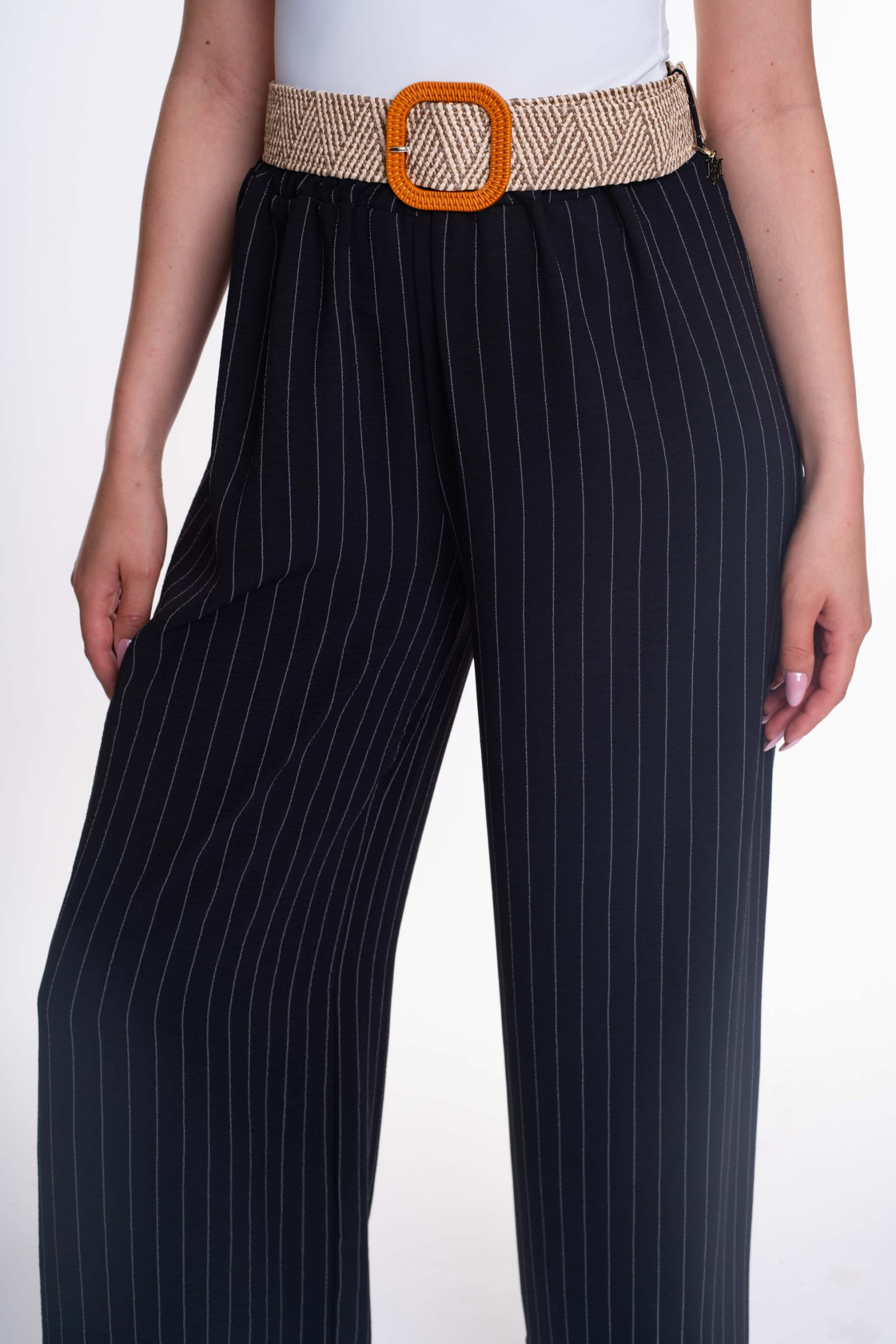 Enyhén rugalmas anyagból készült bő szárú nadrág, gumis derékrésszel, öv kiegészítővel, mosáshoz levehető kis fém márkajelzéssel.