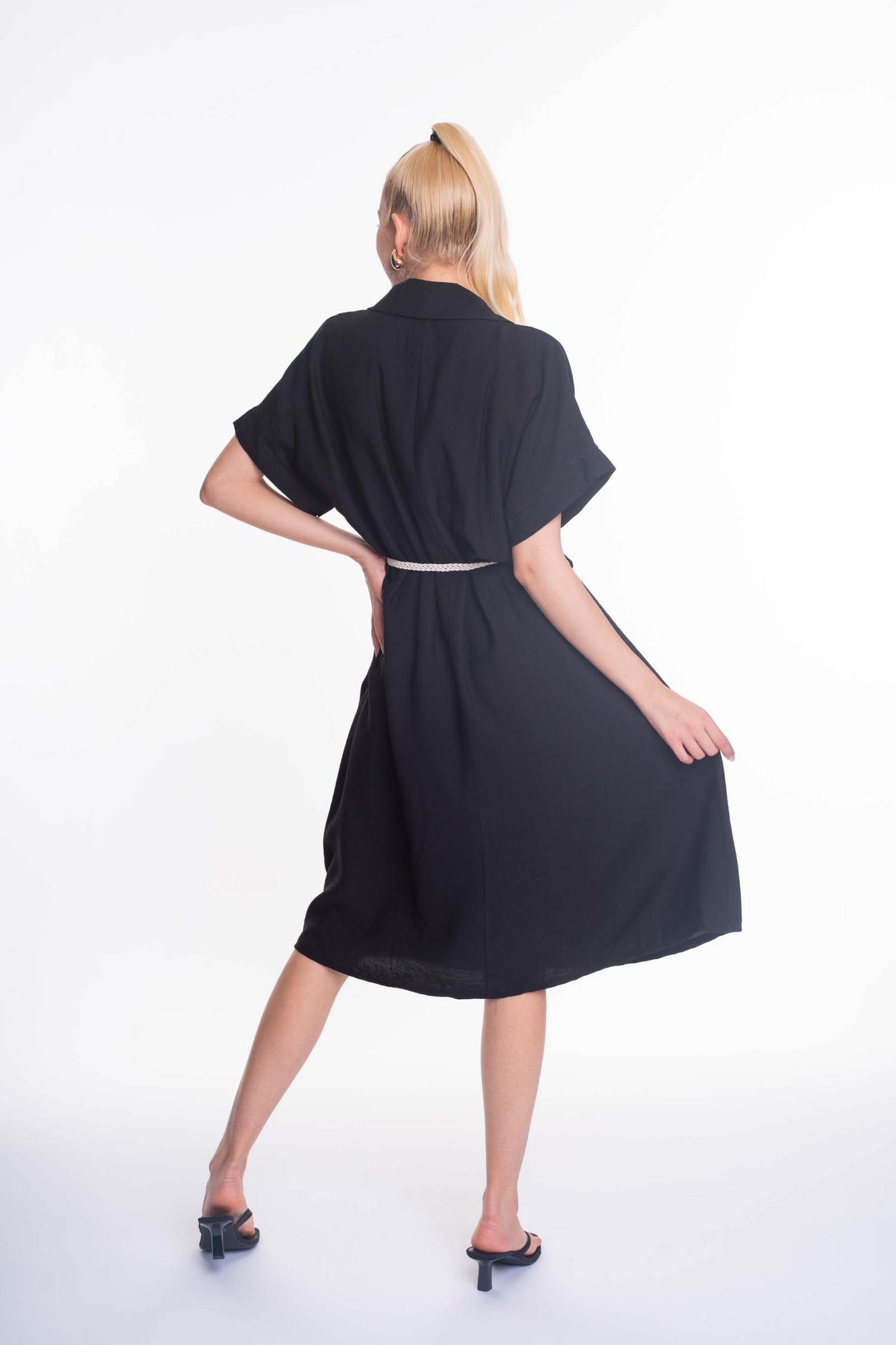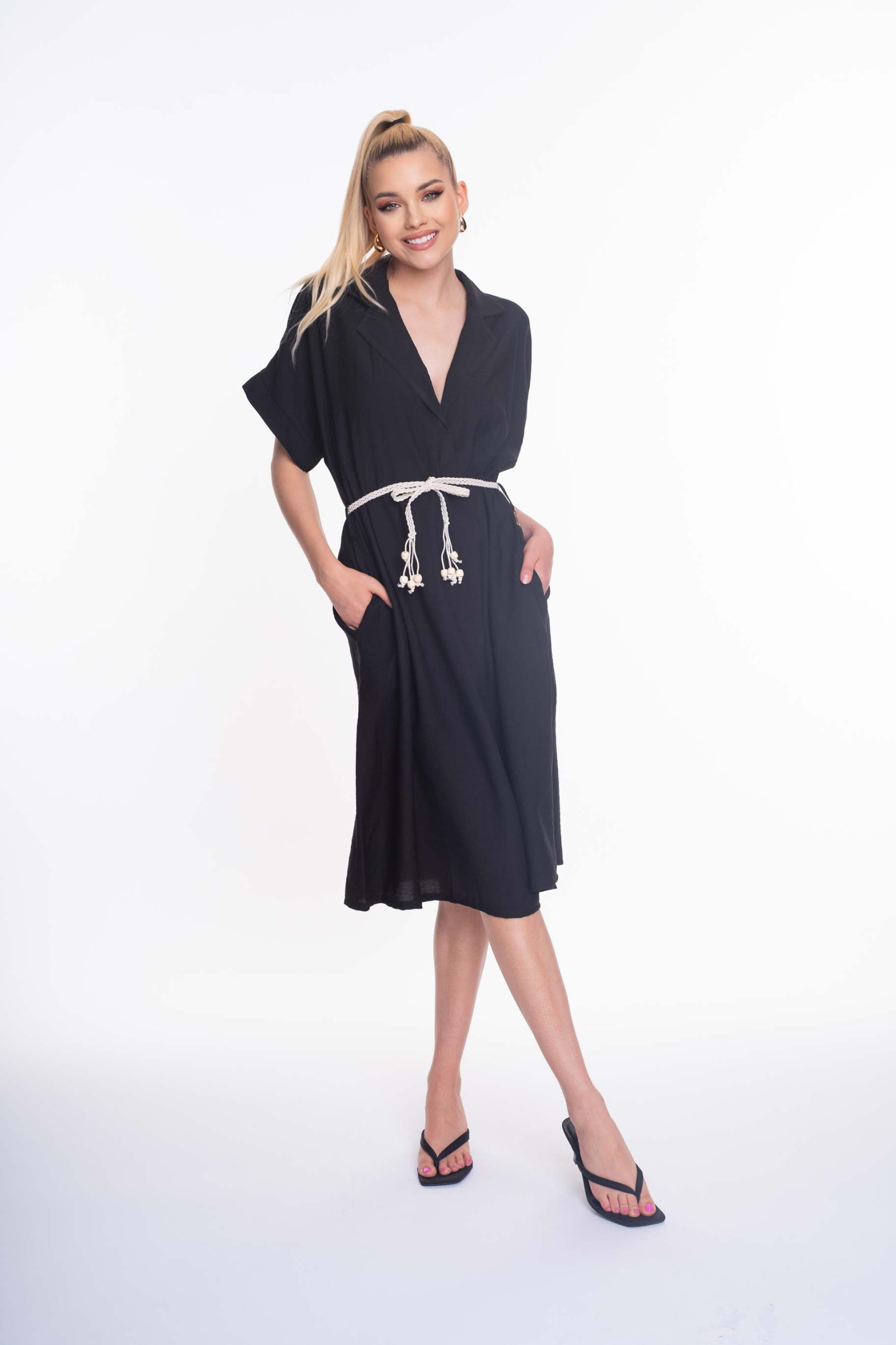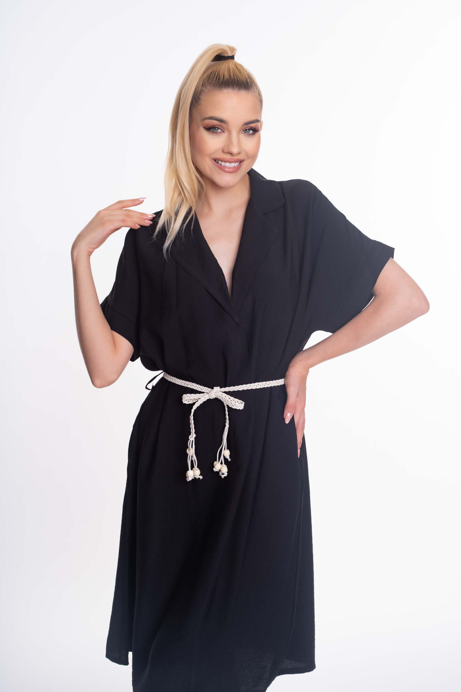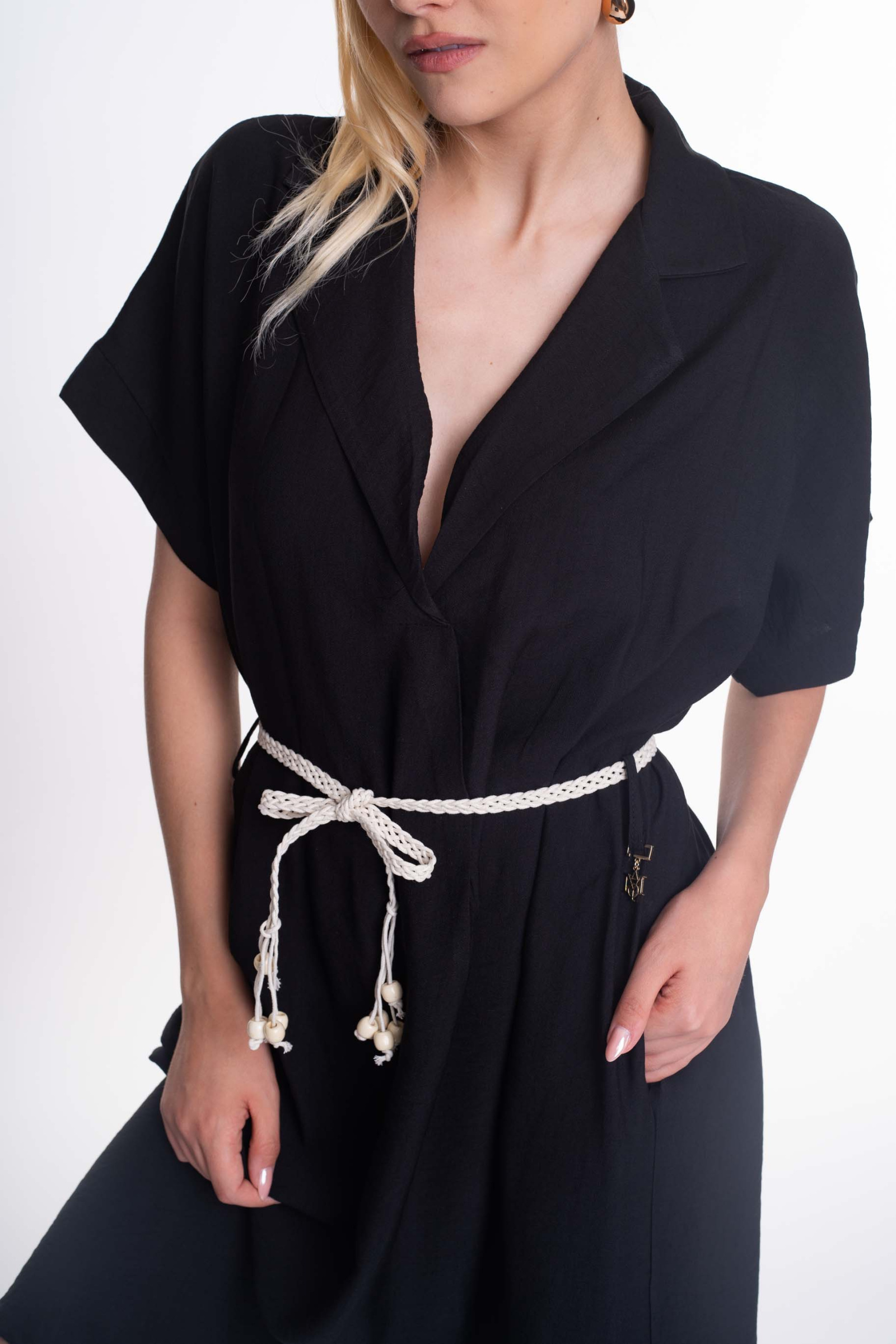 Fix anyagból készült, bő szabásvonalú, galléros ruha, derekán fonott öv kiegészítővel, mosáshoz levehető kis fém márkajelzéssel.
