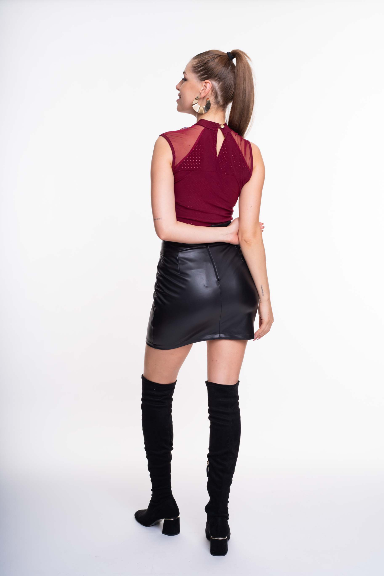 Elasztikus műbőr anyagból készült térdszoknya, cippzáras záródással, fém díszítéssel, alján kis fém márkajelzéssel.