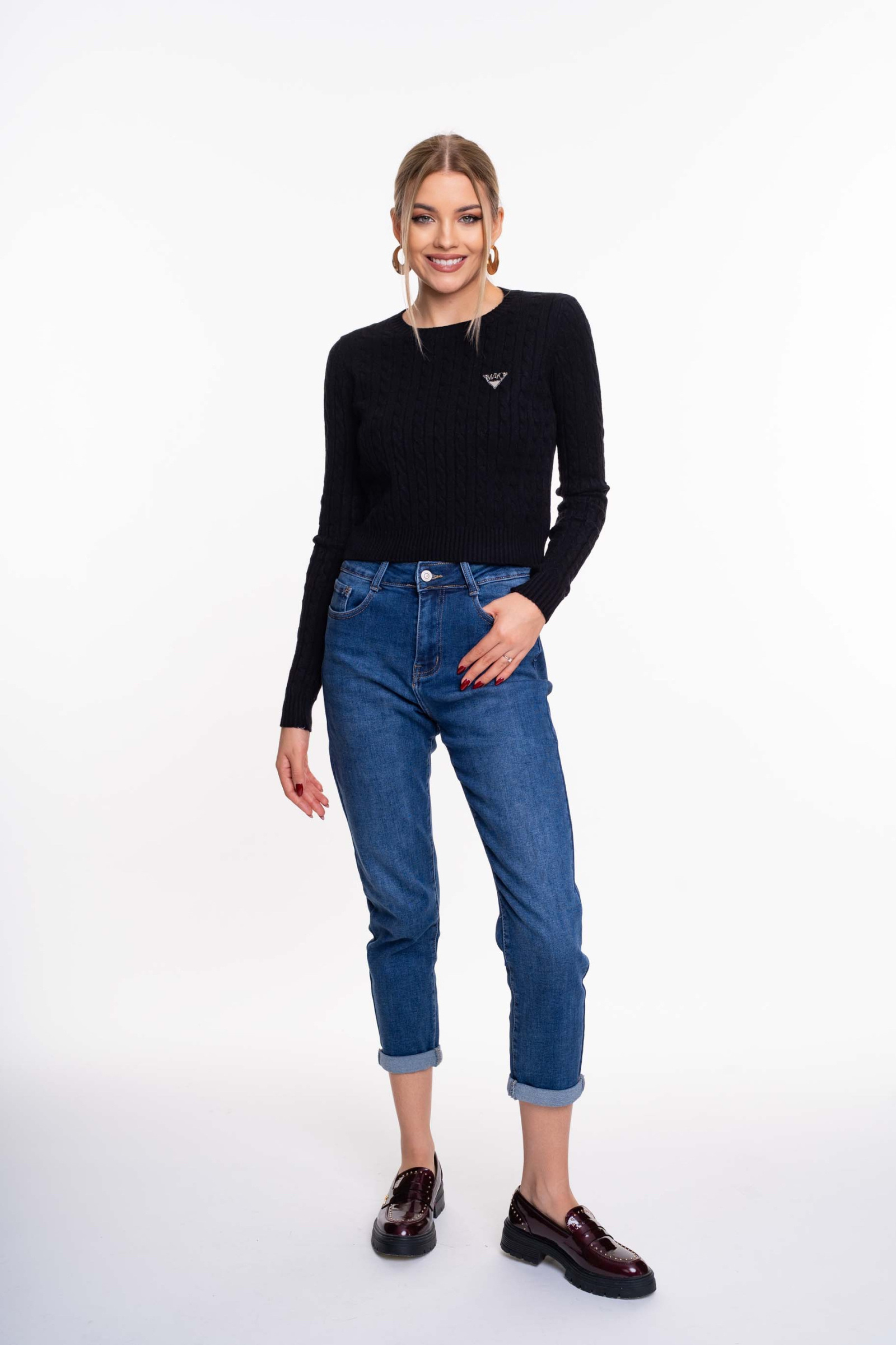 Rövid fazonú, környakú, anyagában kötött mintás pulóver, strasszköves matrica nyomott márkajelzéssel.