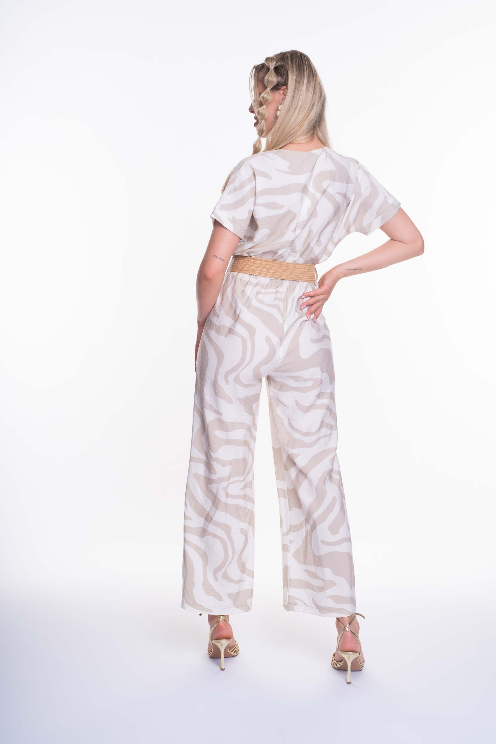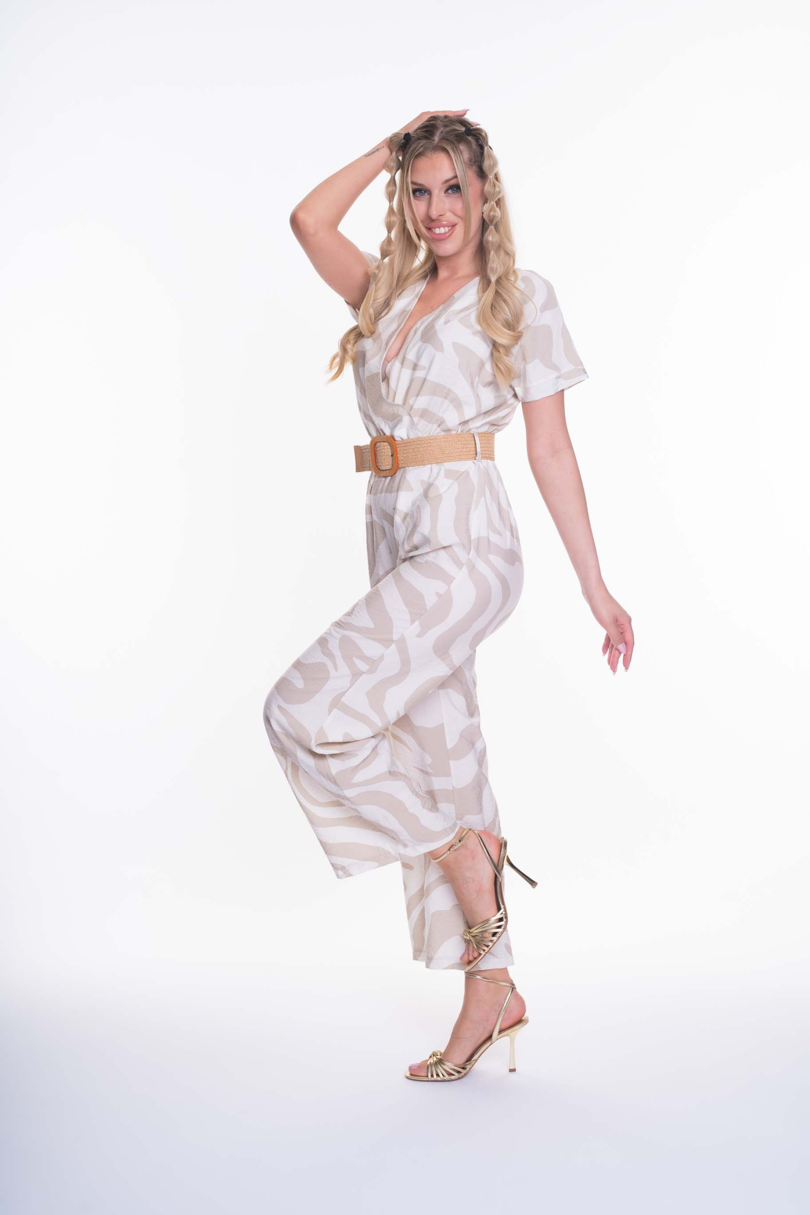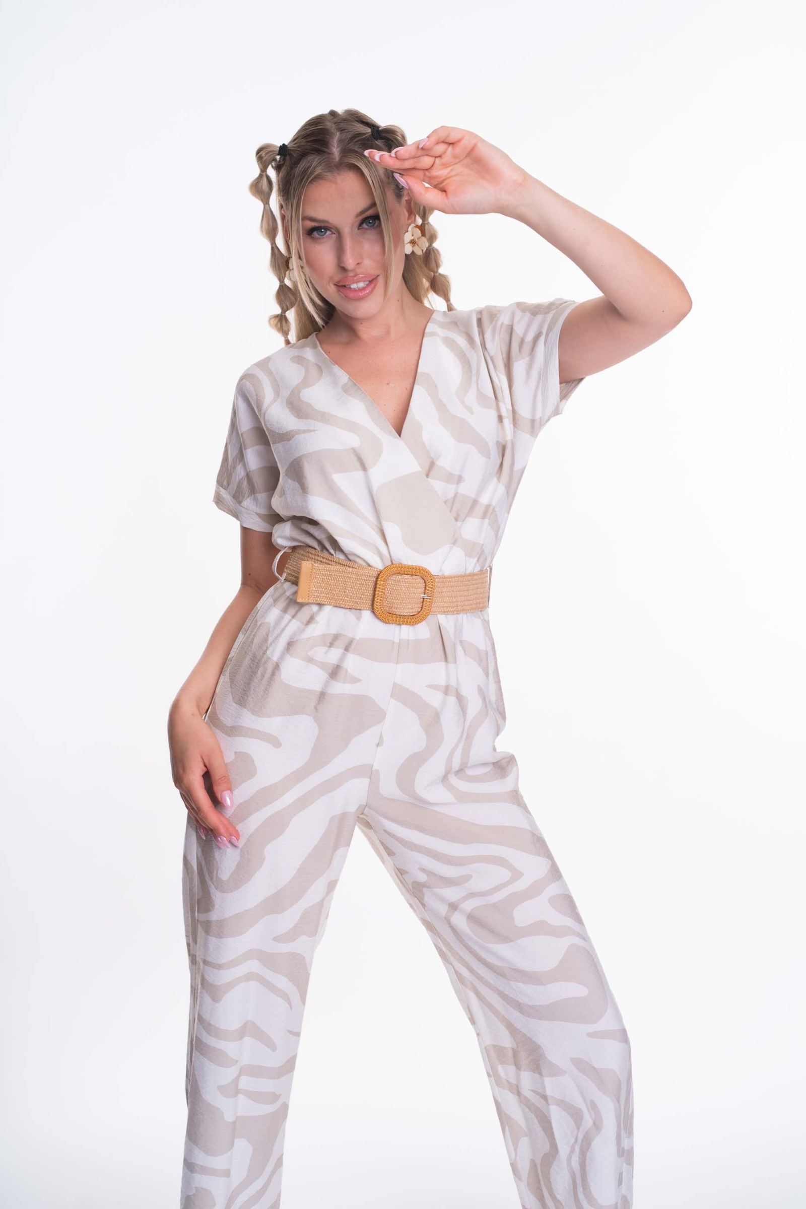 Enyhén elasztikus krepp anyagból készült zsebes overall, gumis derekán öv kiegészítővel, átlapolt mellrész megoldással, kis fém márkajelzéssel.