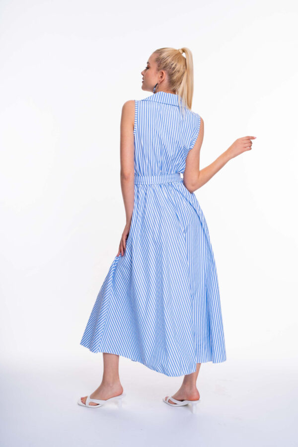 Fix puplinanyagból készült gombos záródású ruha, gumírozott derekán saját anyagából készült megkötővel, gallérján kis fém márkajelzéssel.