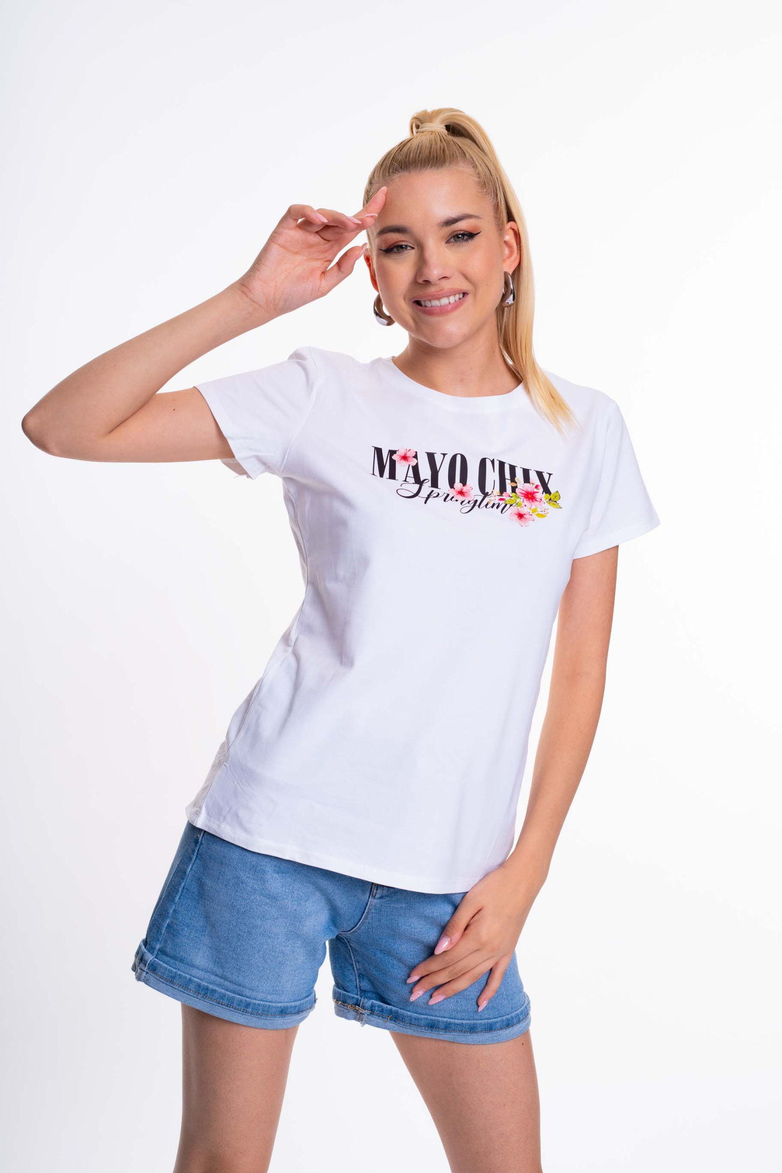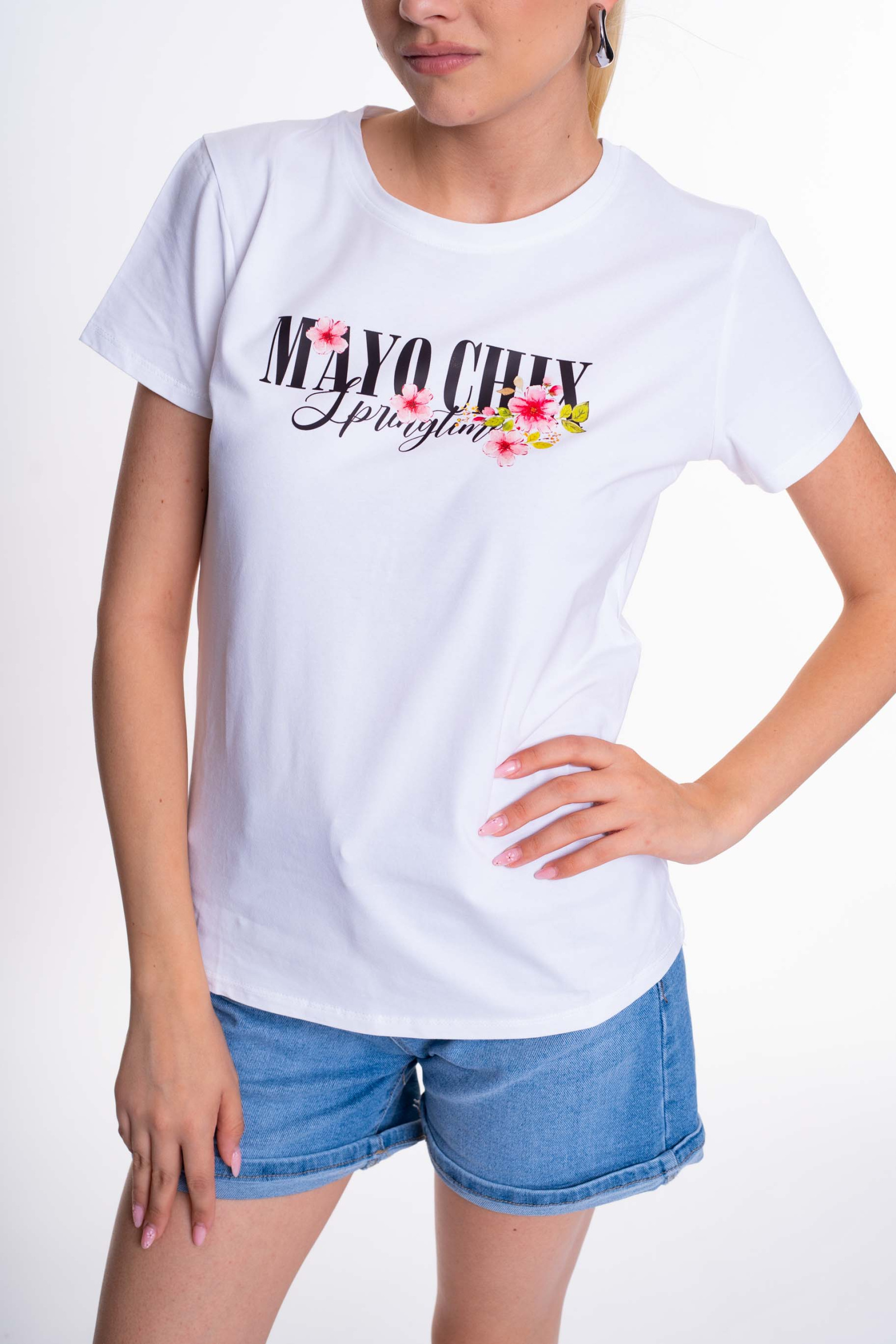 Elasztikus pamut anyagból készült sportos fazonú felső, matrica nyomott díszitéssel.