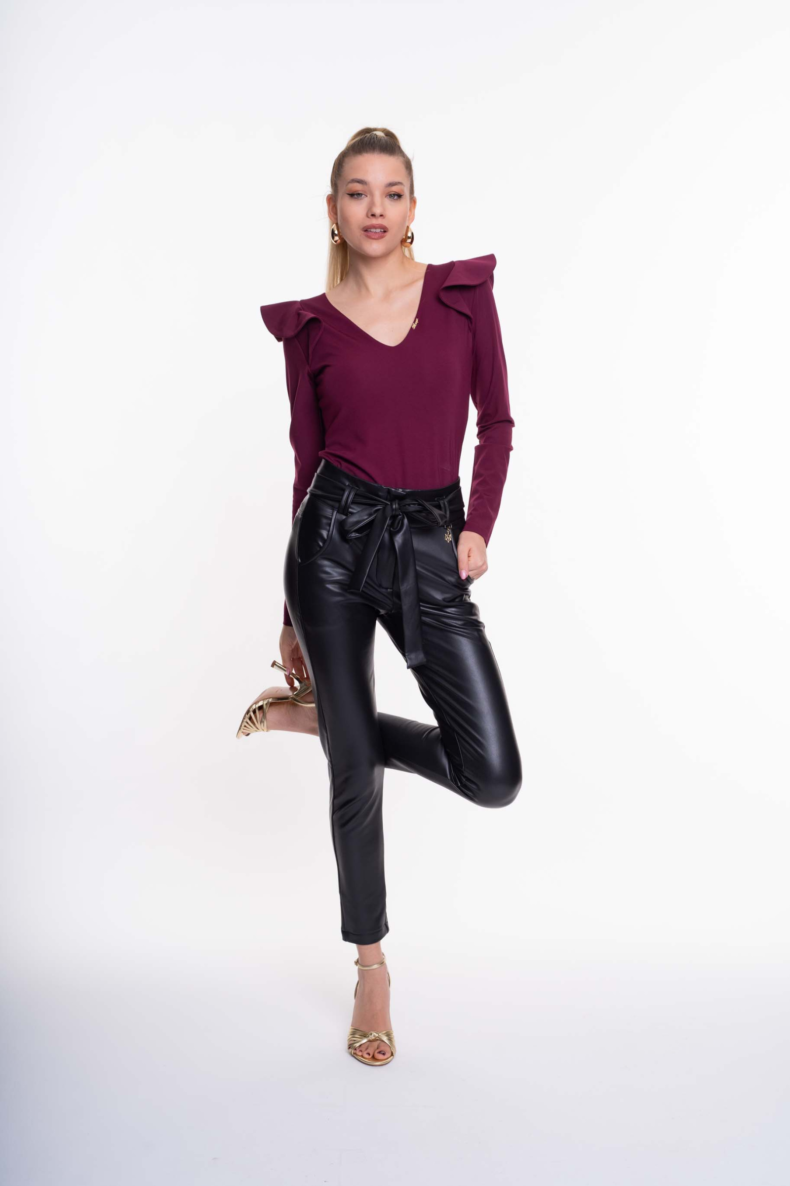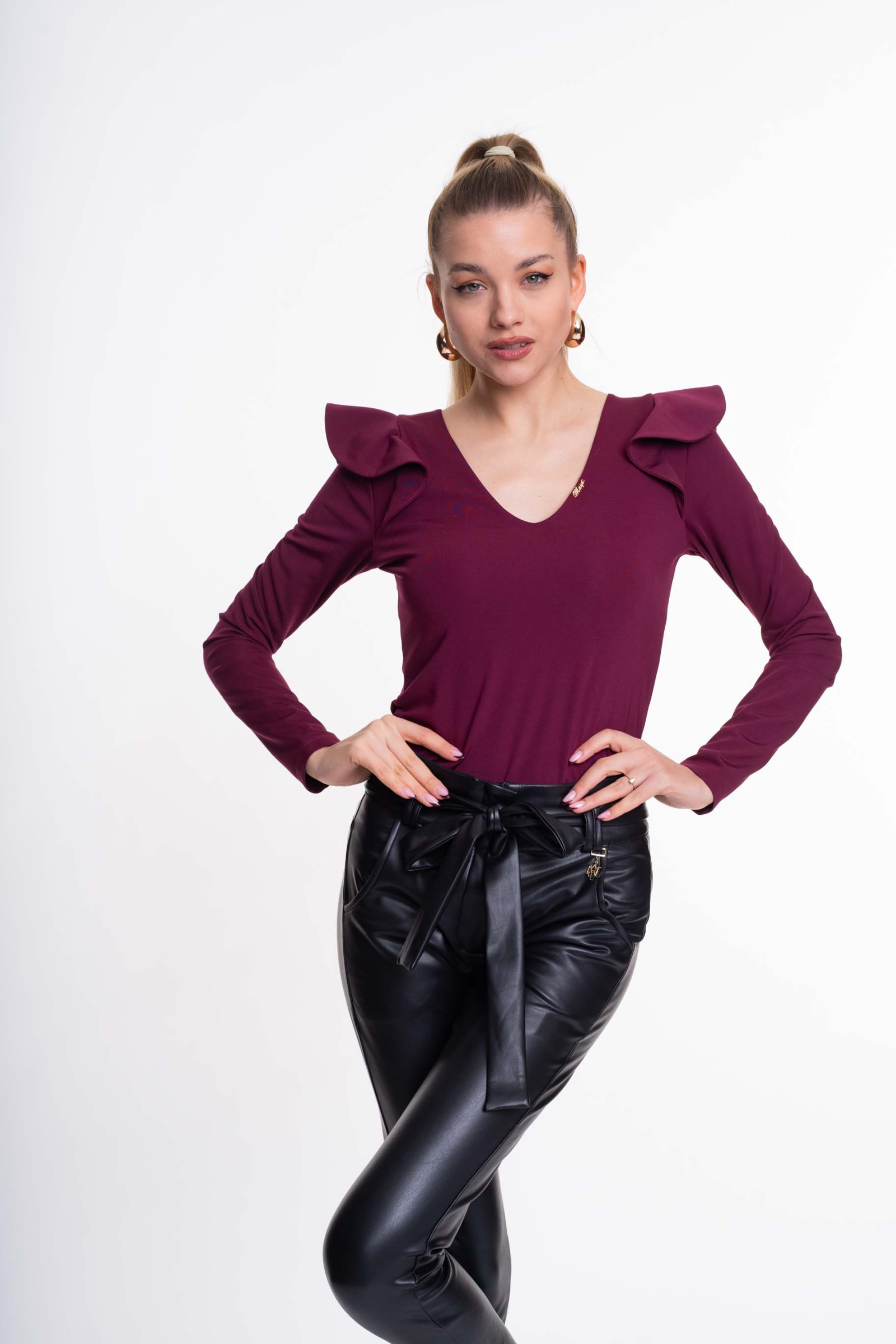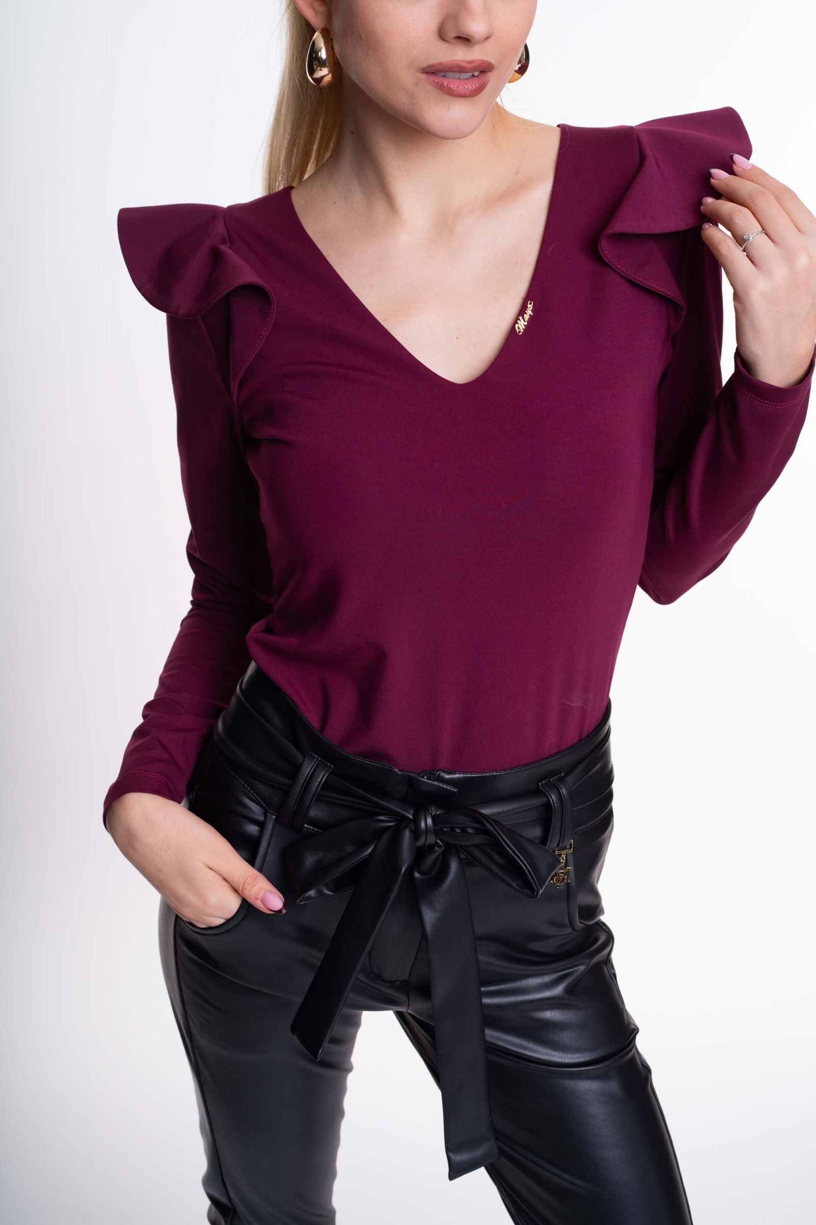 Elasztikus anyagból készül fodros vállú póló, mellrészen bélelővel, kis fém márkajelzéssel.