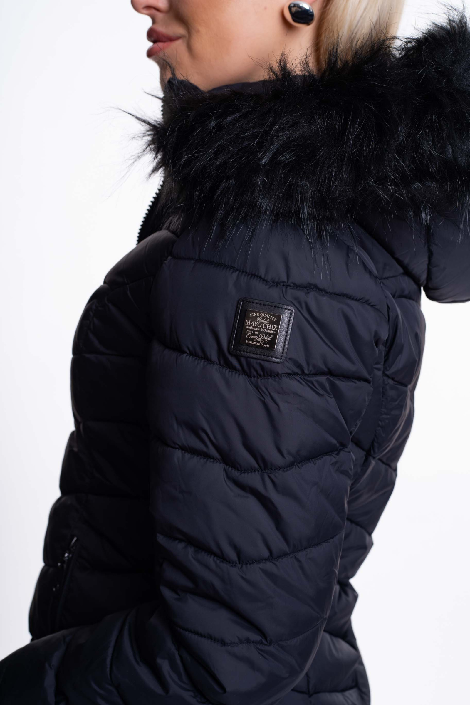 Karcsúsított, rövid fazonú télikabát, legombolható műszőrmével, ujján fém márkajelzéssel.