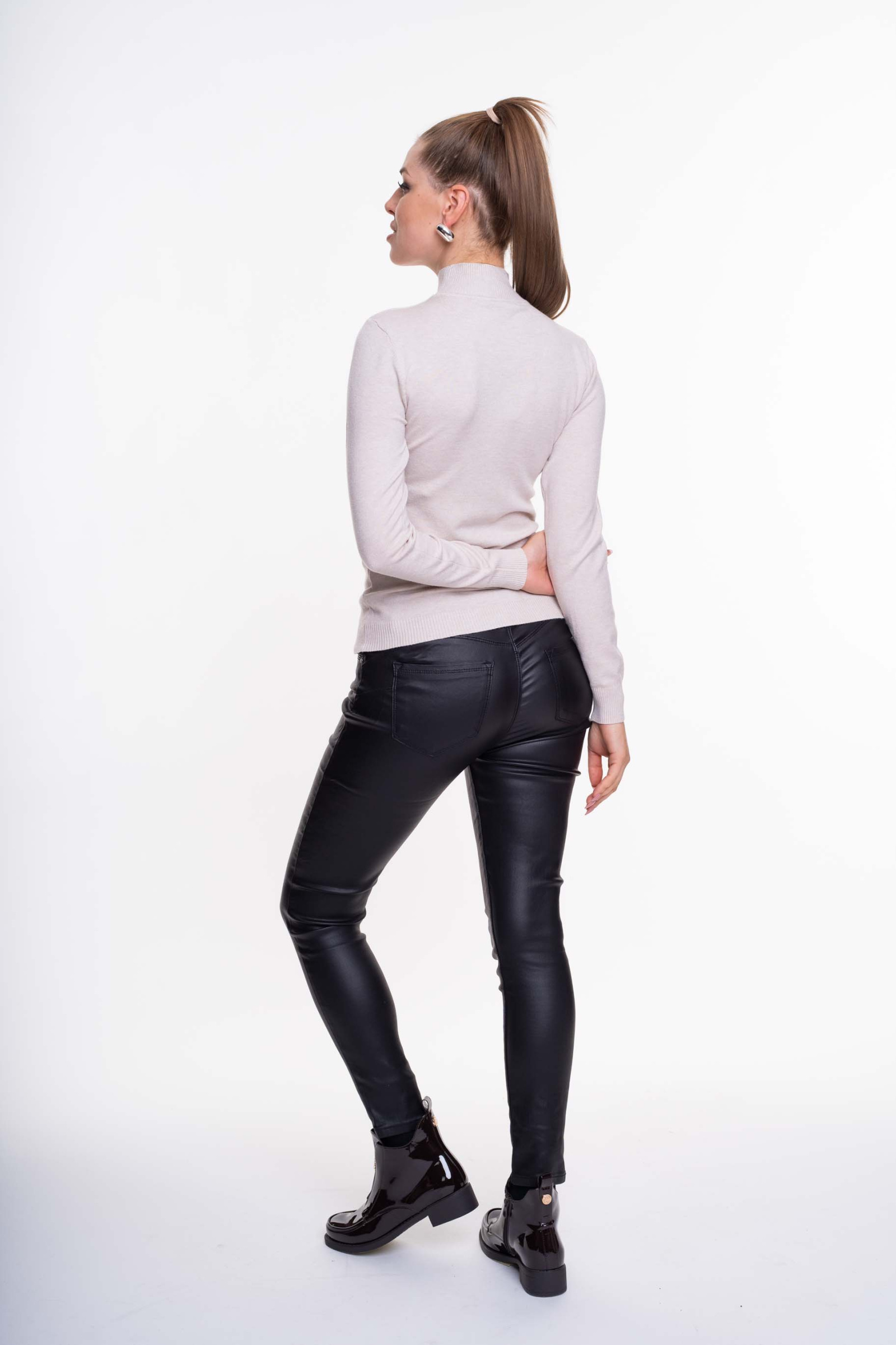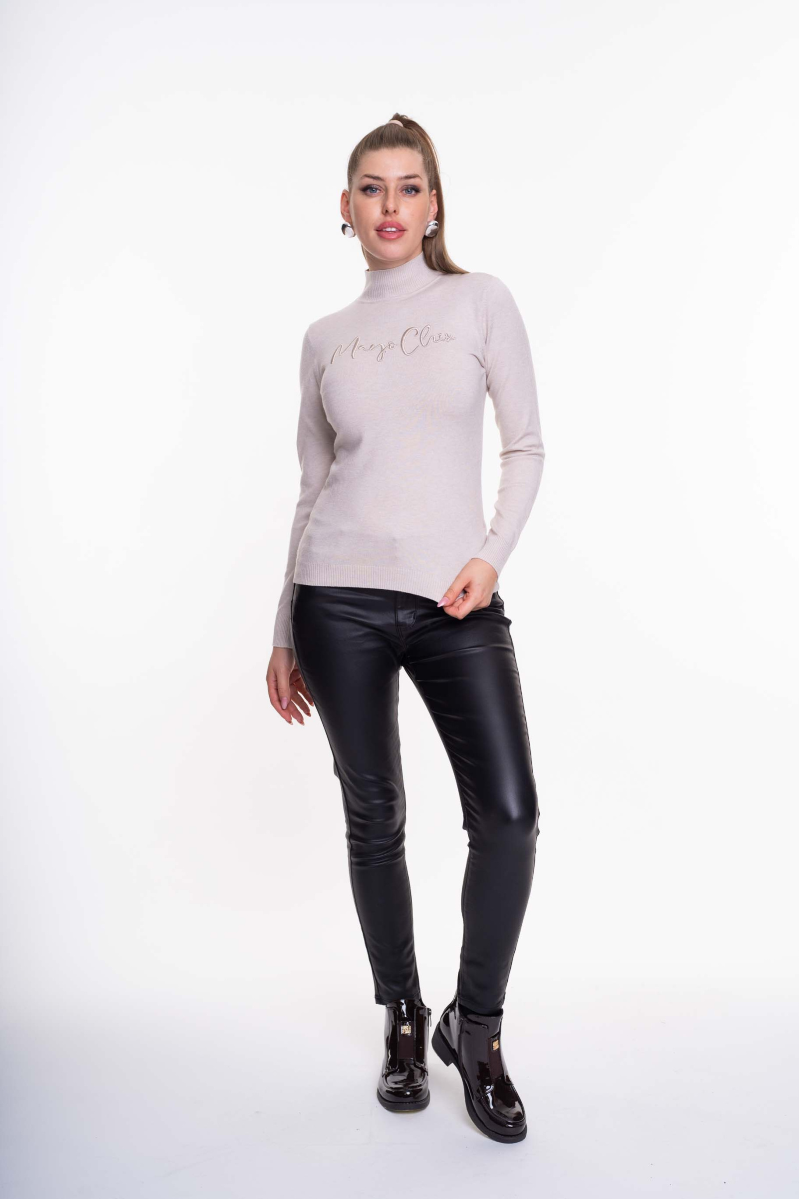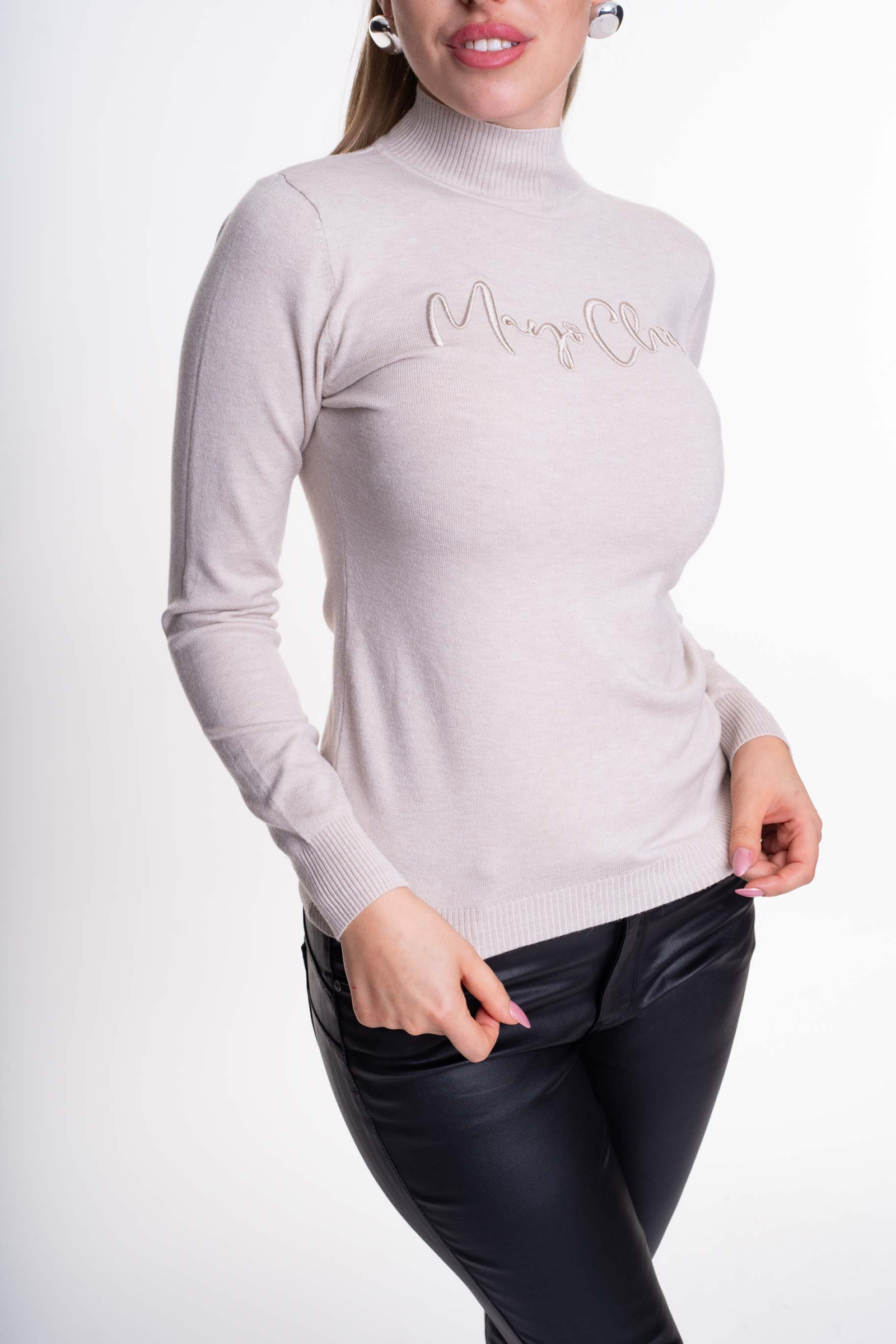 Elasztikus, vékony kötött anyagú, lezser szabásvonalú garbó, hímzett díszítéssel.