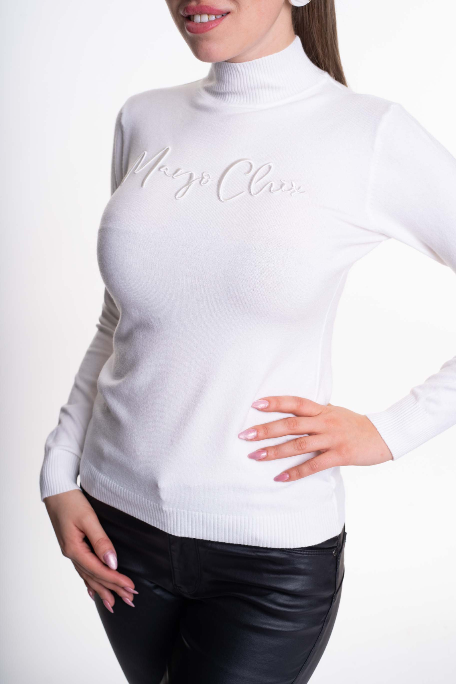 Elasztikus, vékony kötött anyagú, lezser szabásvonalú garbó, hímzett díszítéssel.