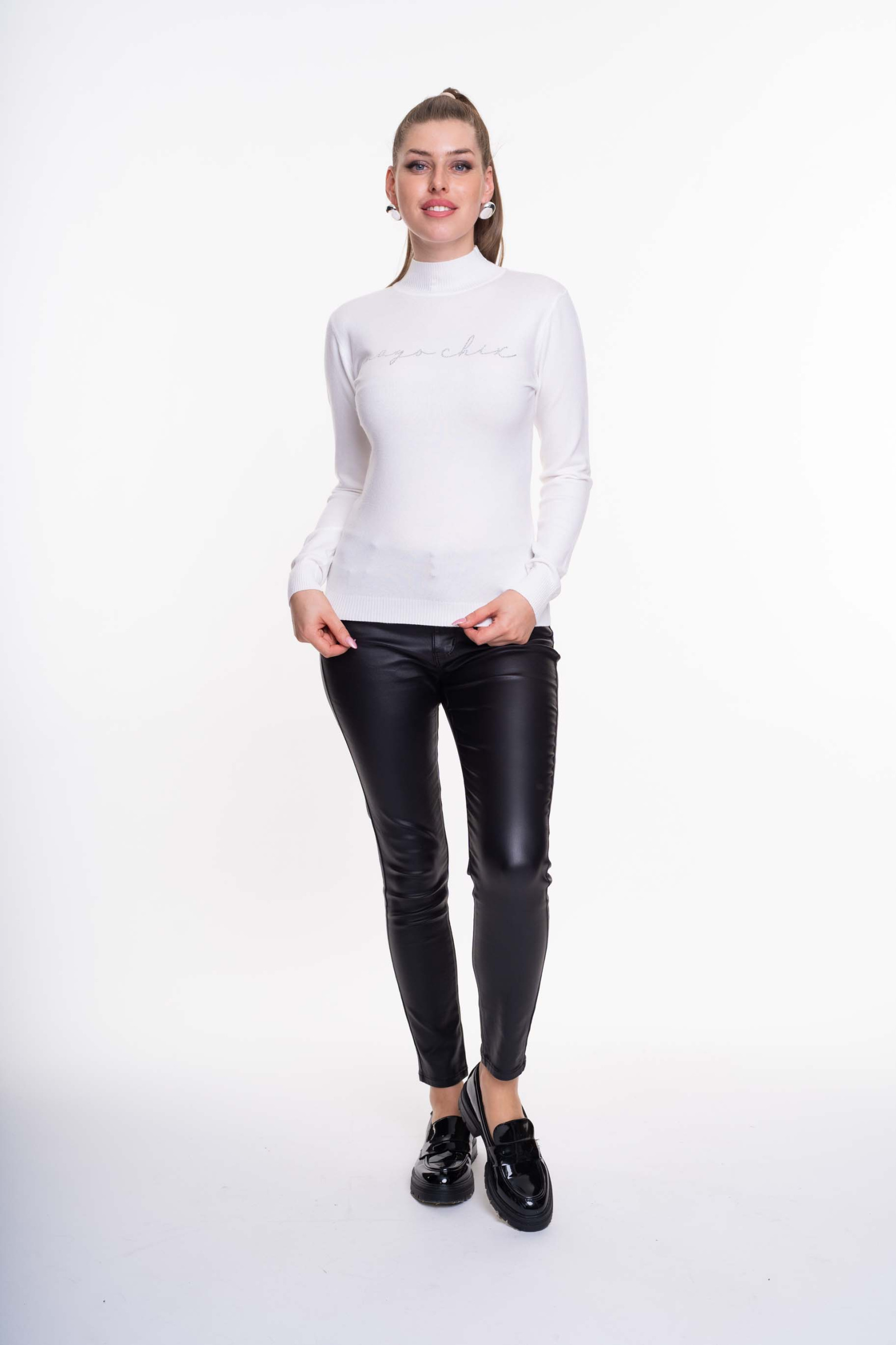 Elasztikus, vékony kötött anyagú, lezser szabásvonalú garbó, strasszköves díszítéssel.