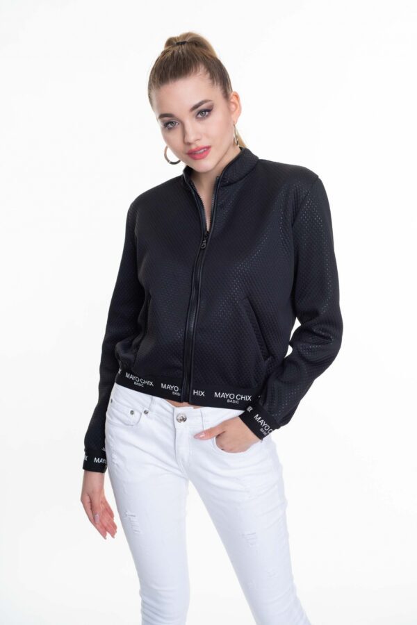Enyhén rugalmas, texturált felületű anyagból készült cipzáras záródású blézer, film nyomott gumipasszékkal.
