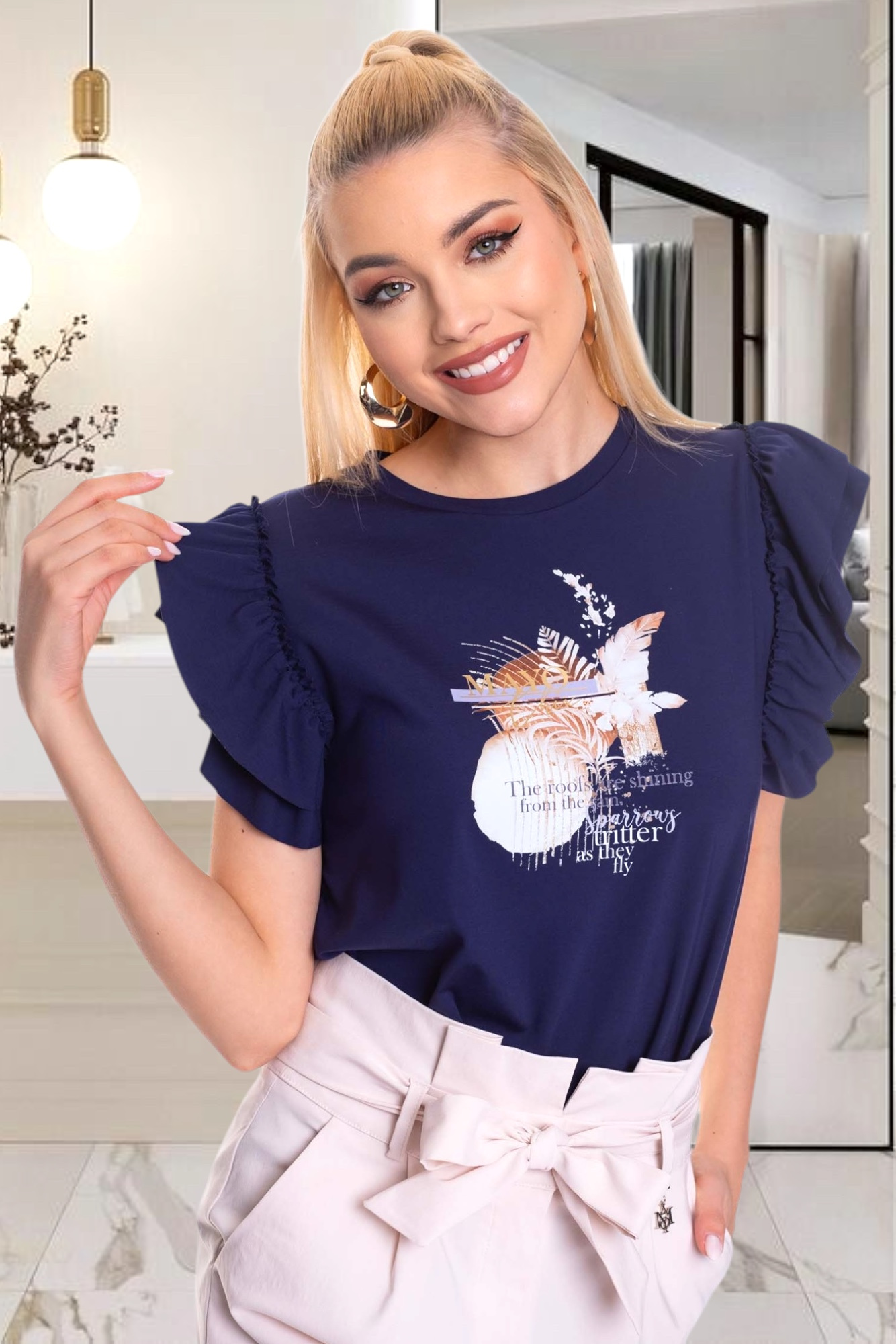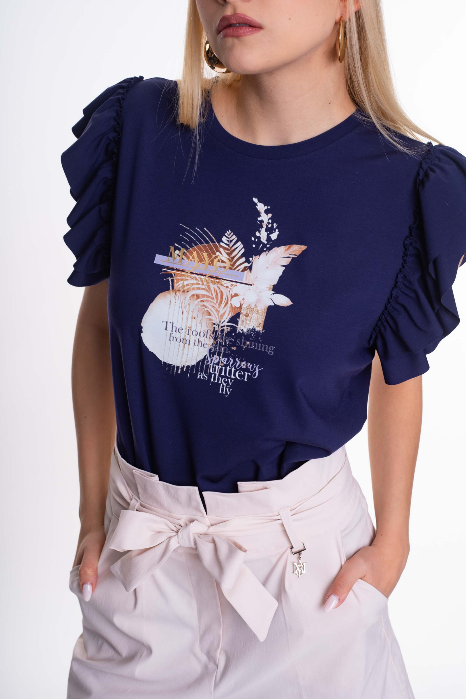 Elasztikus anyagból készült, fodros vállú póló lezser szabásvonallal, matrica nyomott mintával díszítve.