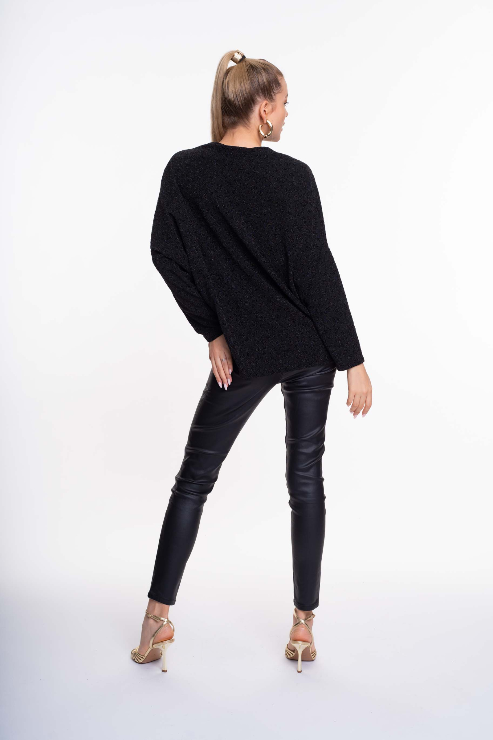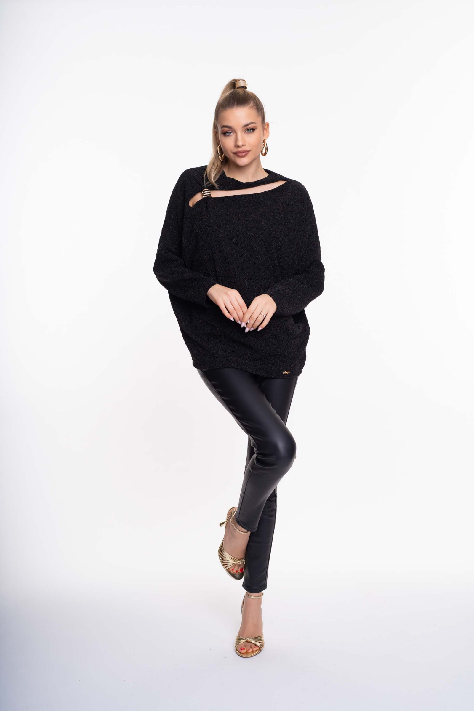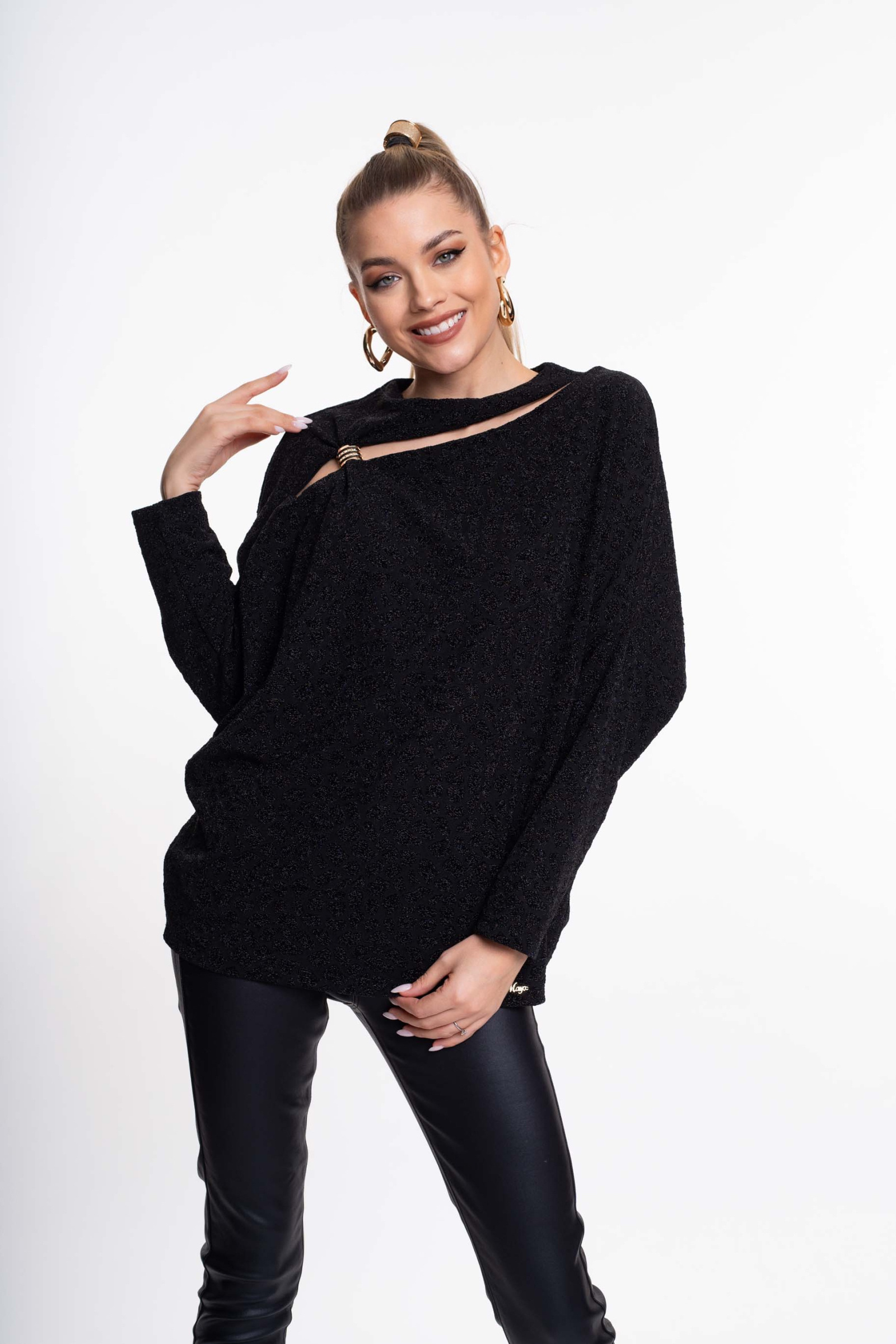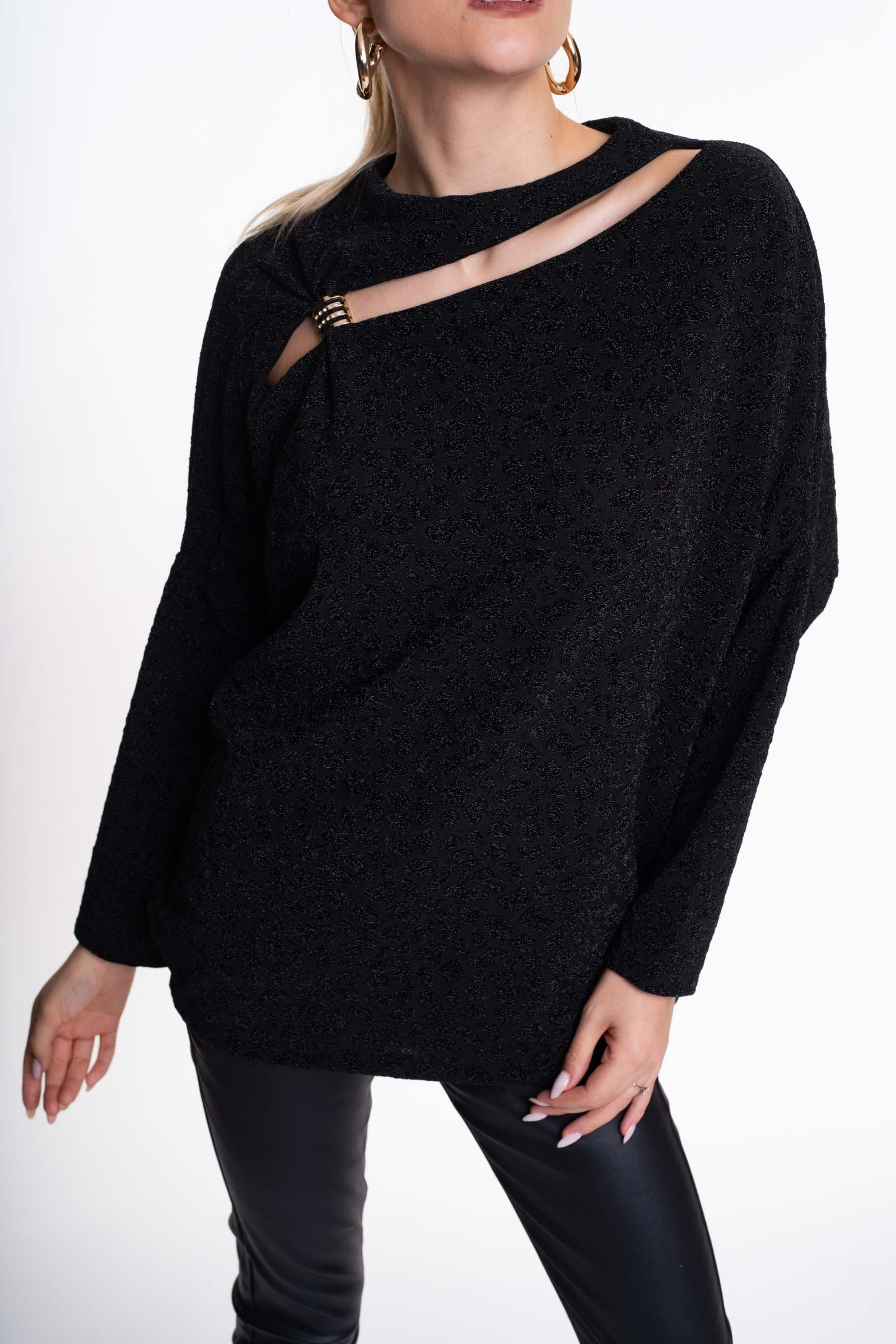 Elasztikus, lurexes anyagból készült lezser szabású tunika kivágott mellrésszel, fém díszítéssel.