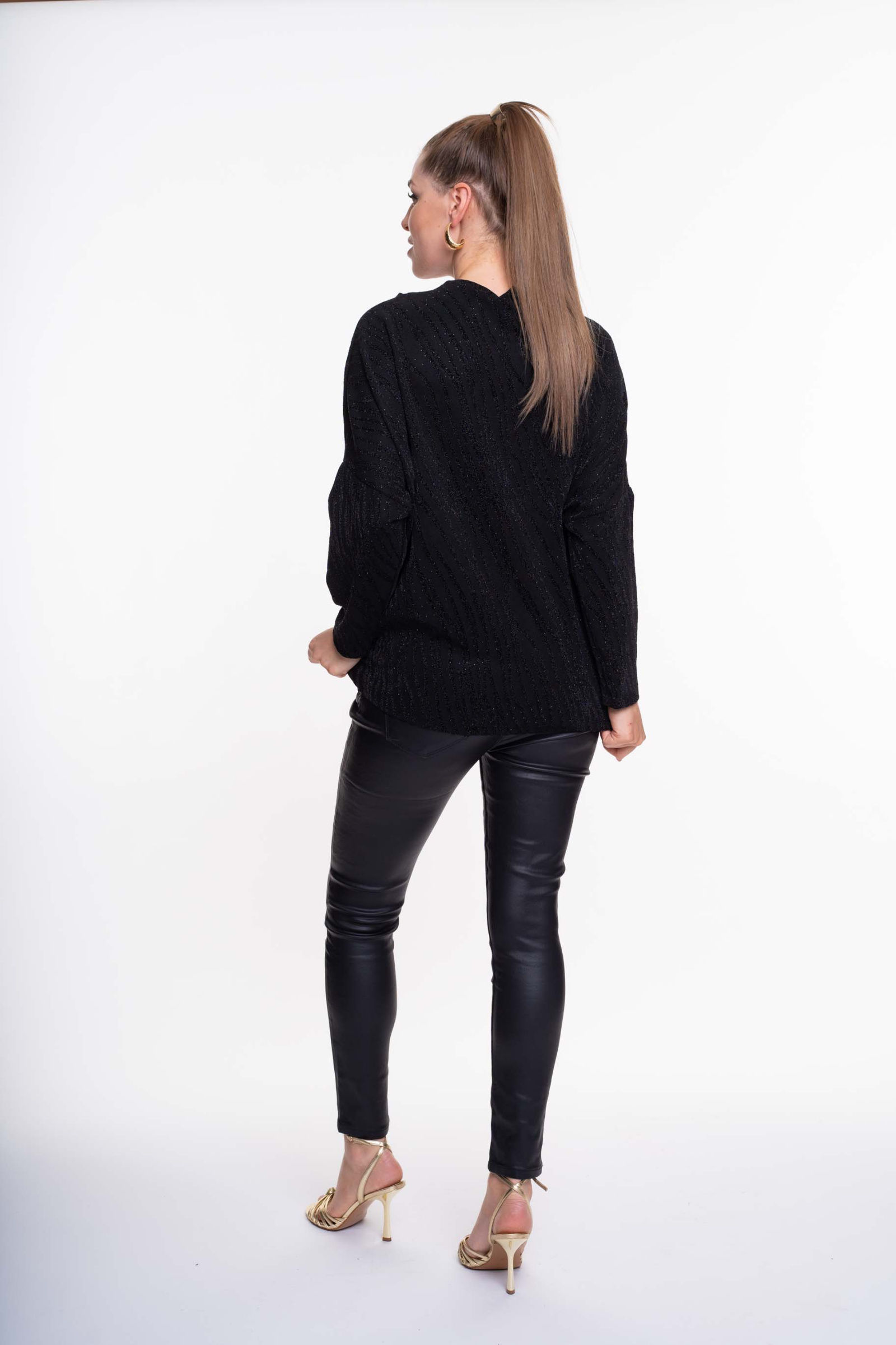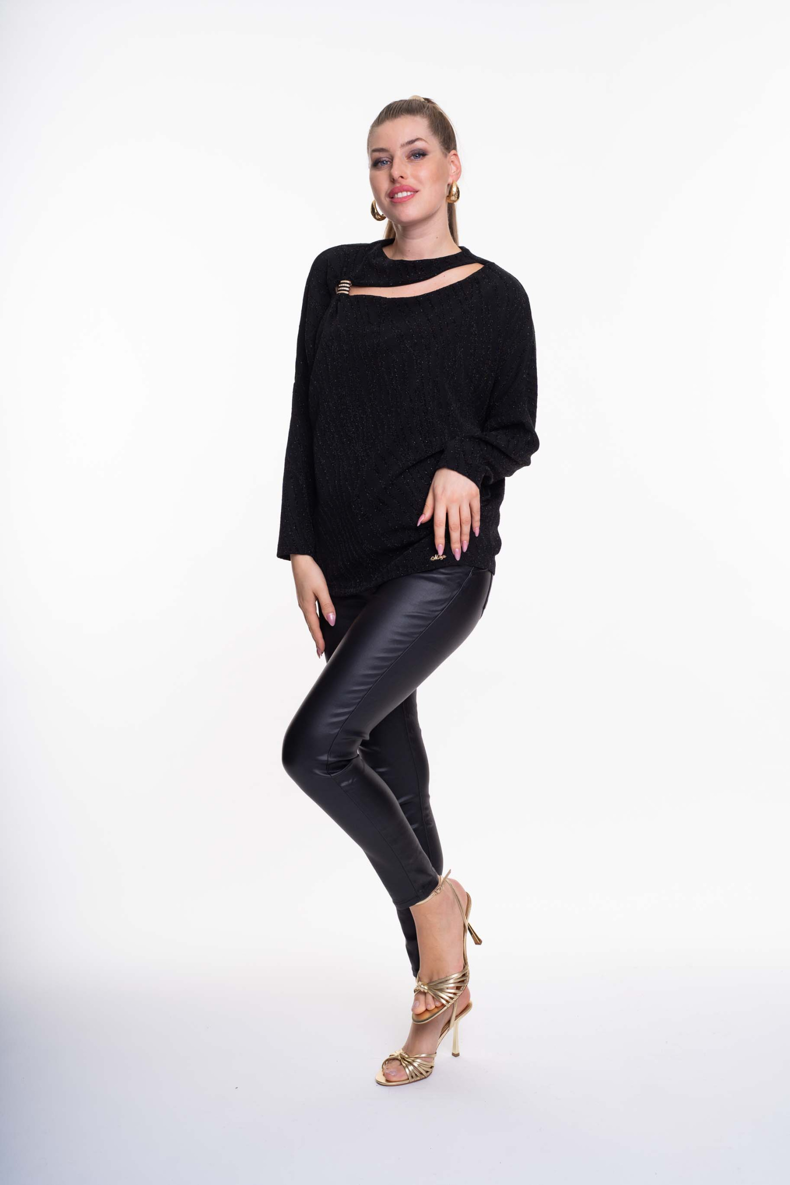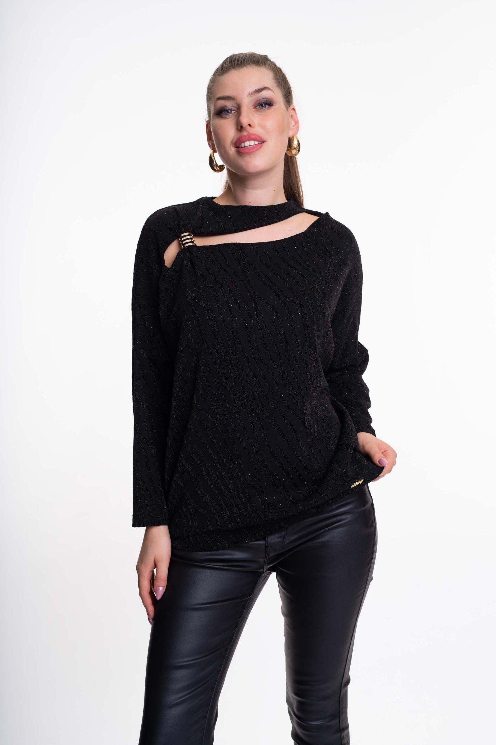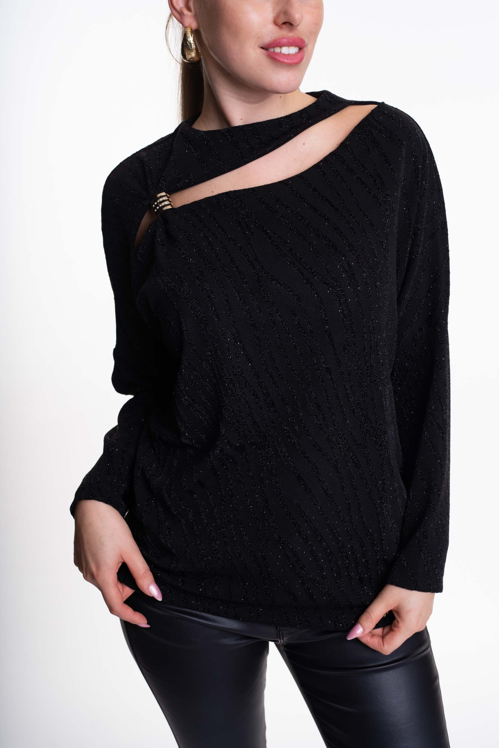Elasztikus, lurexes anyagból készült lezser szabású tunika kivágott mellrésszel, fém díszítéssel.