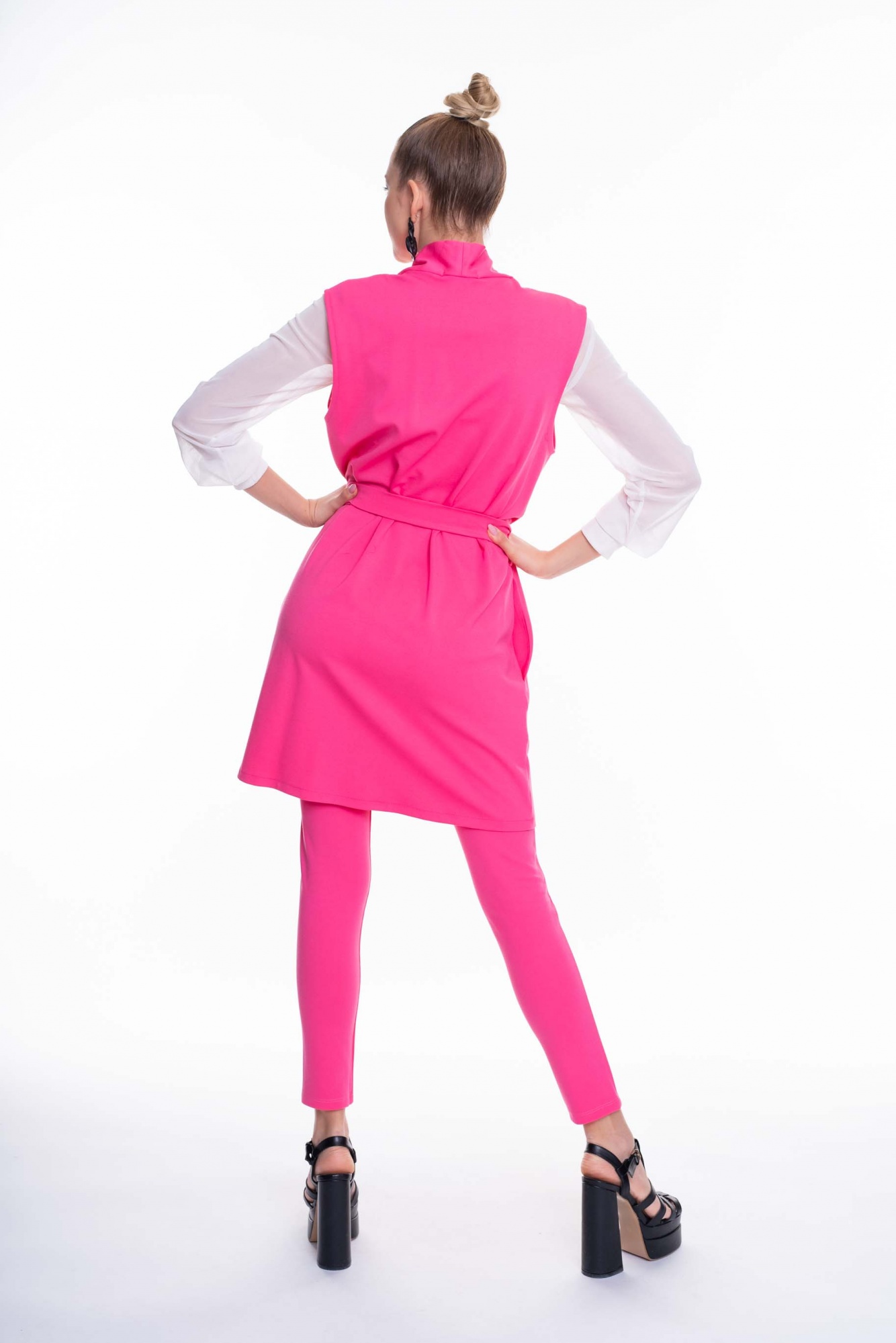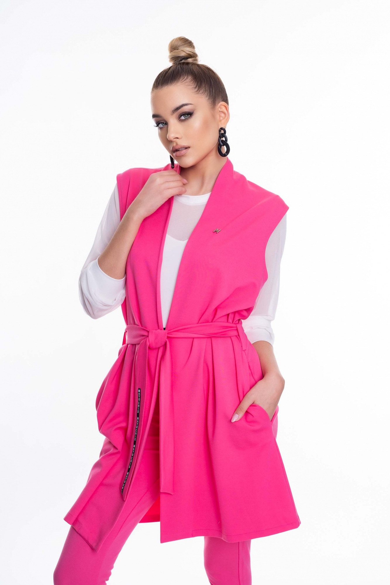 Lezser szabásvonalú mellény, saját anyagából készült film nyomott megkötővel, zsebekkel, bross márkajelzéssel.
