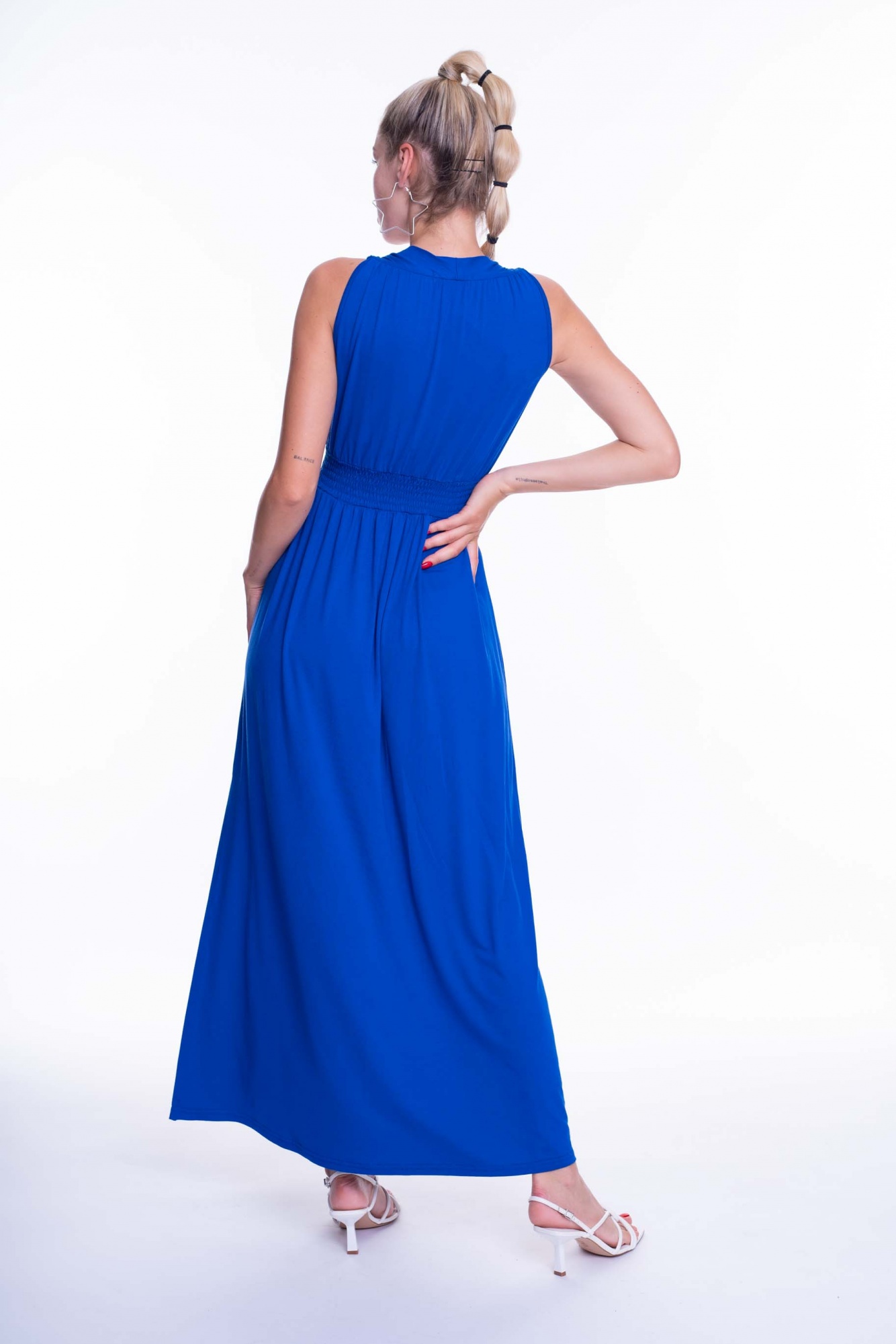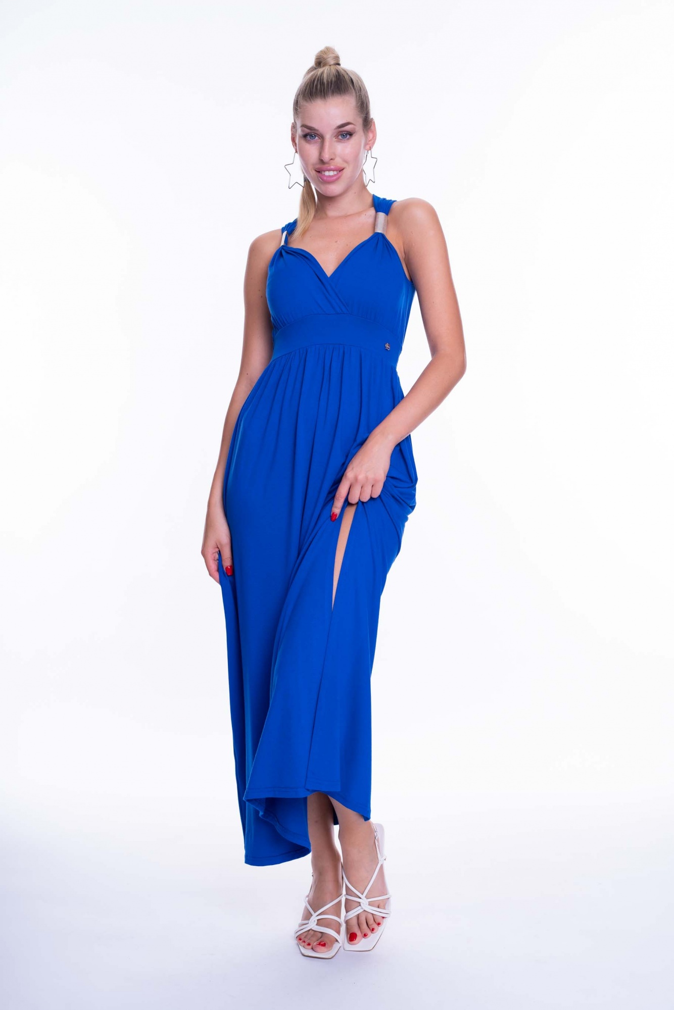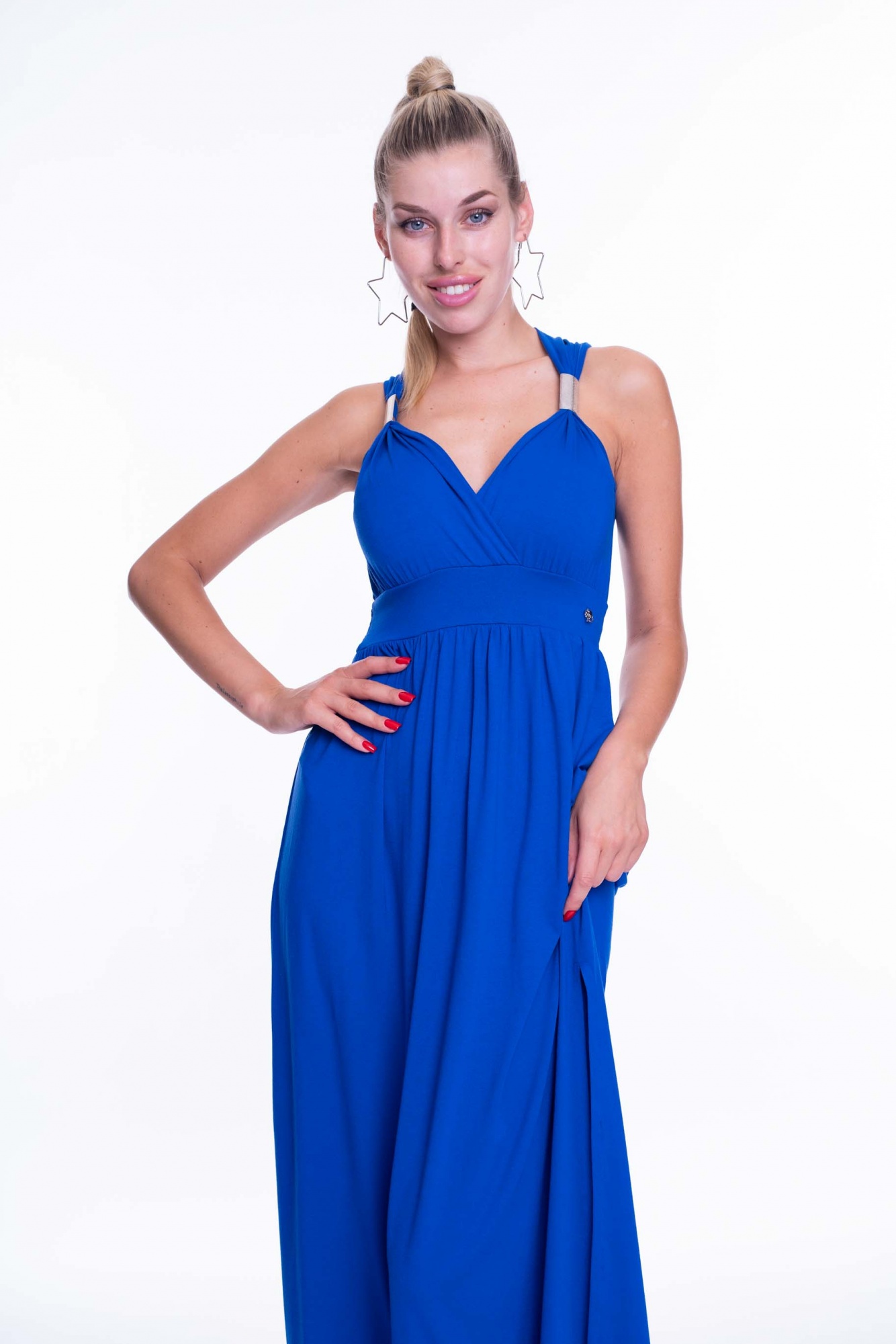 Elasztikus pamut hatású anyagból készült ruha, gumírozott derékrésszel, átlapolt mellrésszel, fém kiegészítővel, kis fém márkajelzéssel.