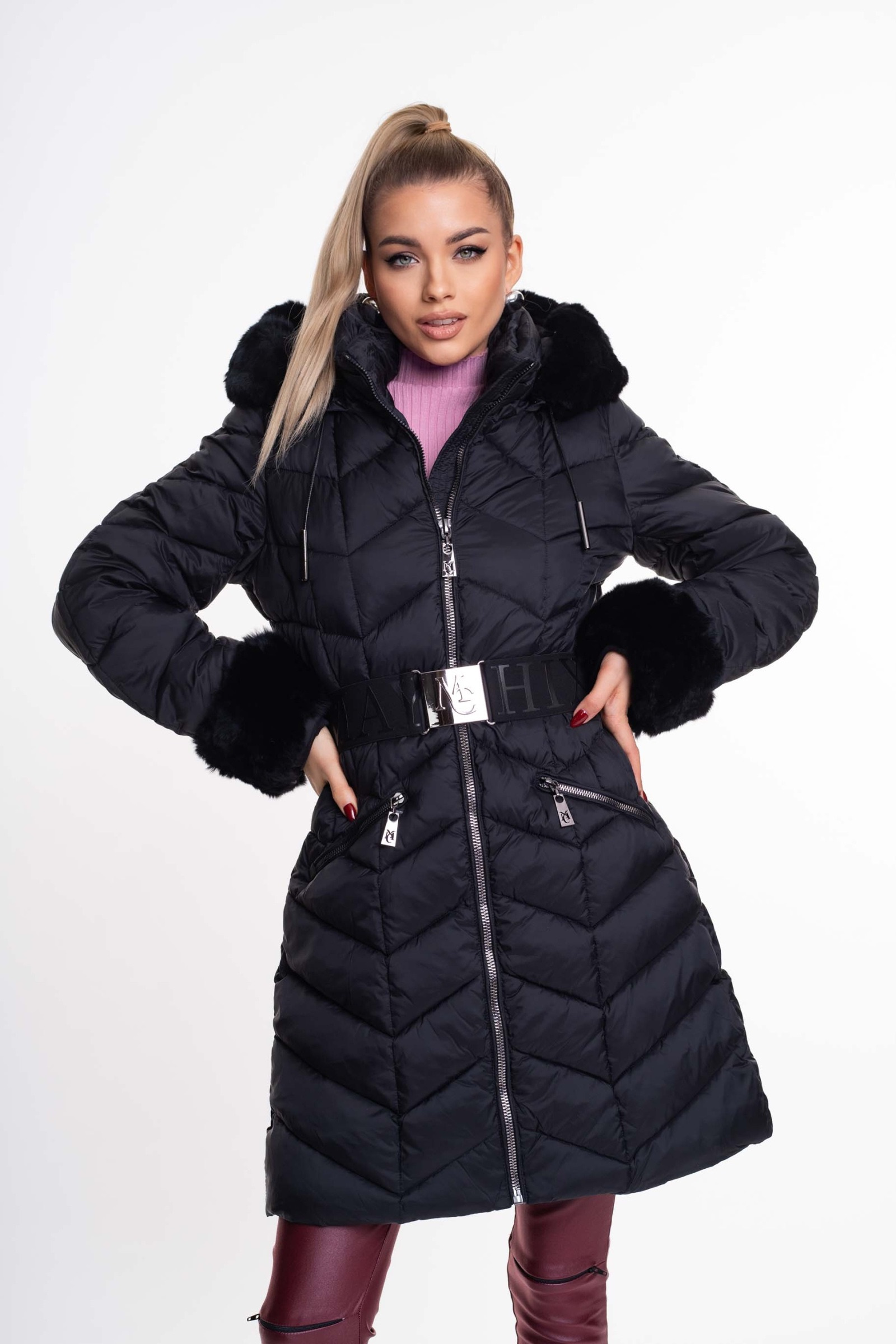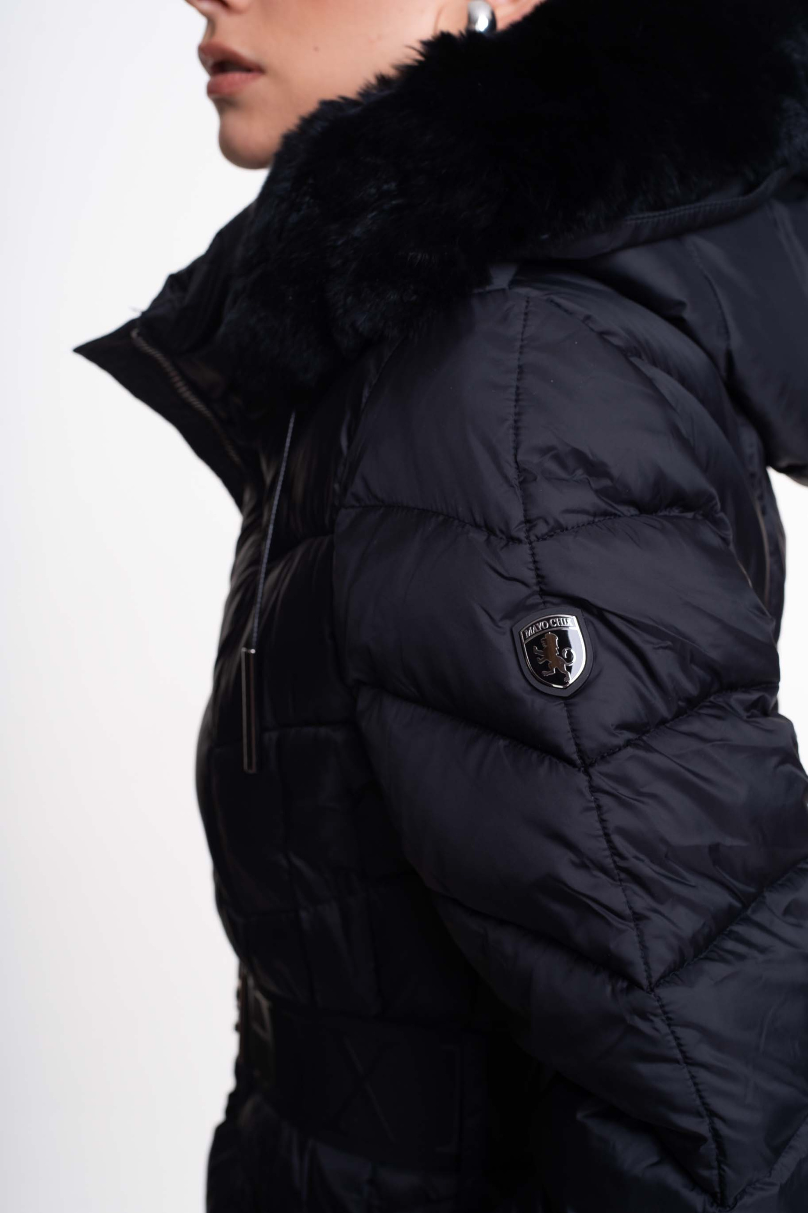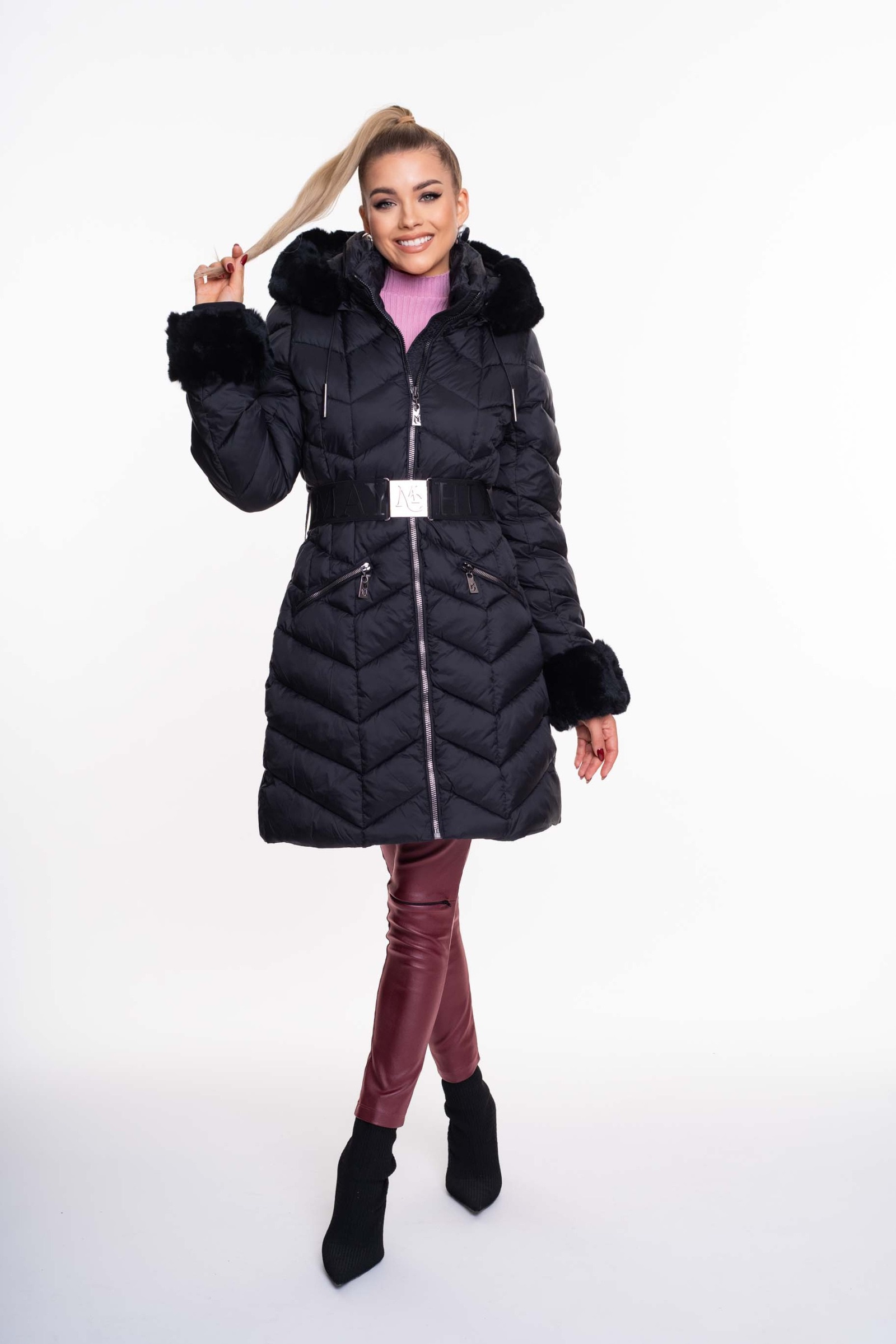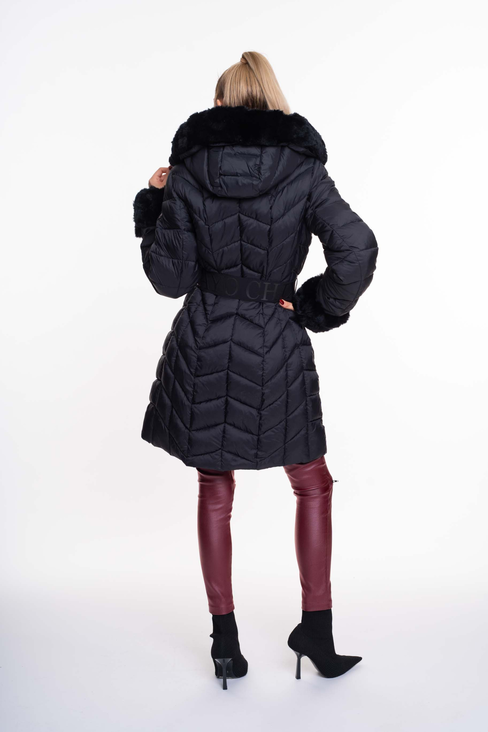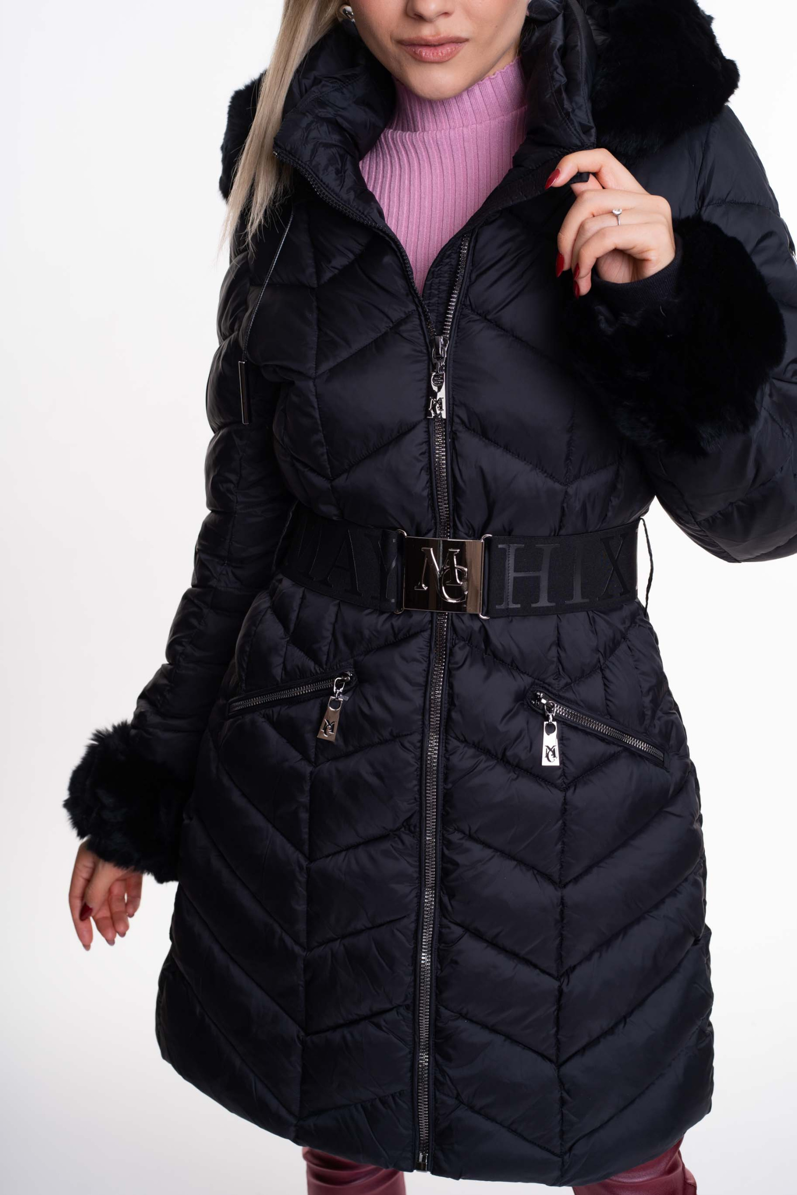 Karcsúsított fazonú steppelt kabát lecippzárazható kapucnival, kapucnin és ujján legombolható szőrmével, fém márkajelzéssel, gumiöv kiegészítővel.