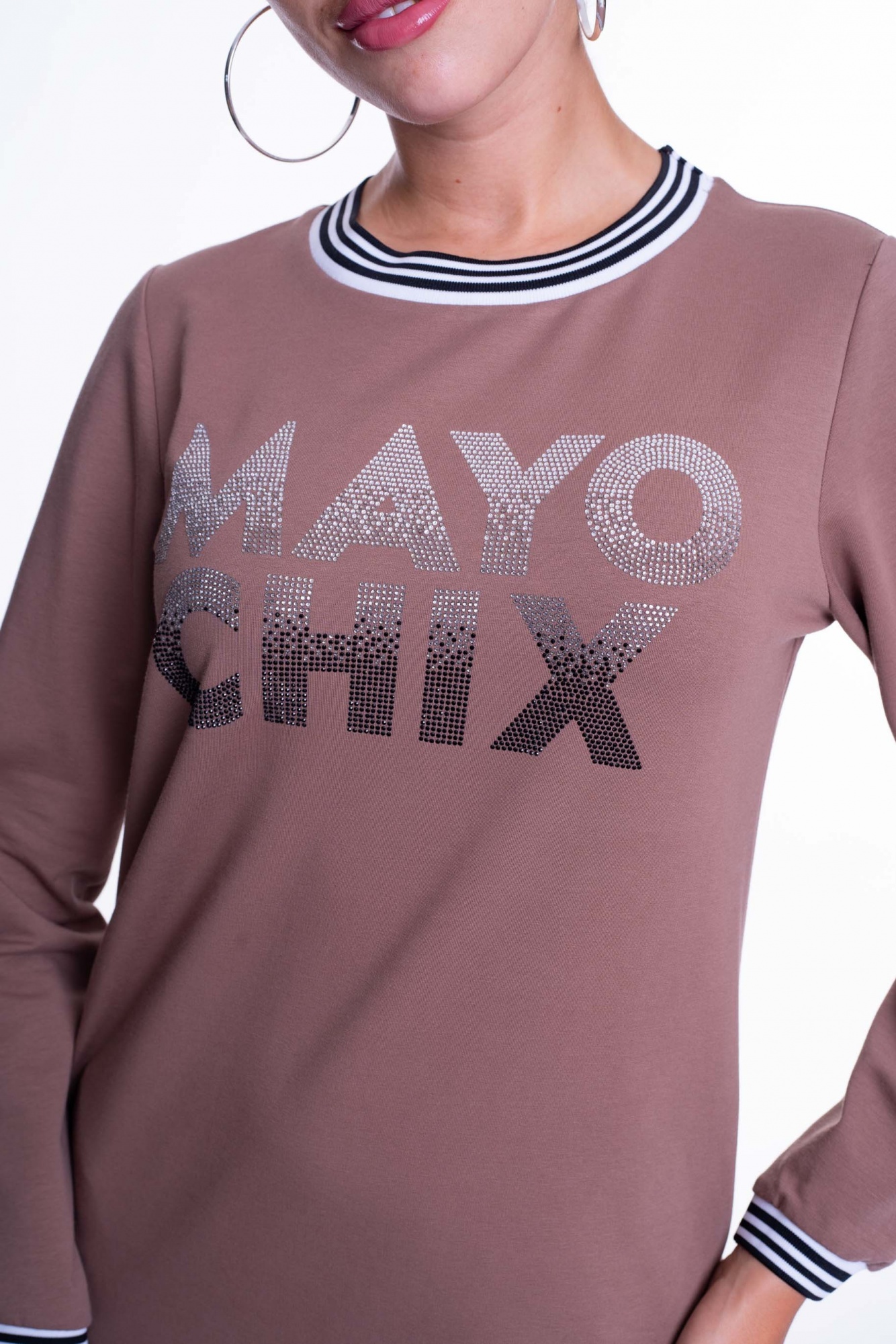 Elasztikus anyagból készült zsebes ruha, strasszköves díszitéssel.