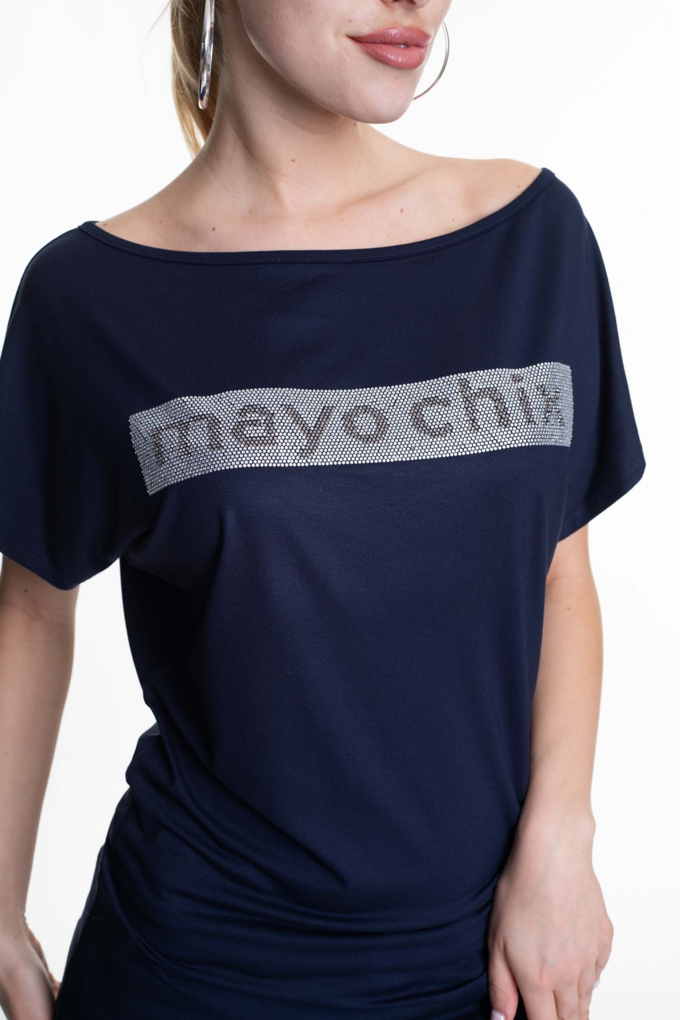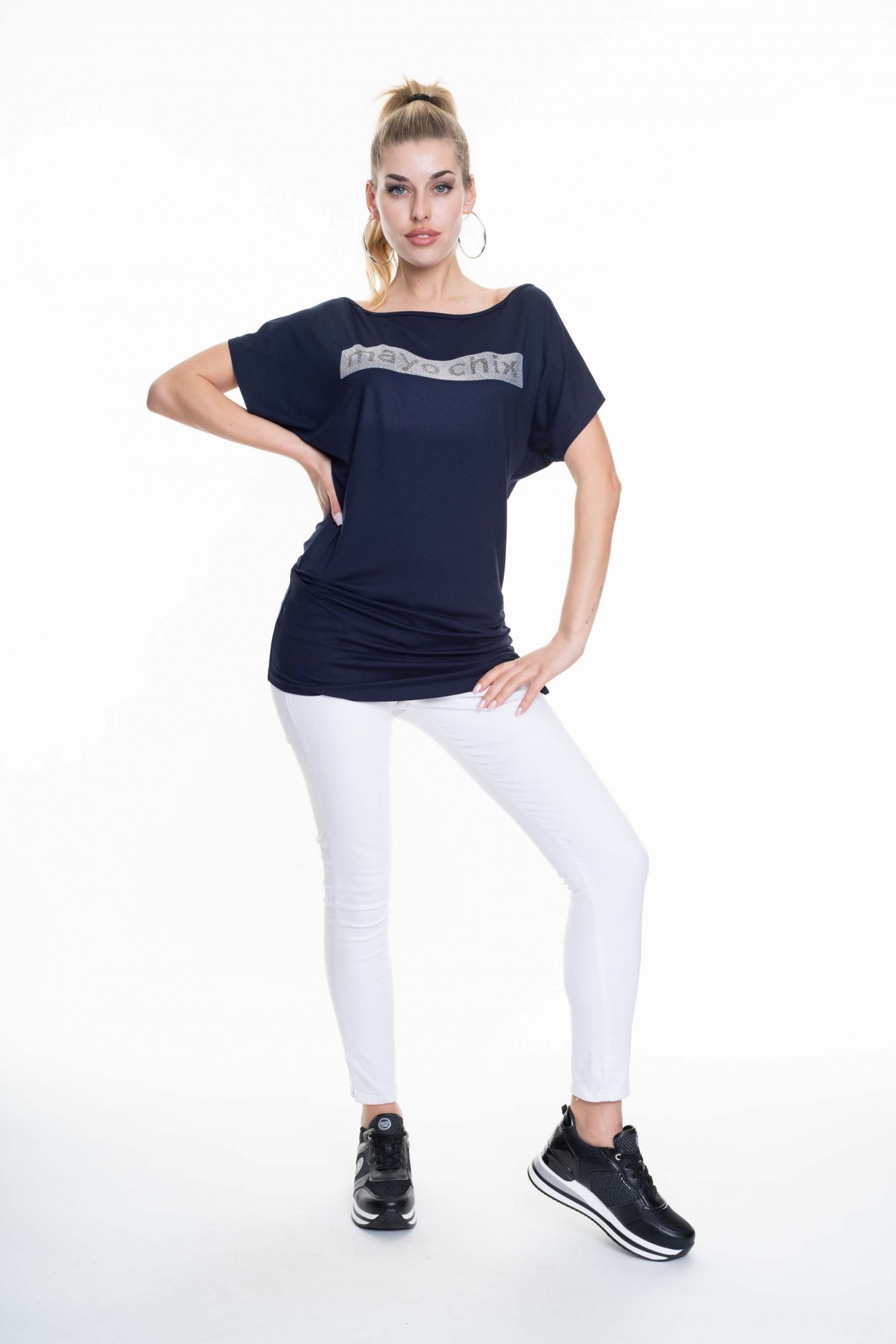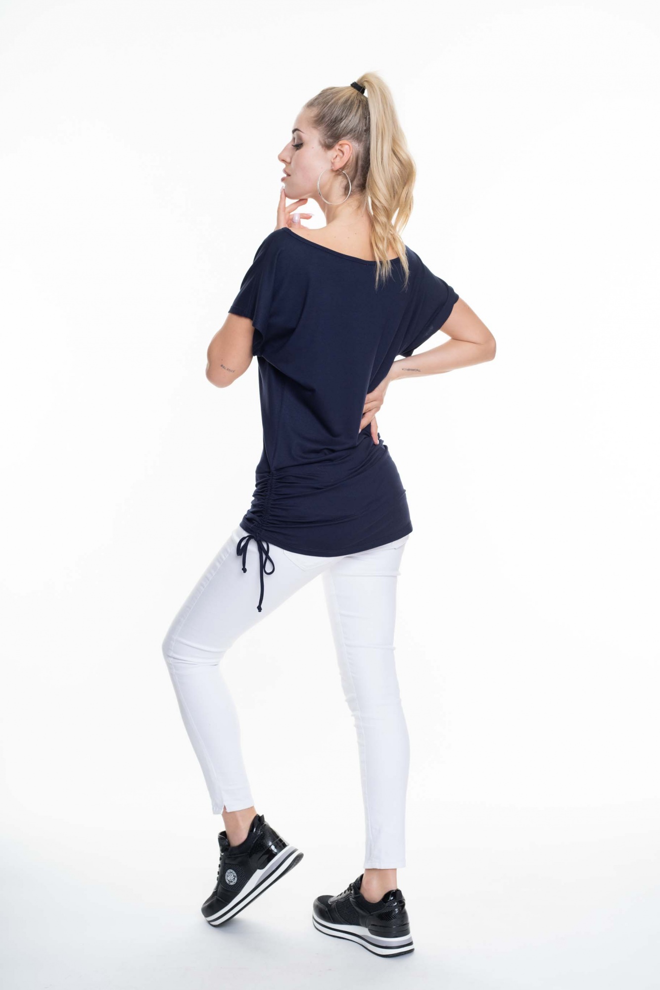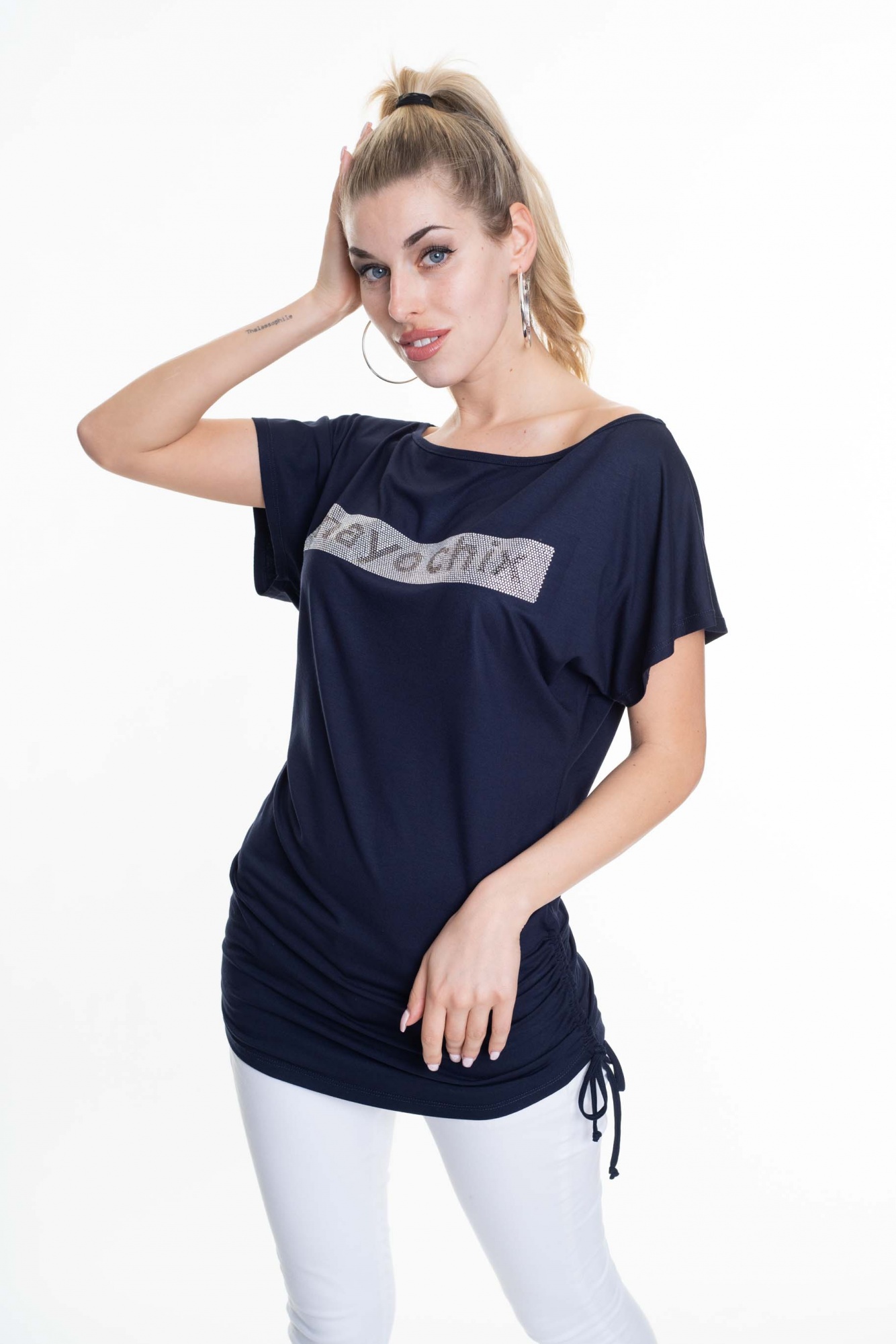 Elasztikus anyagból készült lezser szabású tunika alján behúzóval, strasszköves díszítésssel.