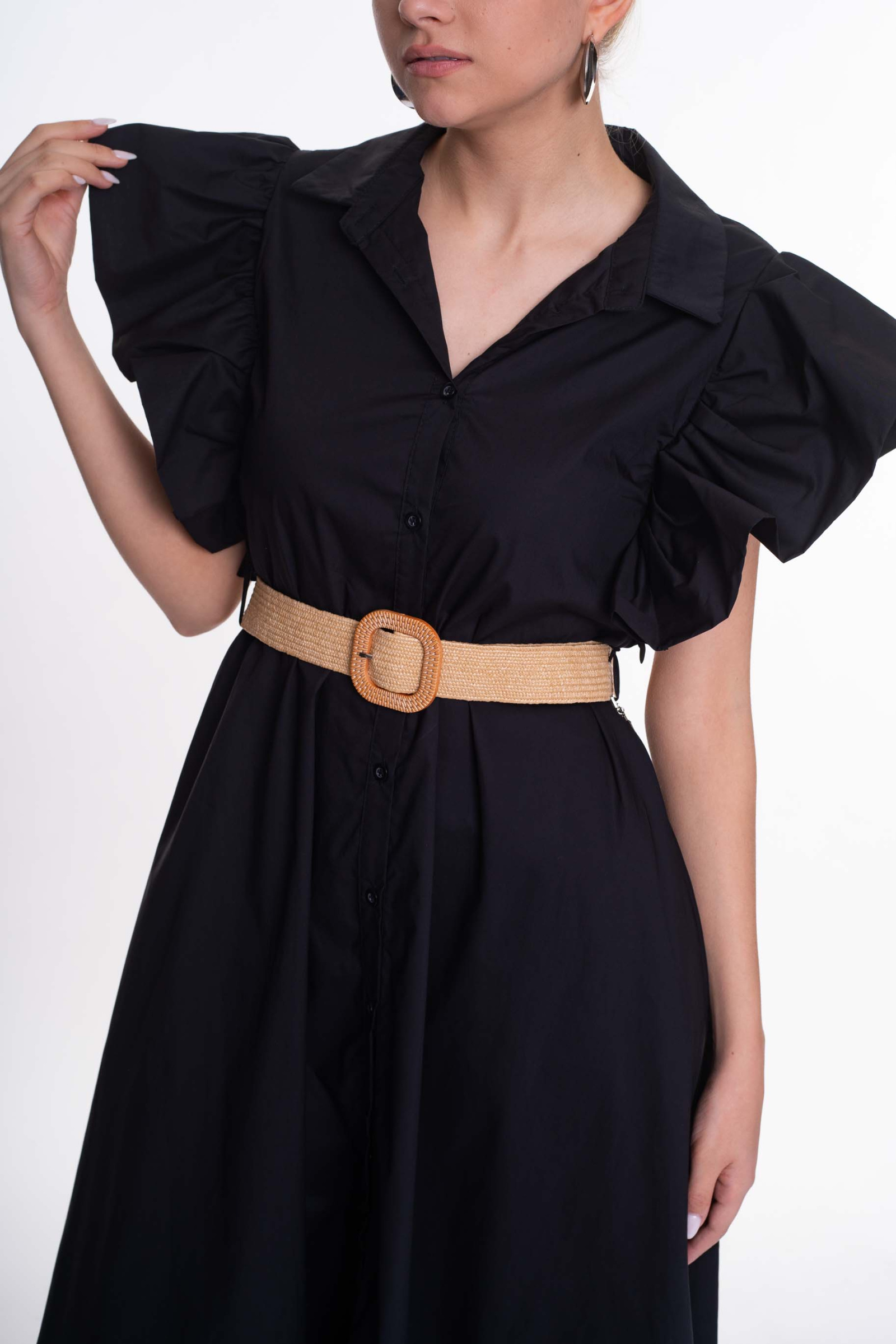 Fix puplin anyagból készült „A” vonalú ruha, gombos záródással, öv kiegészítővel, mosáshoz levehető kis fém márkajelzéssel.