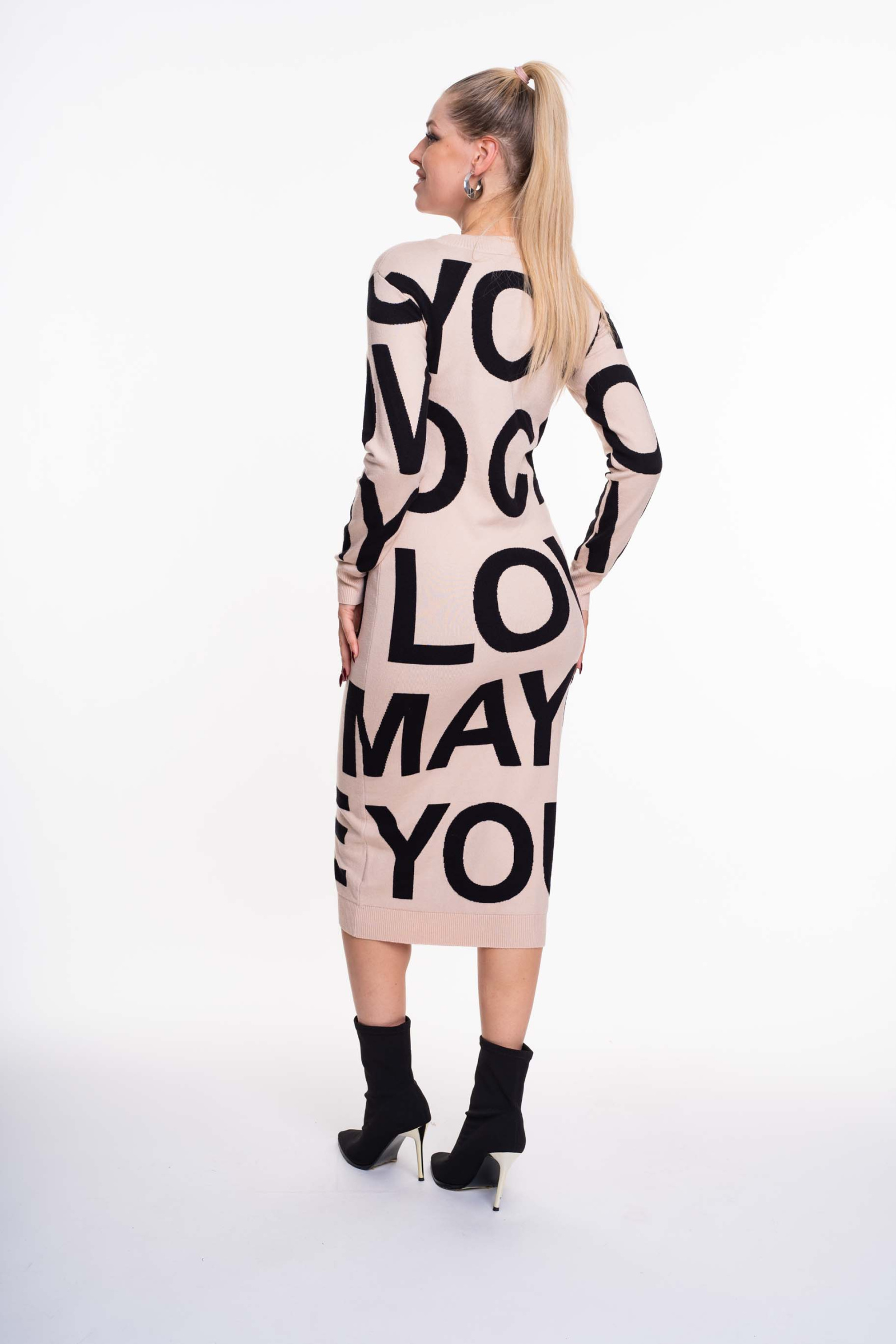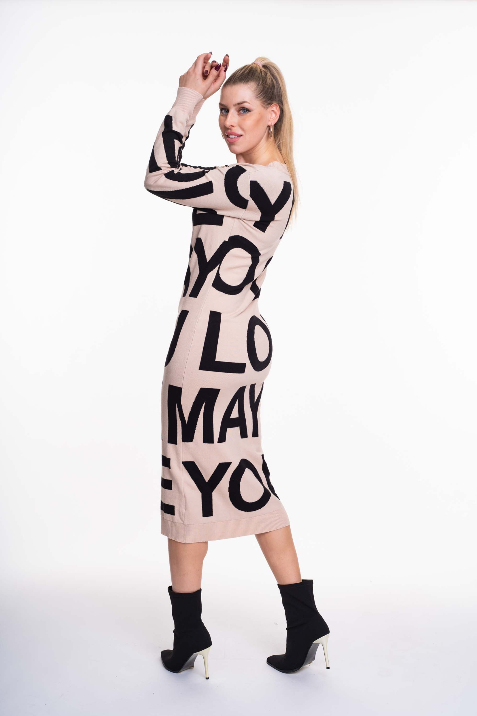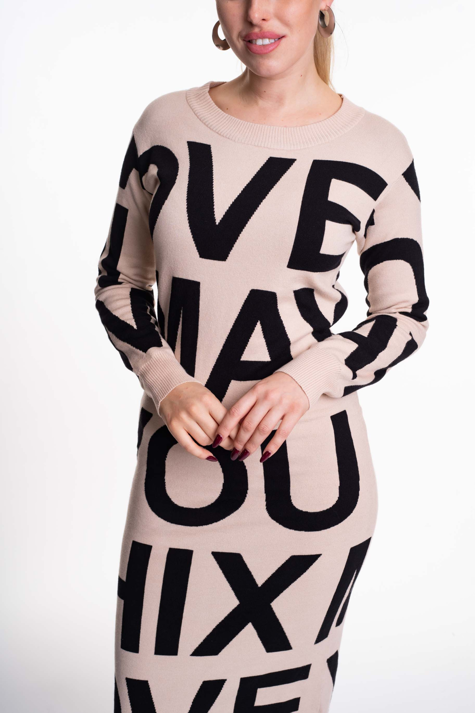 Puha, kötött anyagból készült hosszított fazonú ruha, anyagában kötött márka jelzett mintával.