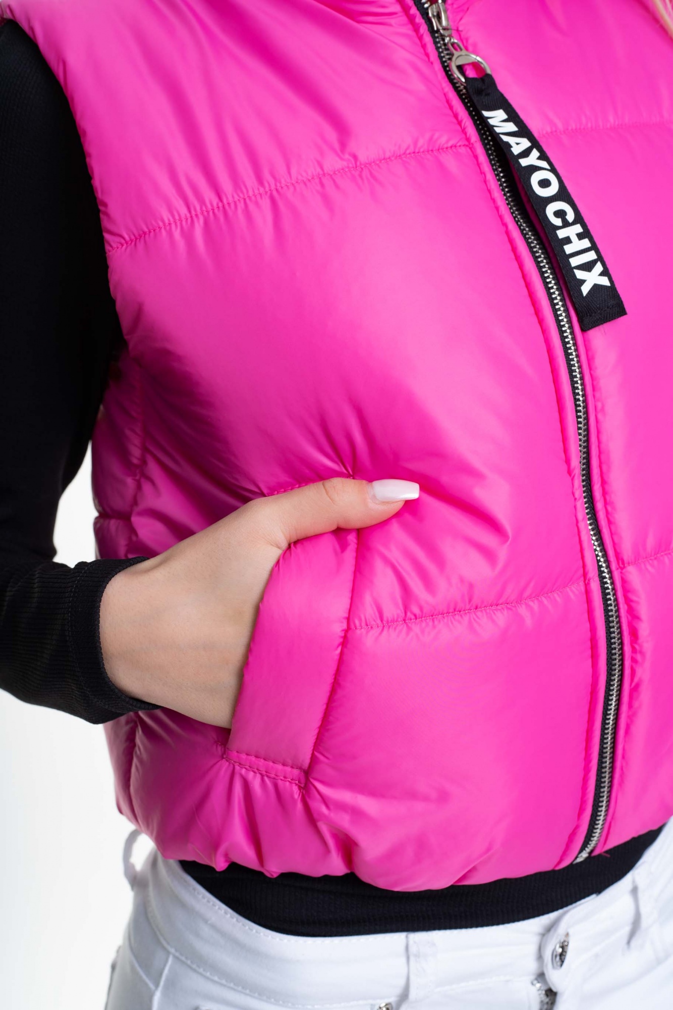 Rövid fazonú steppelt pufi mellény gumis alja résszel, film nyomott márkajelzéssel.