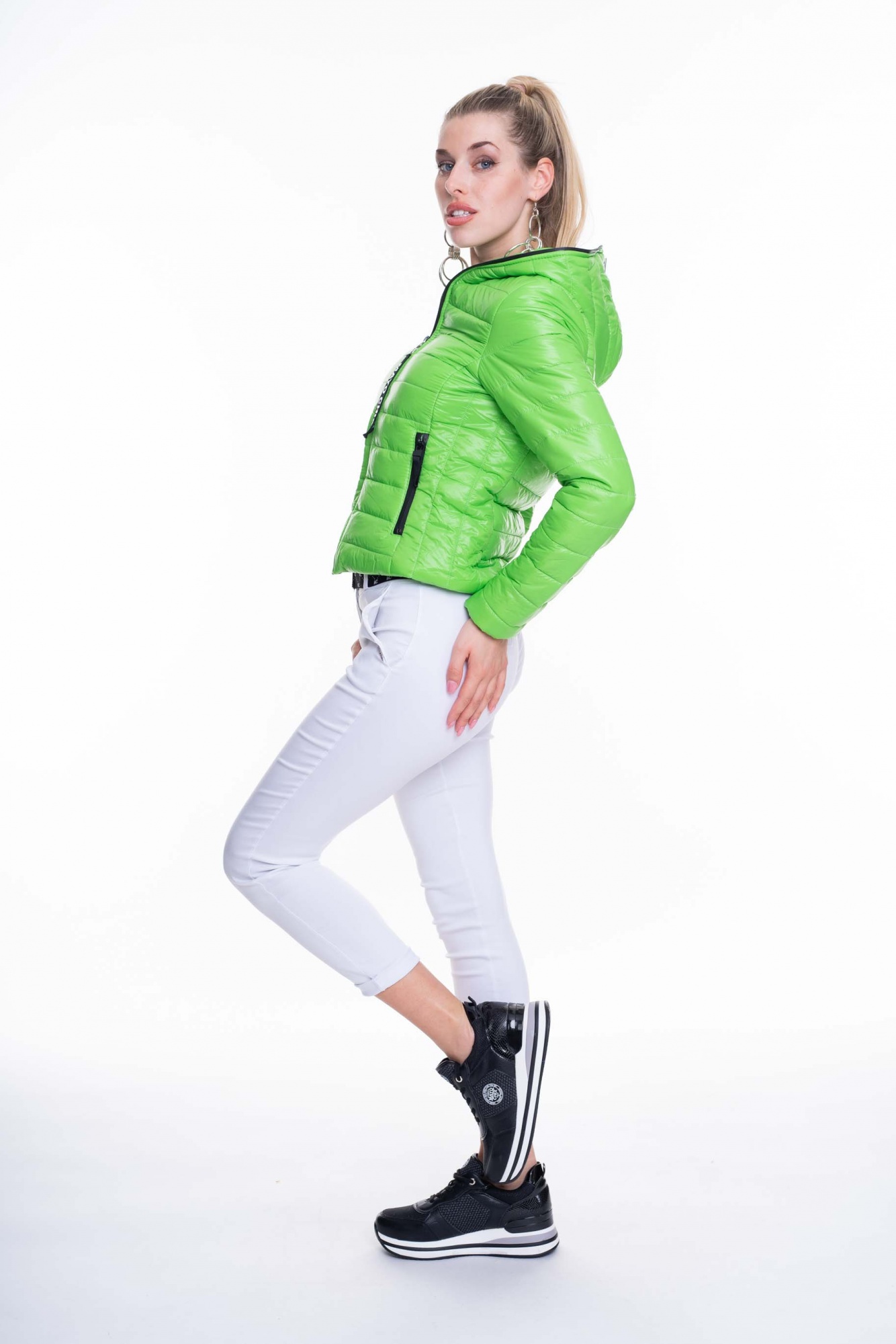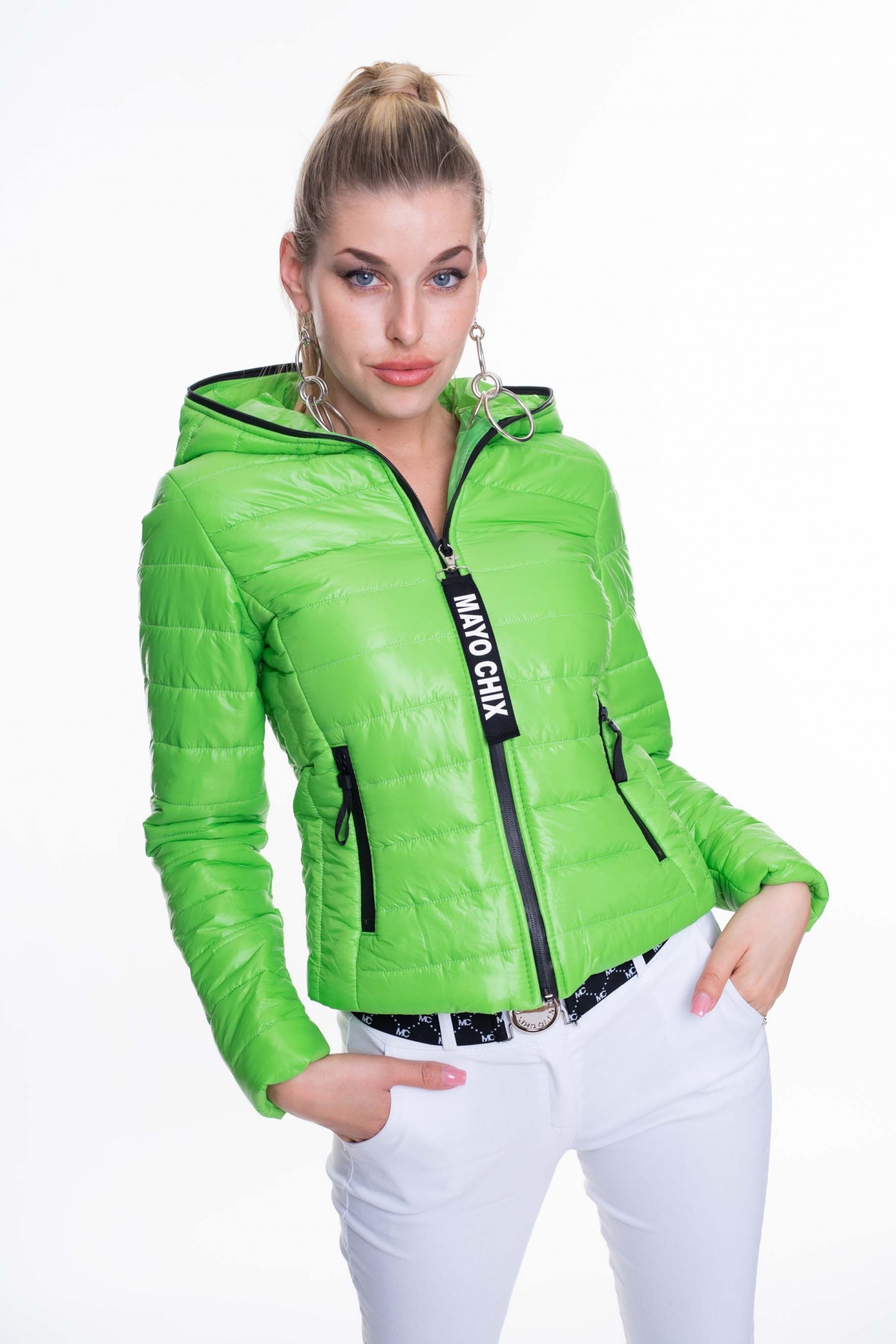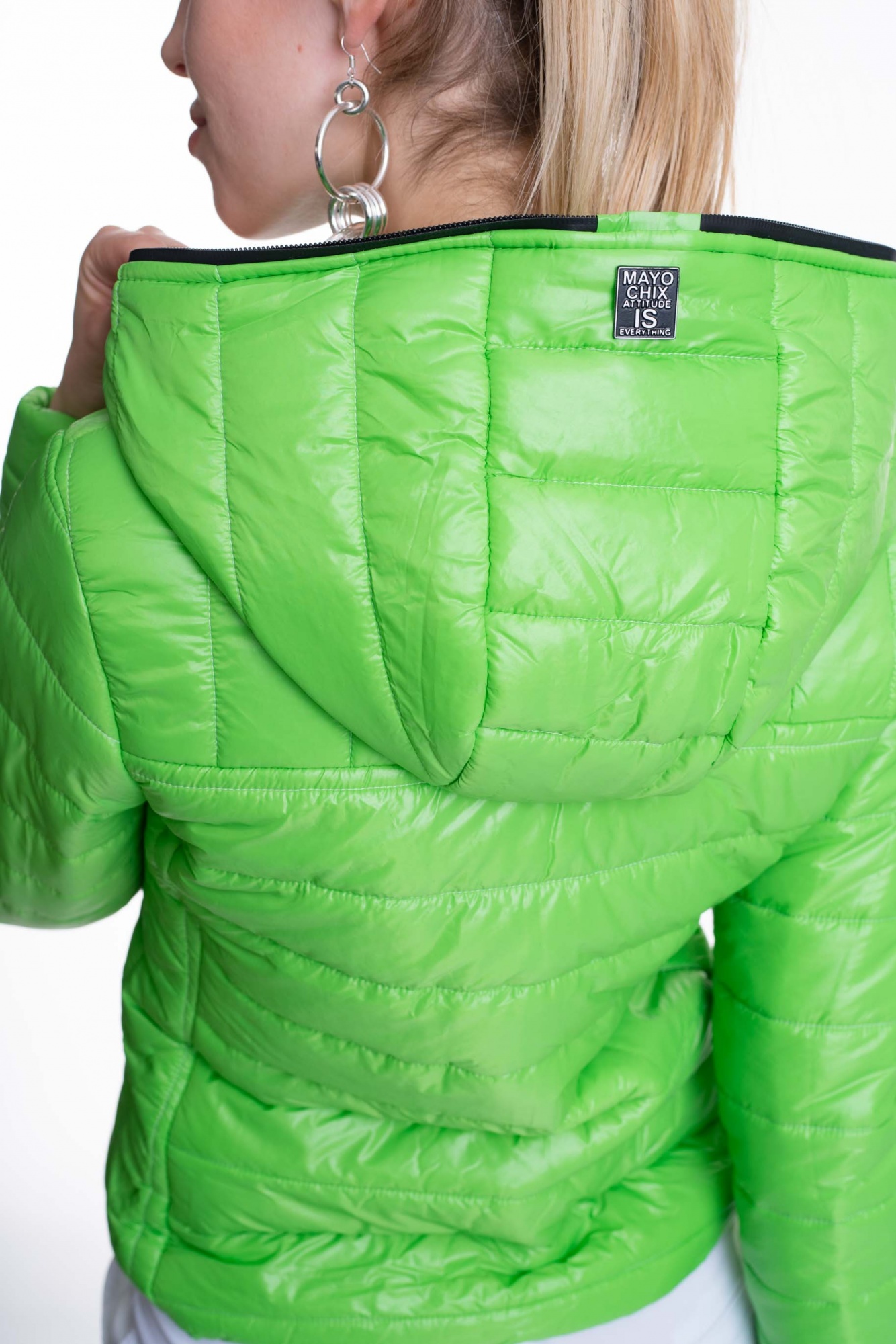 Steppelt anyagból készült átmeneti kapucnis kabát cippzáras záródással, márkajelzéssel.