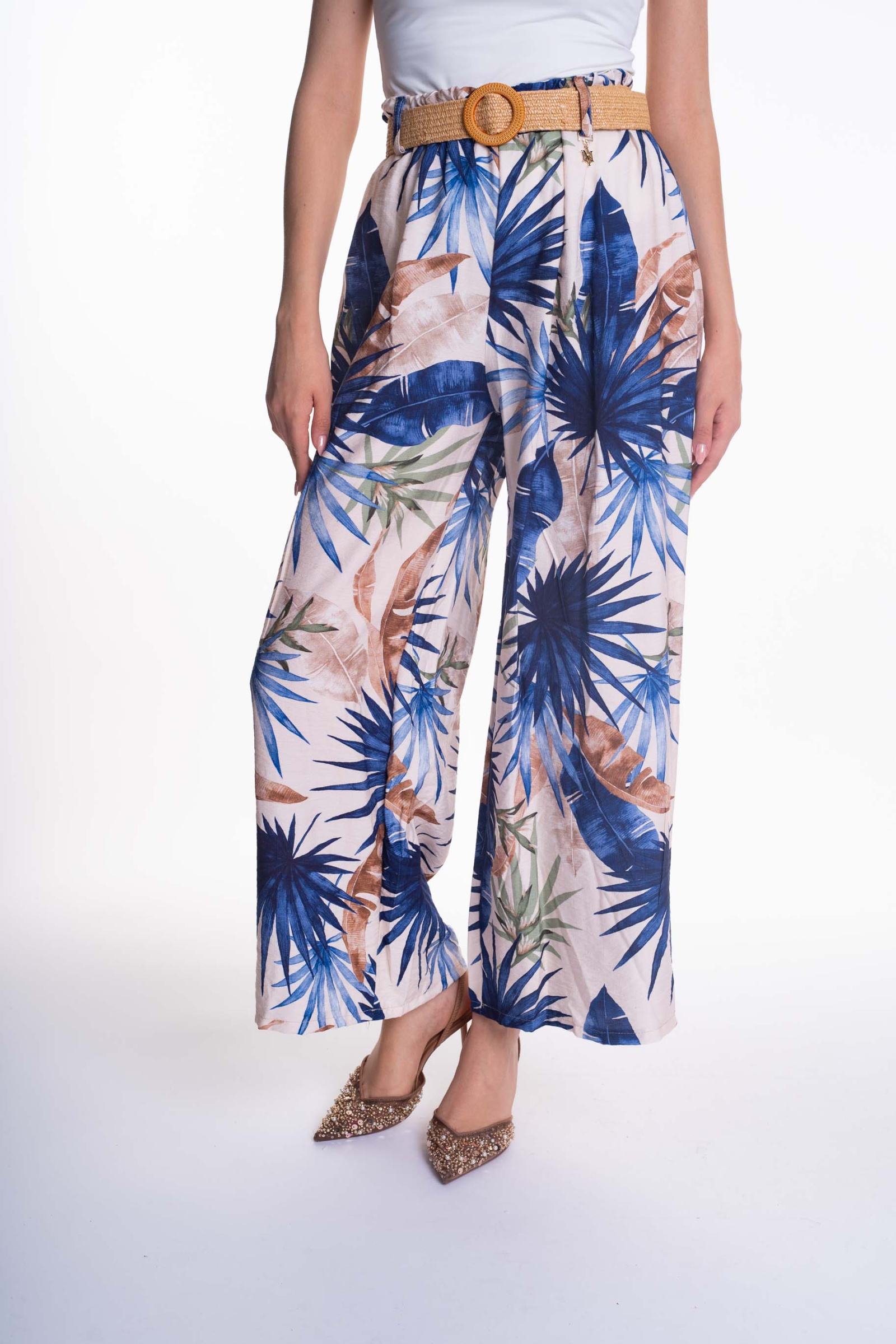 Enyhén rugalmas anyagból készült bő szárú nadrág, gumis derékrésszel, öv kiegészítővel, mosáshoz levehető kis fém márkajelzéssel.