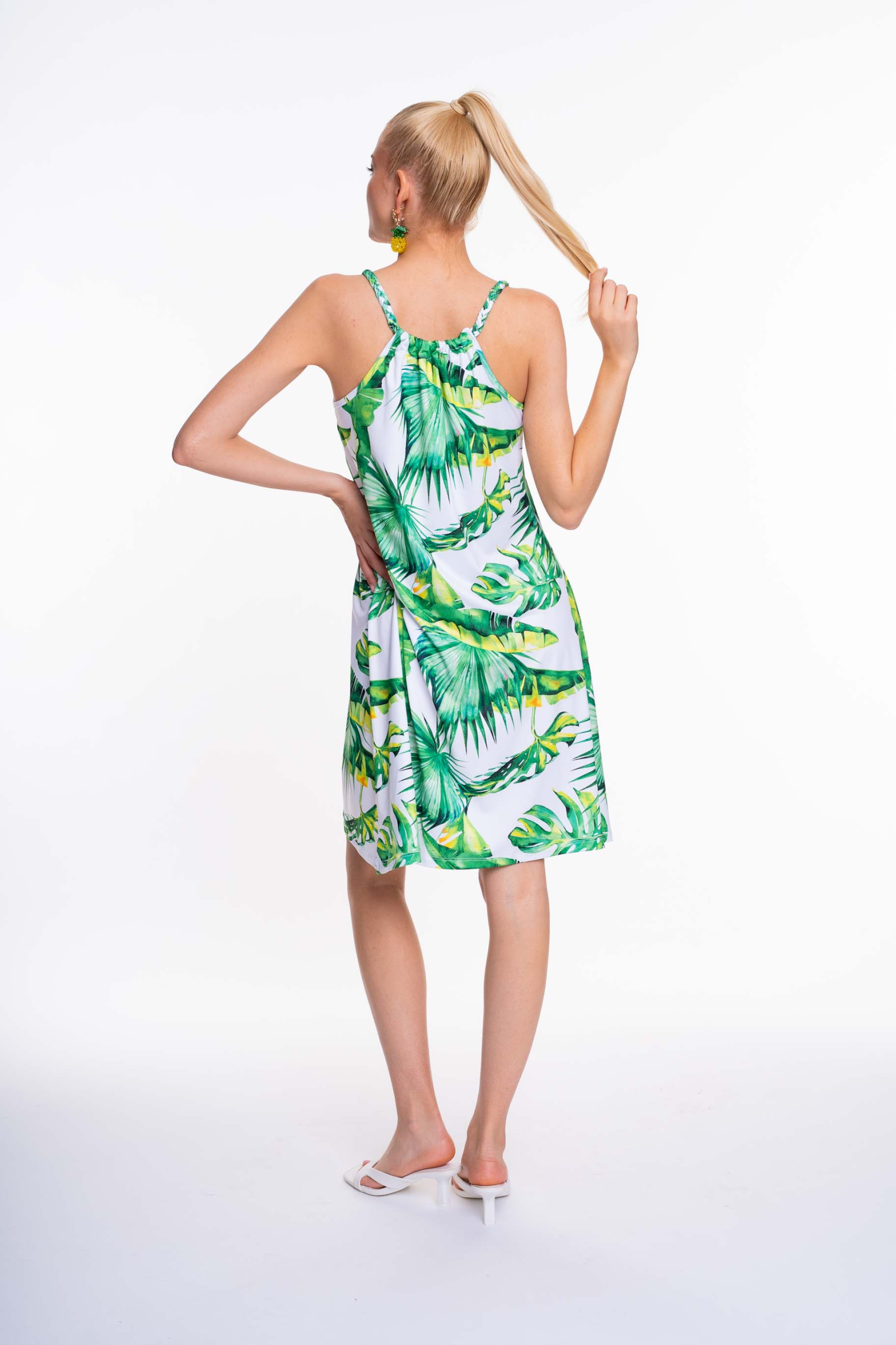 Elasztikus, mintás anyagból készült „A” vonalú ruha, kis fém márkajelzéssel.