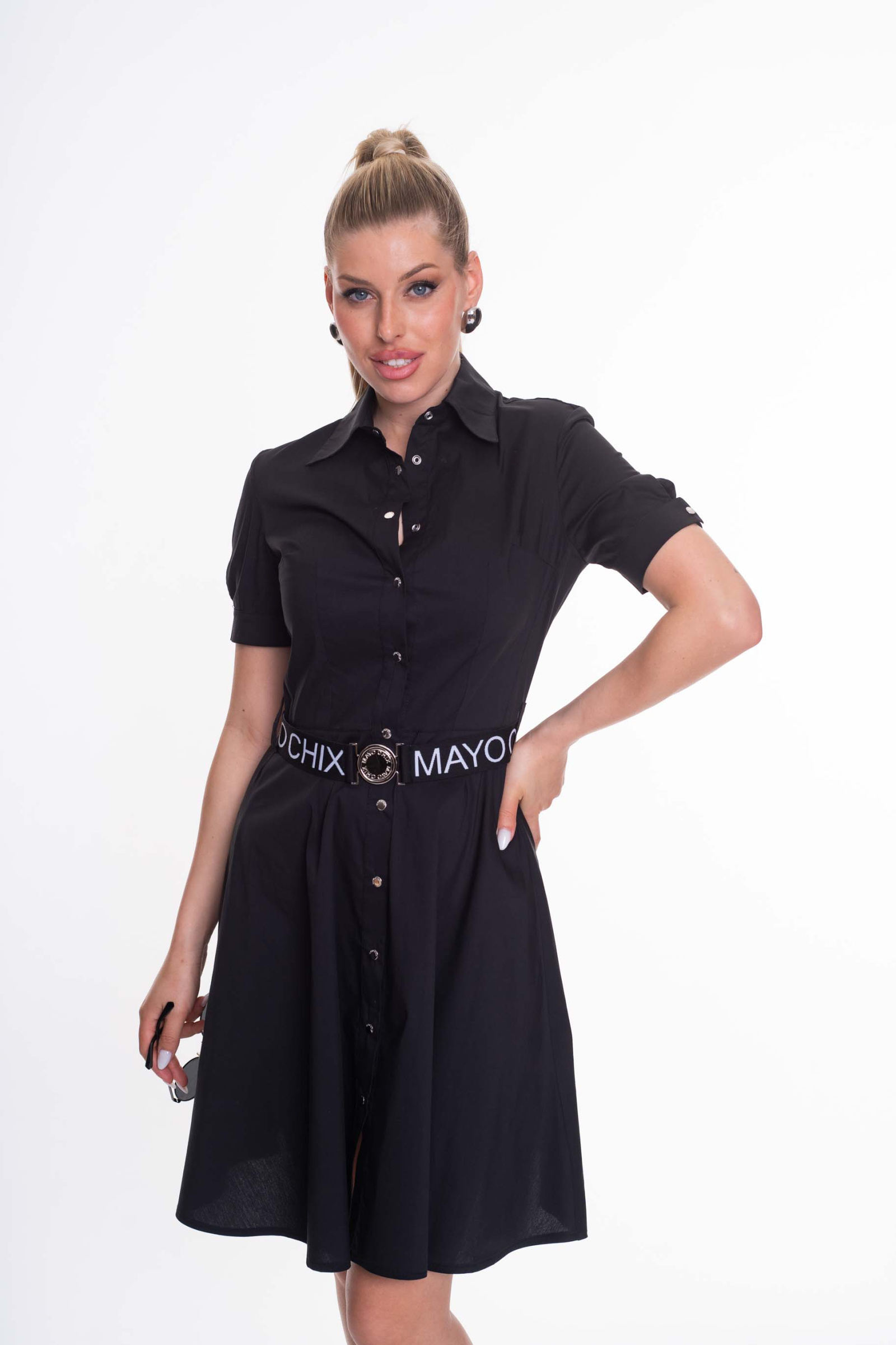 Elasztikus puplin anyagból készült karcsúsított ruha, patentos záródással, derekán márka jelzett gumis övvel.
