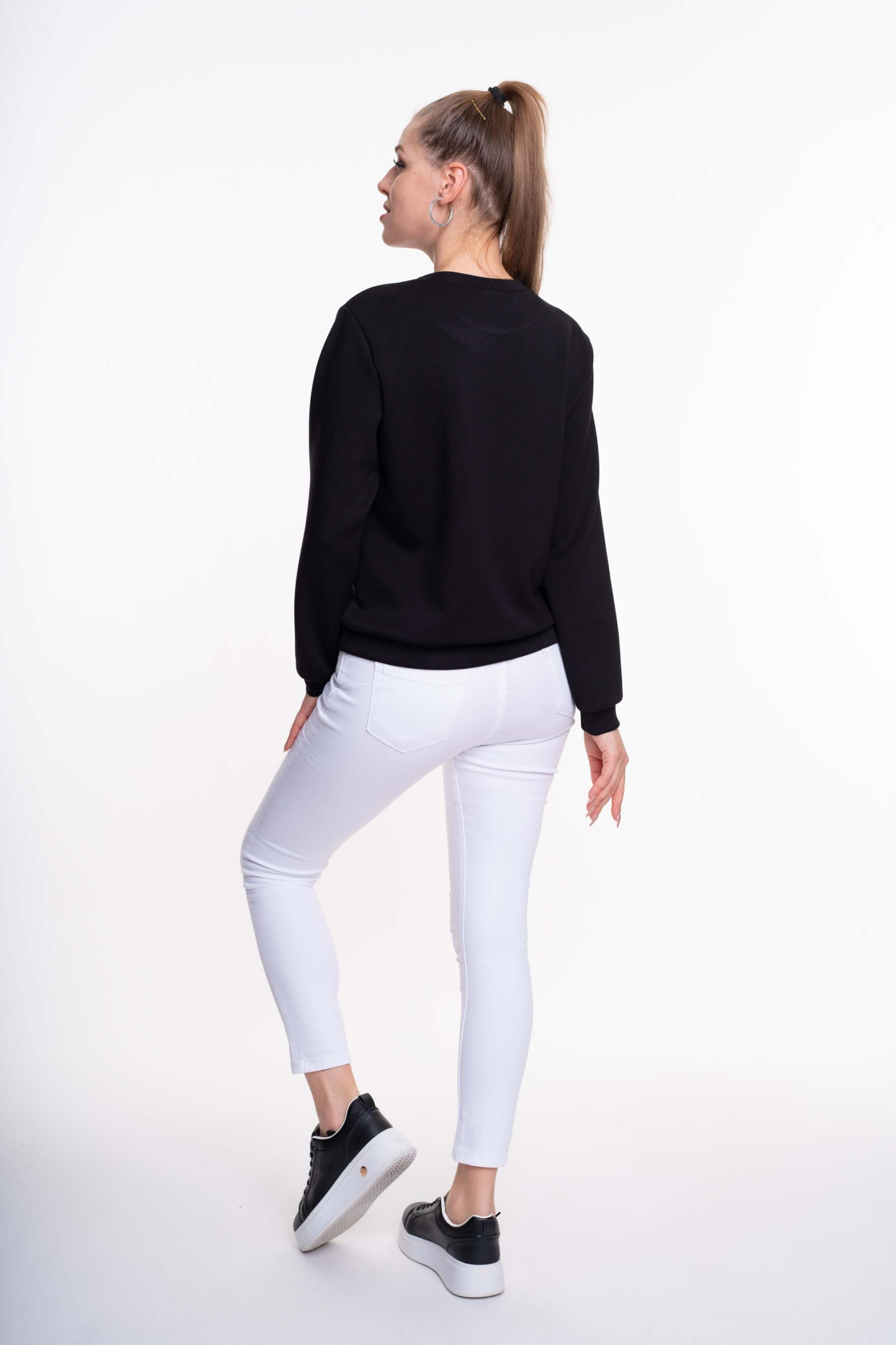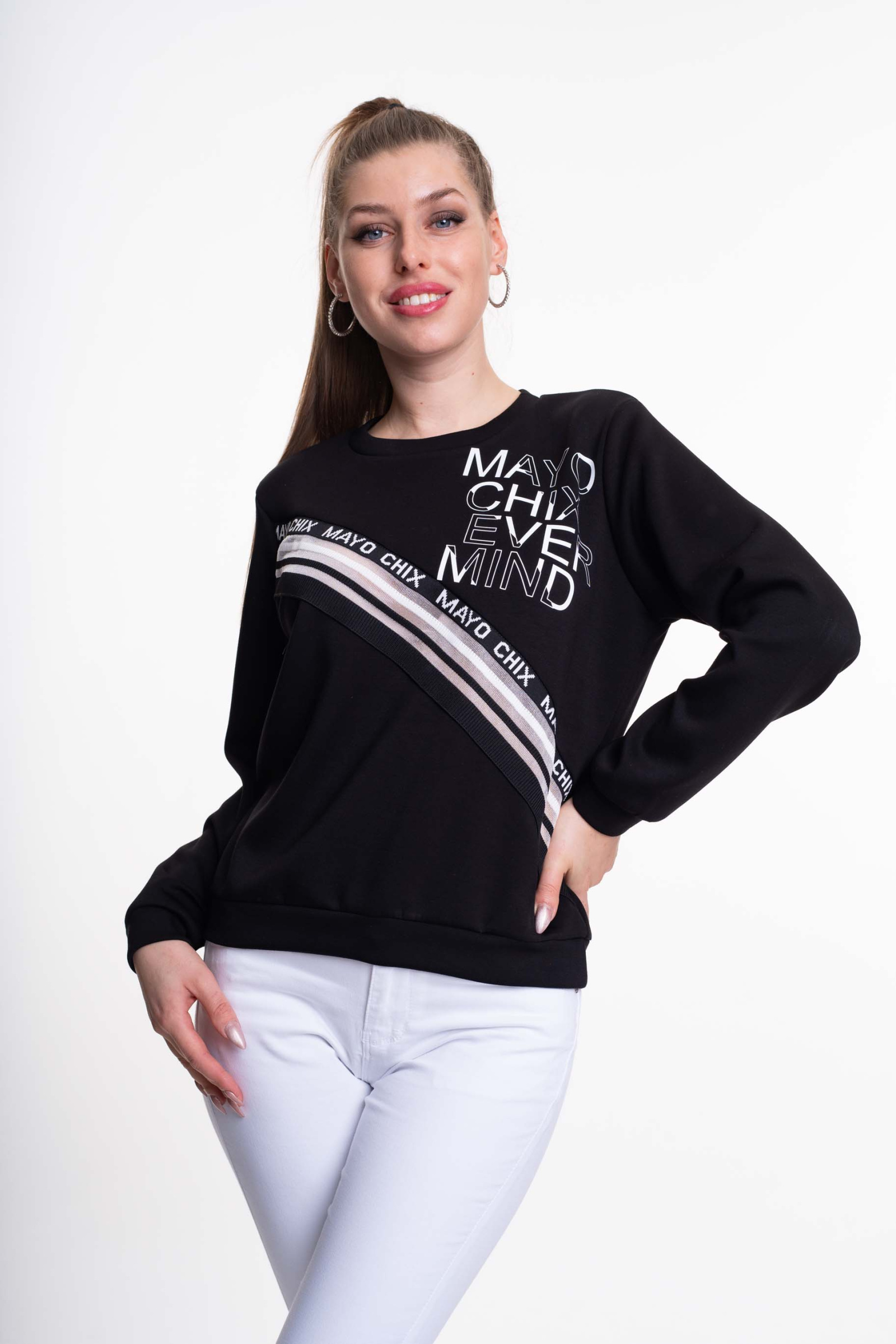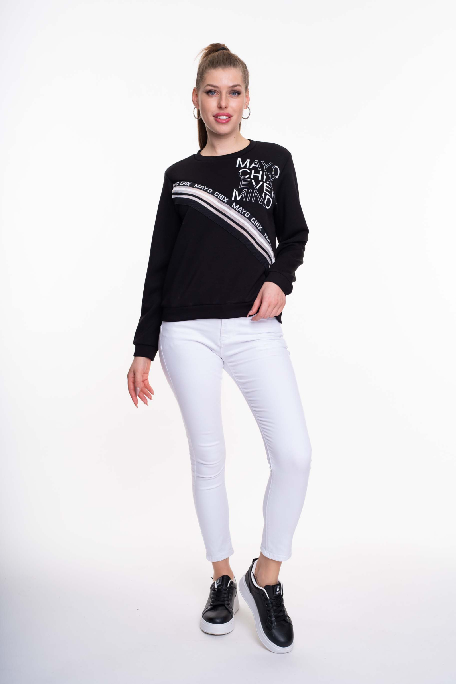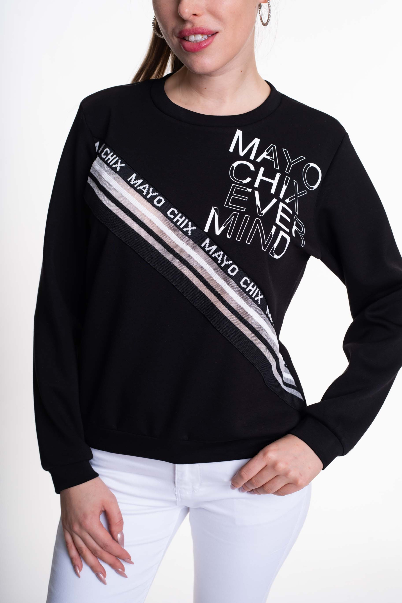Elasztikus anyagból készült, lezser szabásvonalú felső, anyagában kötött és matrica nyomott márkajelzésekkel.