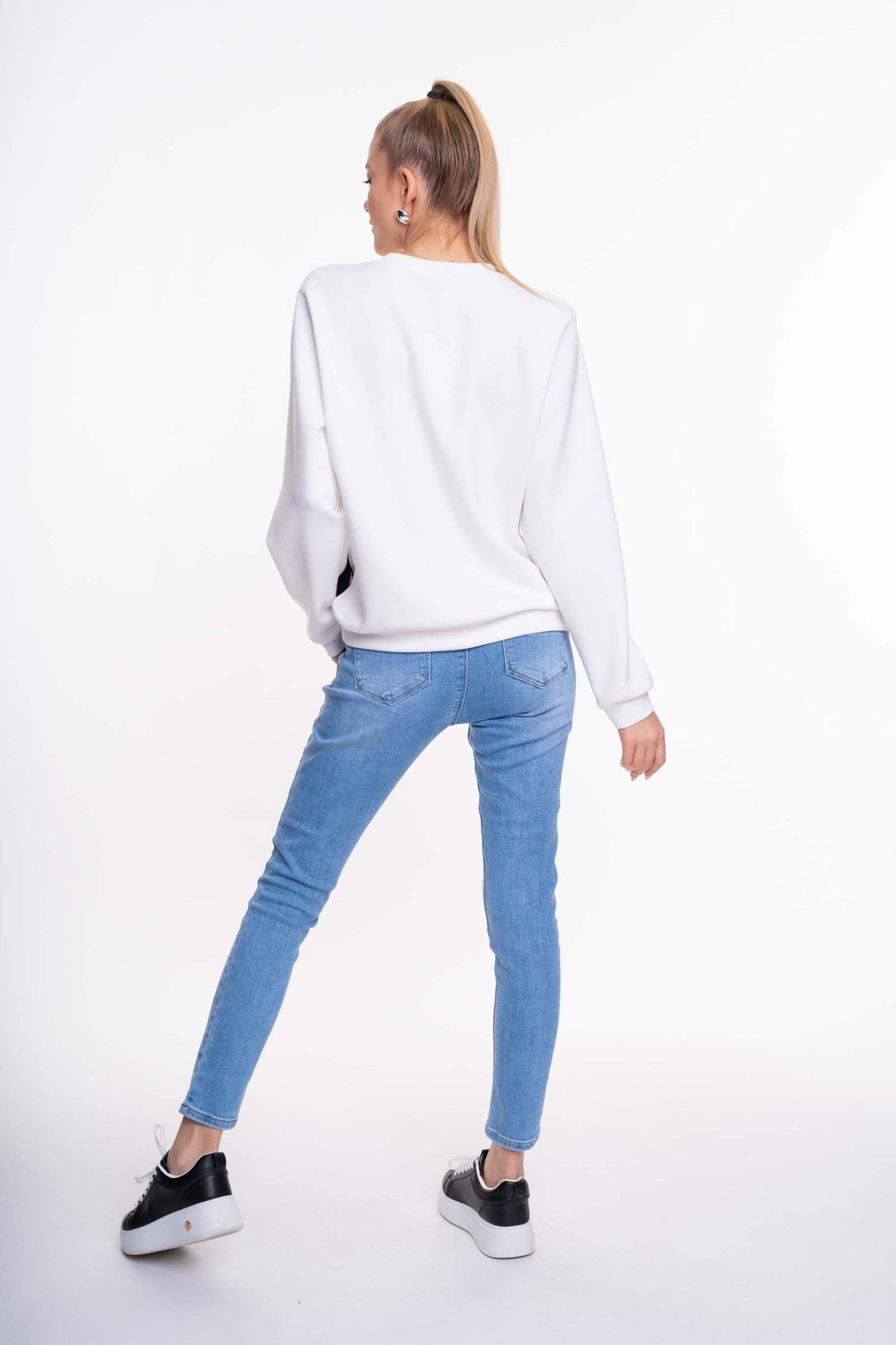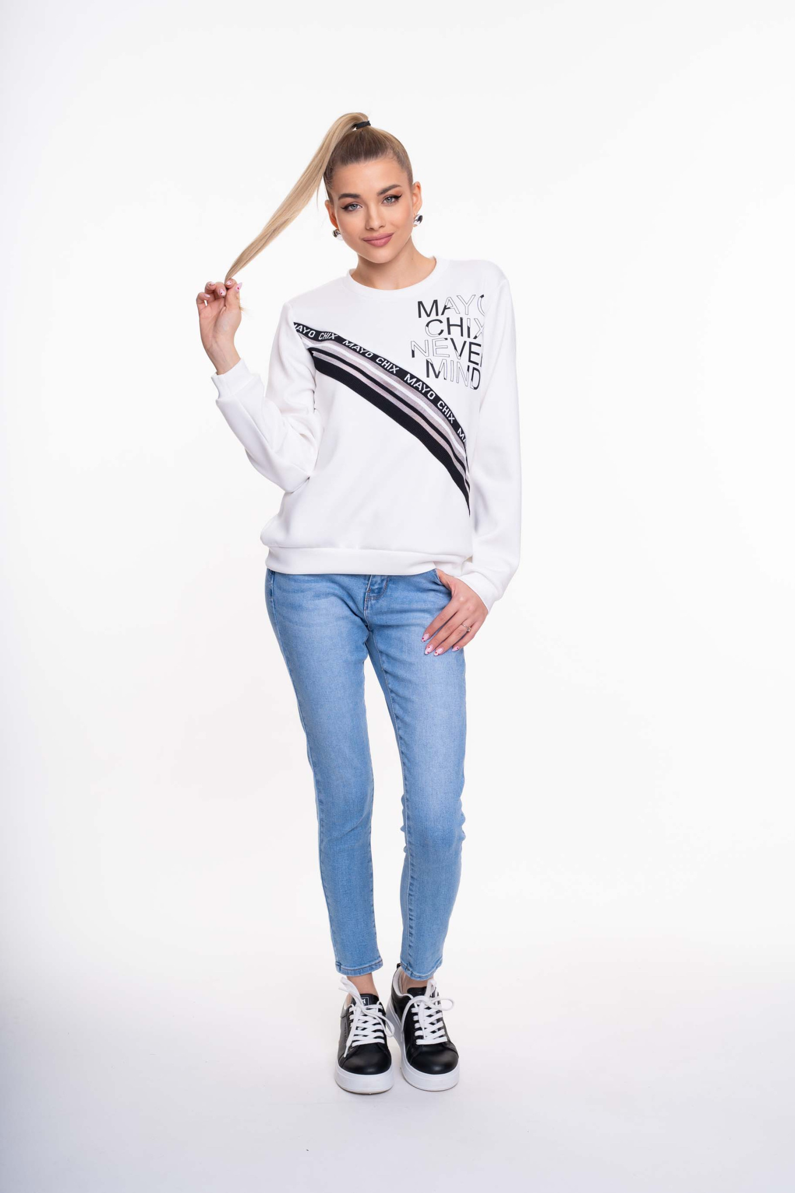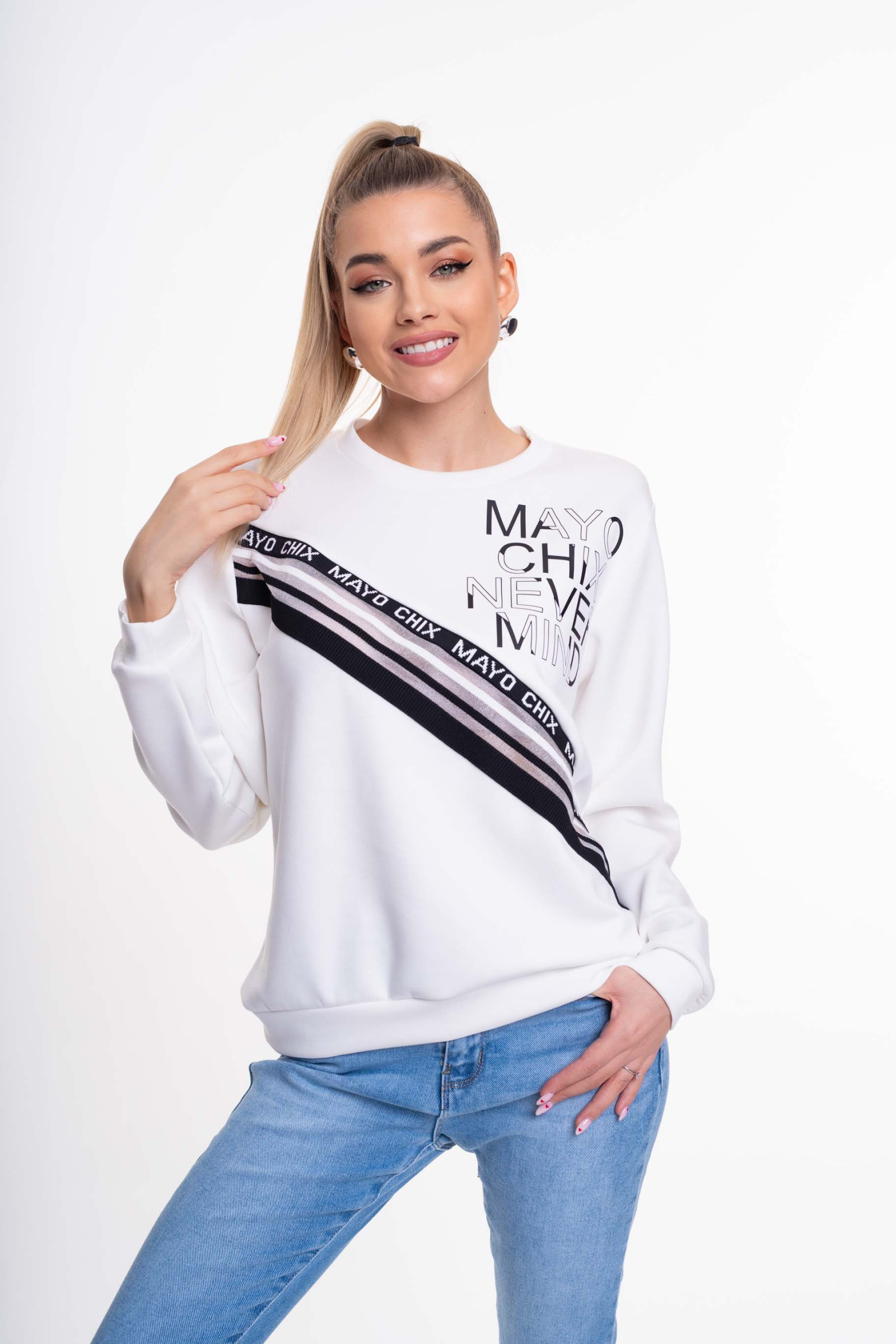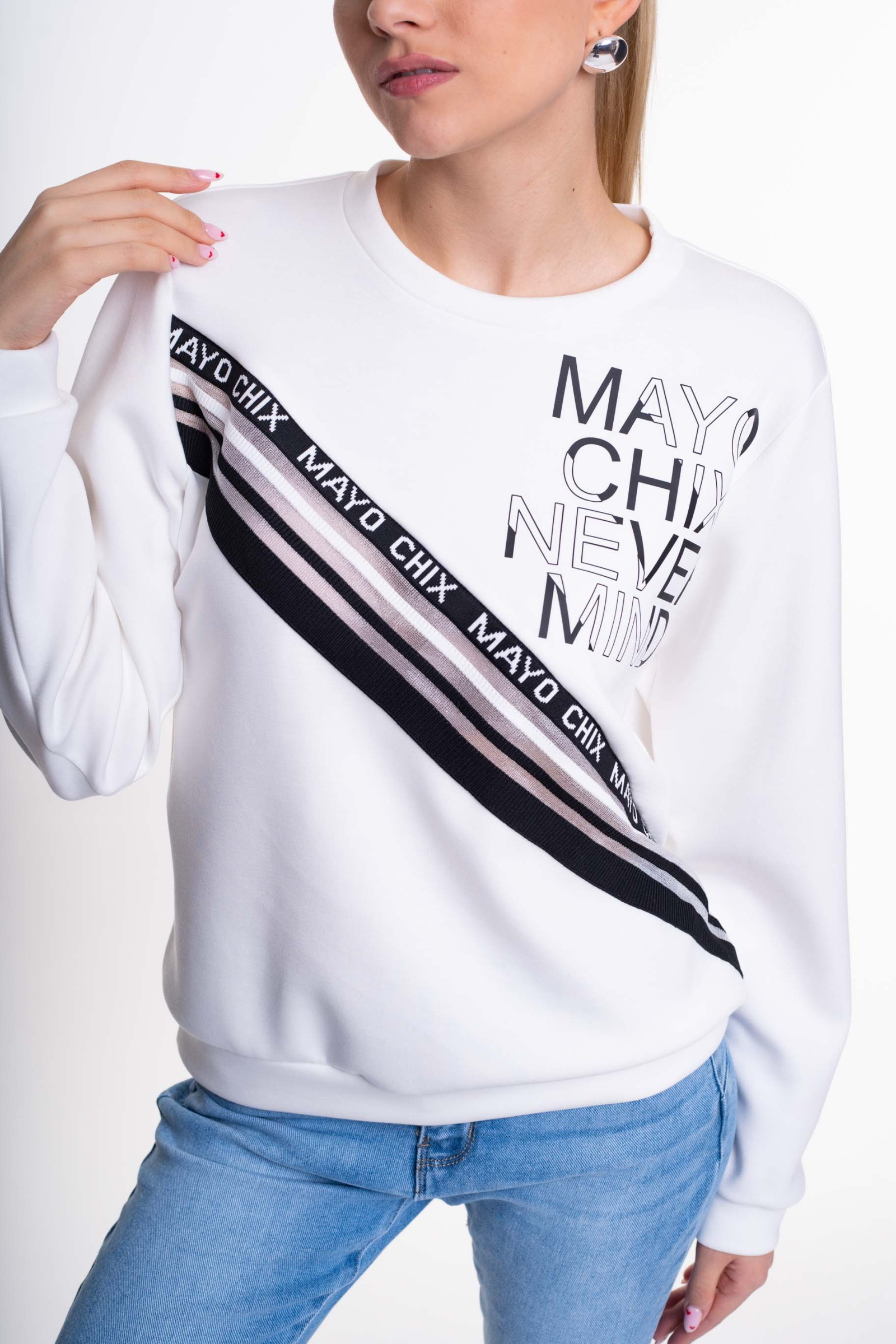 Elasztikus anyagból készült, lezser szabásvonalú felső, anyagában kötött és matrica nyomott márkajelzésekkel.