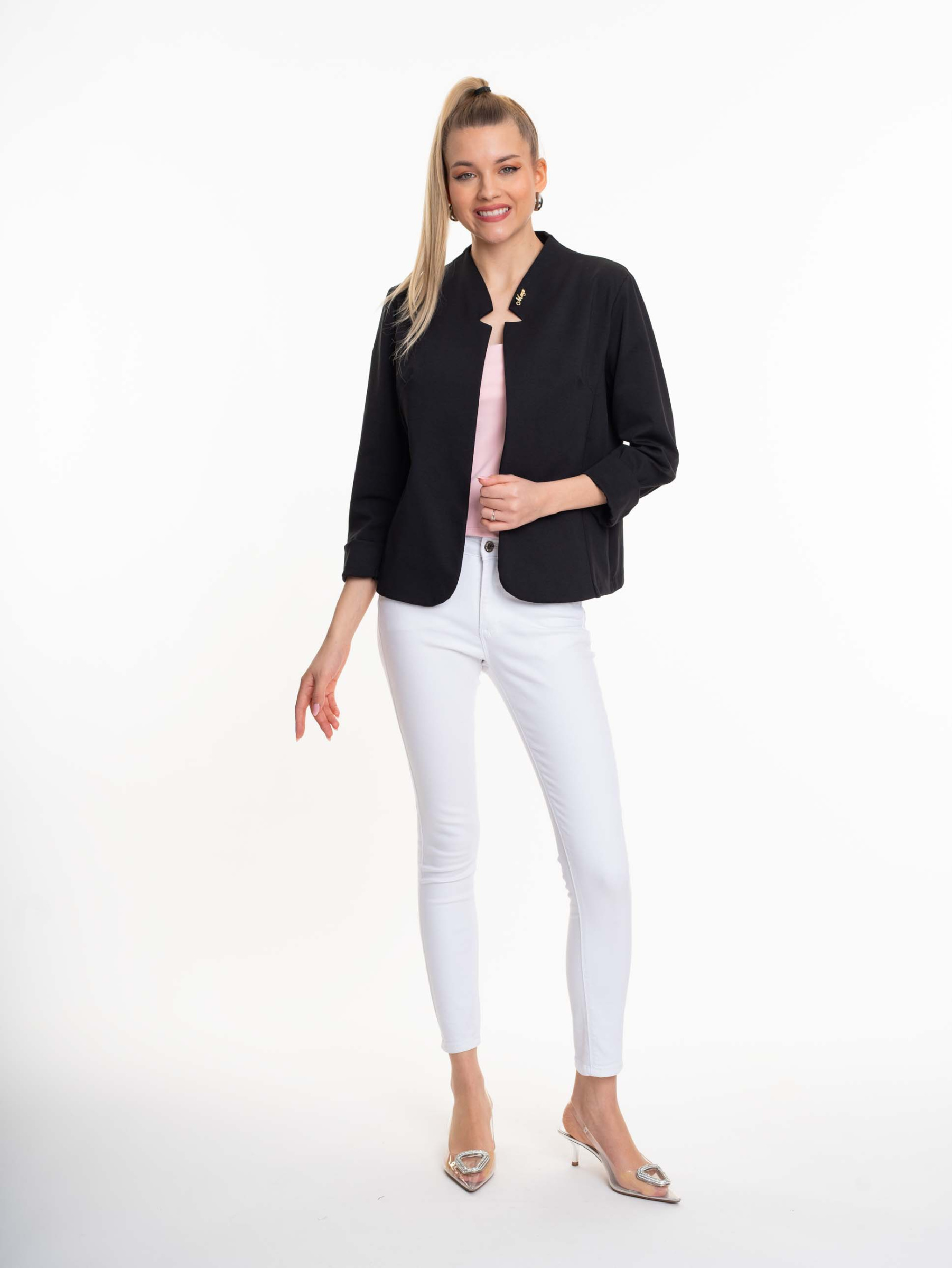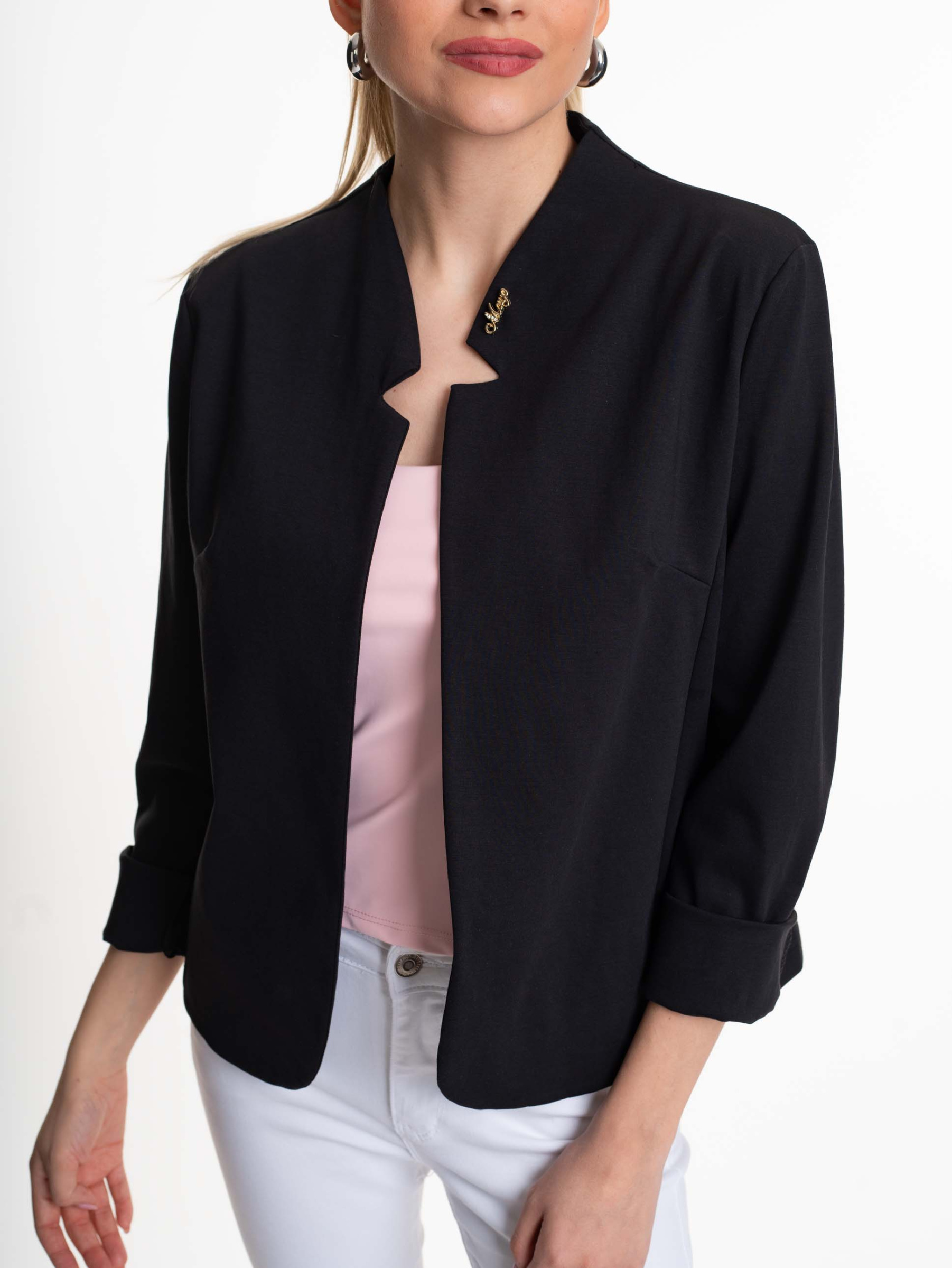 Elasztikus anyagból készült nyitott blézer, mosáshoz levehető bross márkajelzéssel.