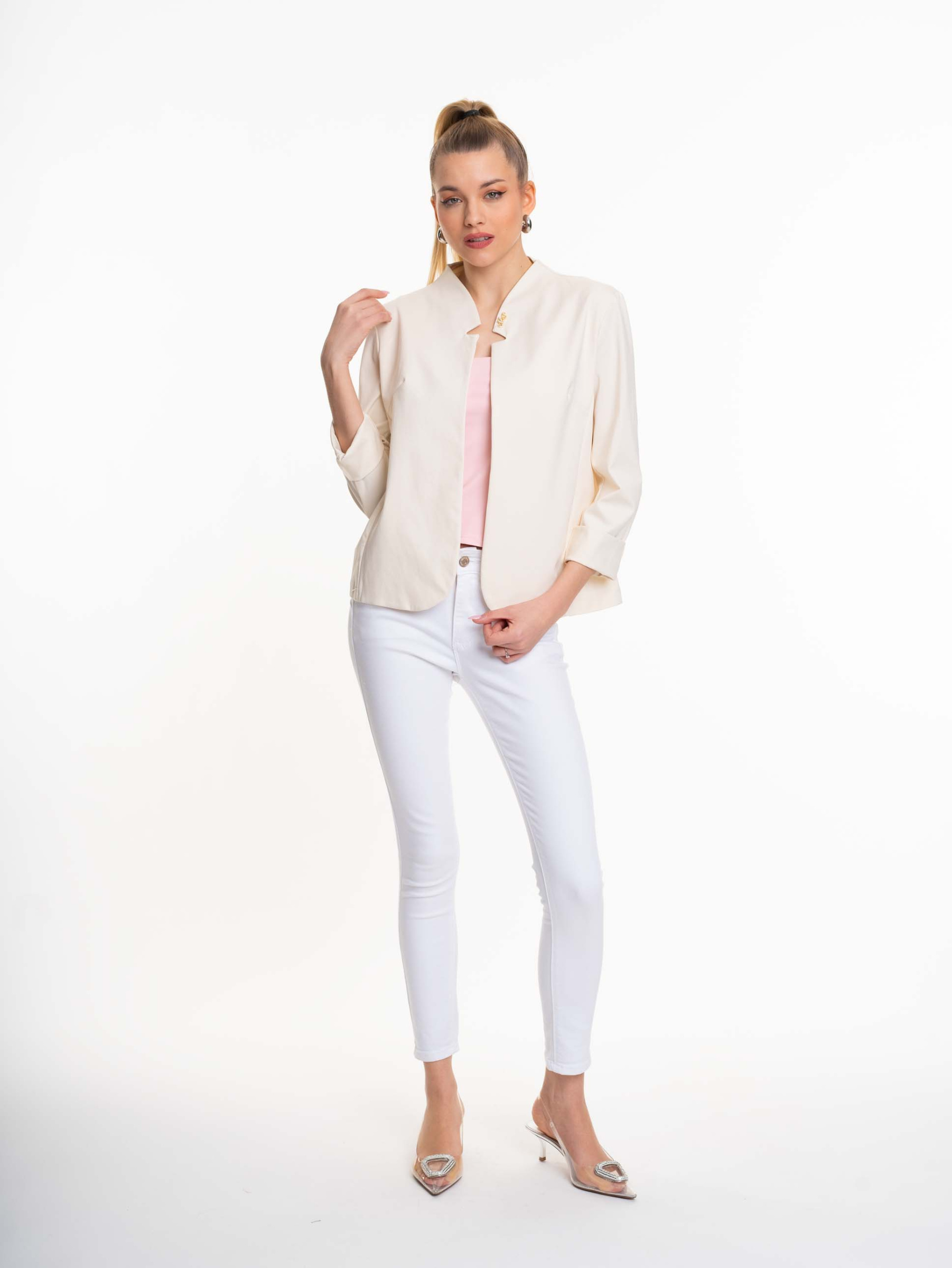 Elasztikus anyagból készült nyitott blézer, mosáshoz levehető bross márkajelzéssel.