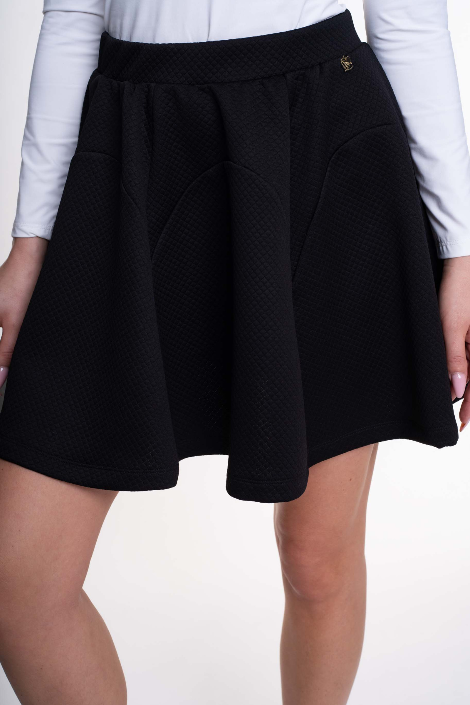 Elasztikus anyagból készült térdszoknya, gumis derékrésszel, alján kis fém márkajelzéssel.