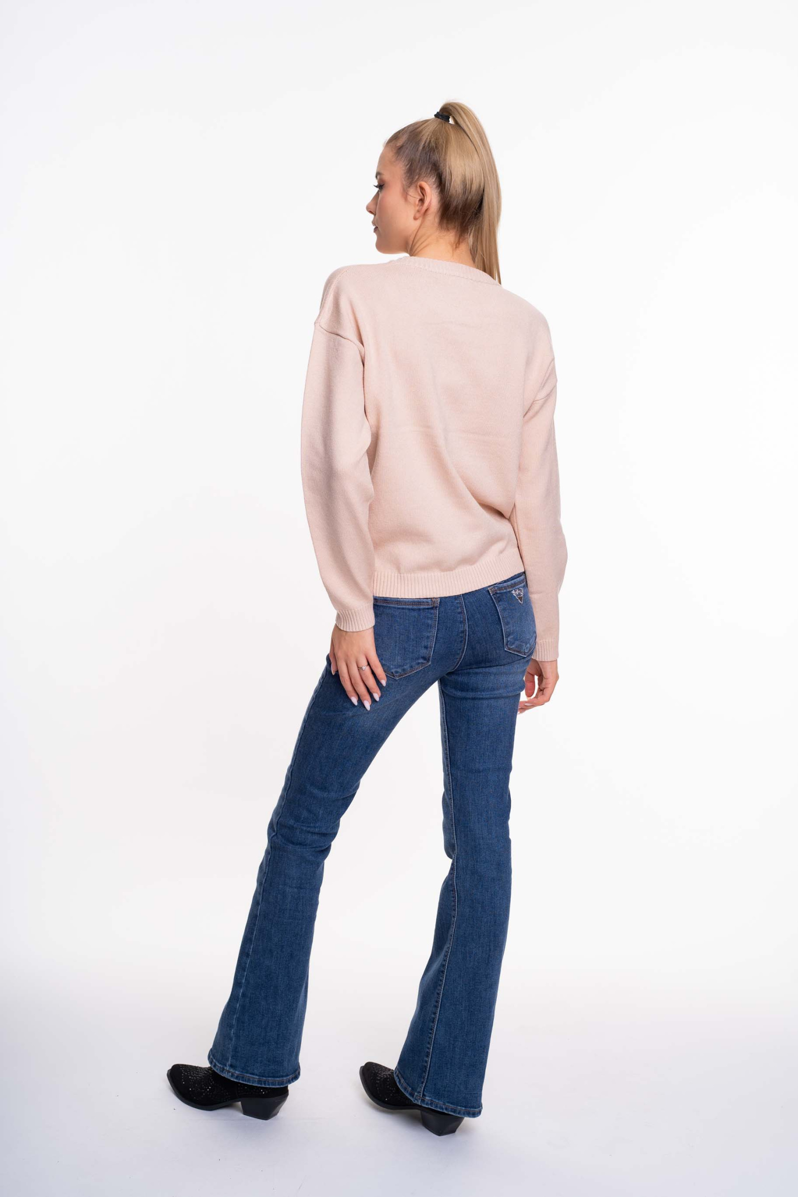 Puha, vékony kötött anyagból készült, lezser szabásvonalú, kerek nyakú pulóver, anyagában kötött mintával és márkajelzéssel.