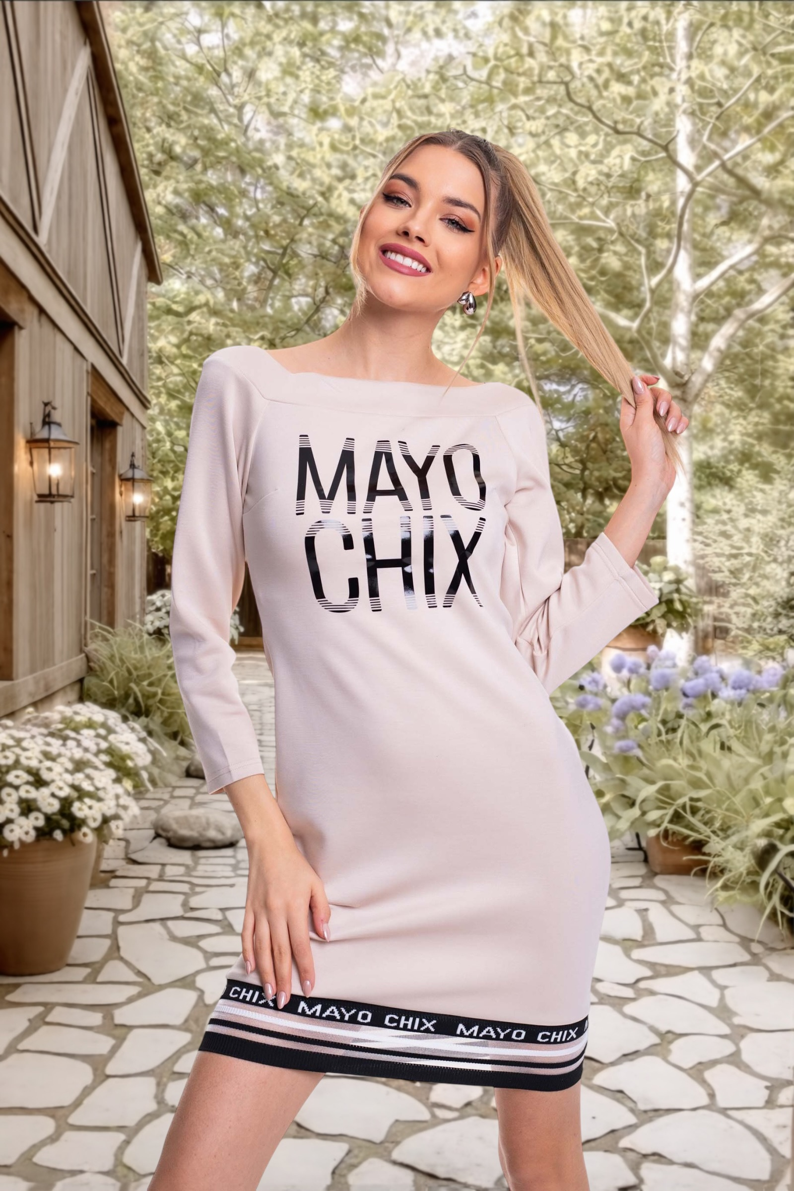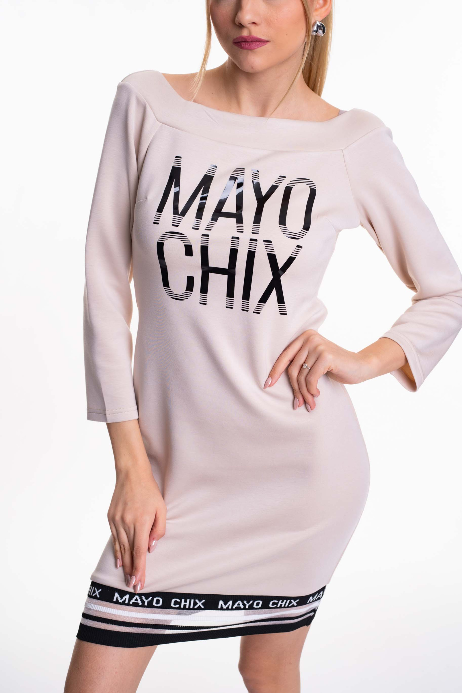 Elasztikus anyagból készült csónak nyakú ruha, széles márka jelzett passzéval, matrica nyomott díszítéssel.
