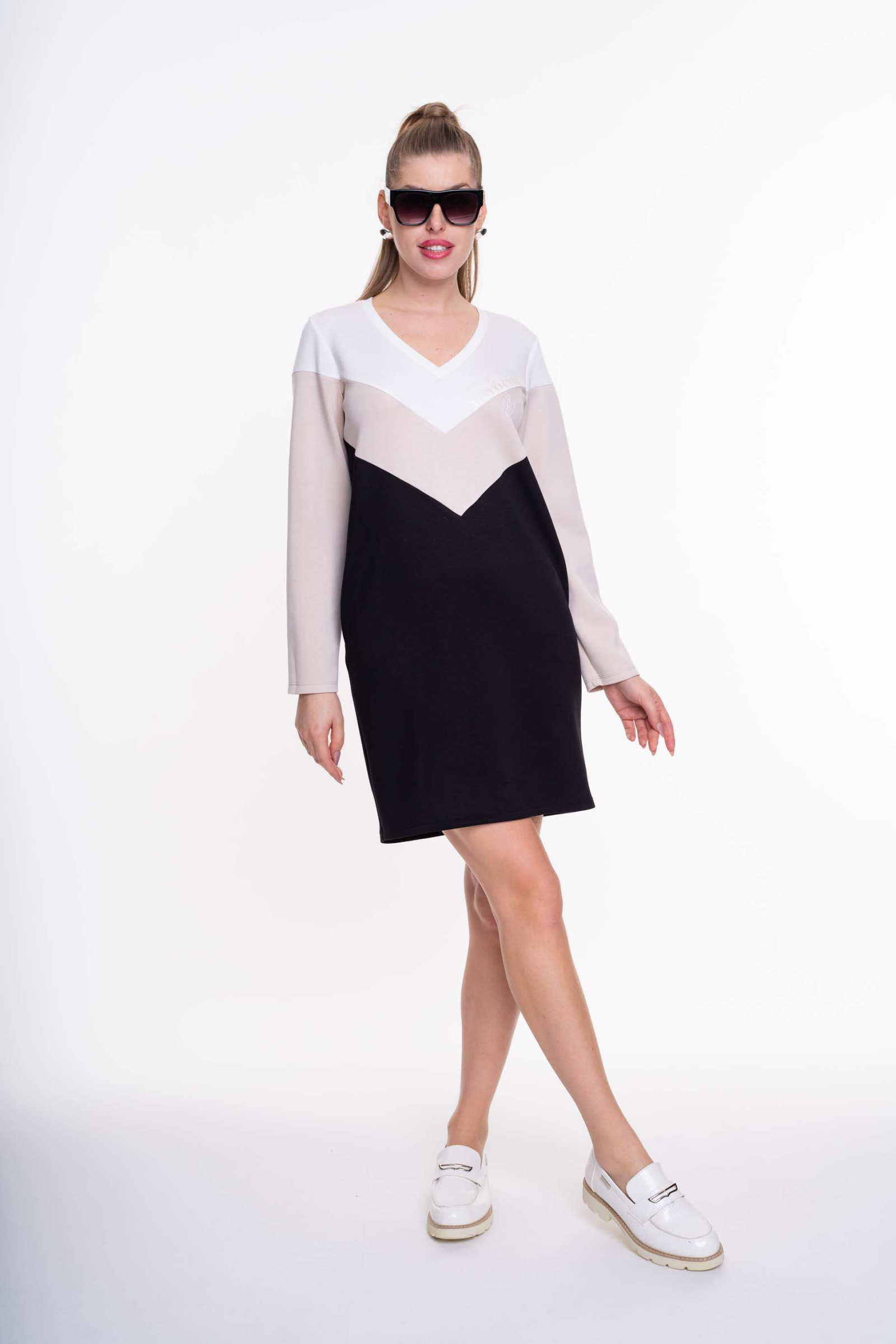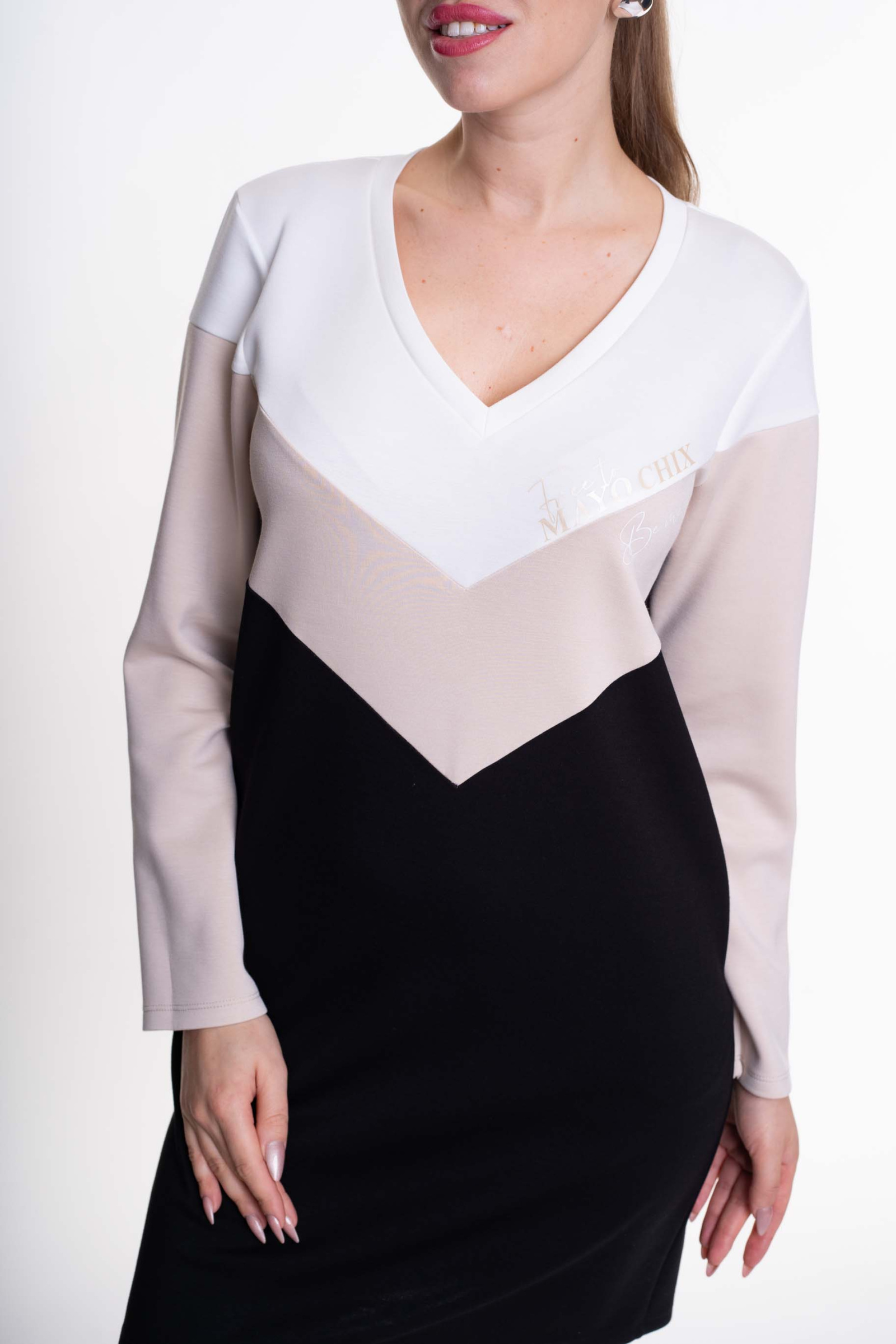 Elasztikus anyagból készült V nyakkivágású, zsebes ruha, film nyomott díszítéssel.