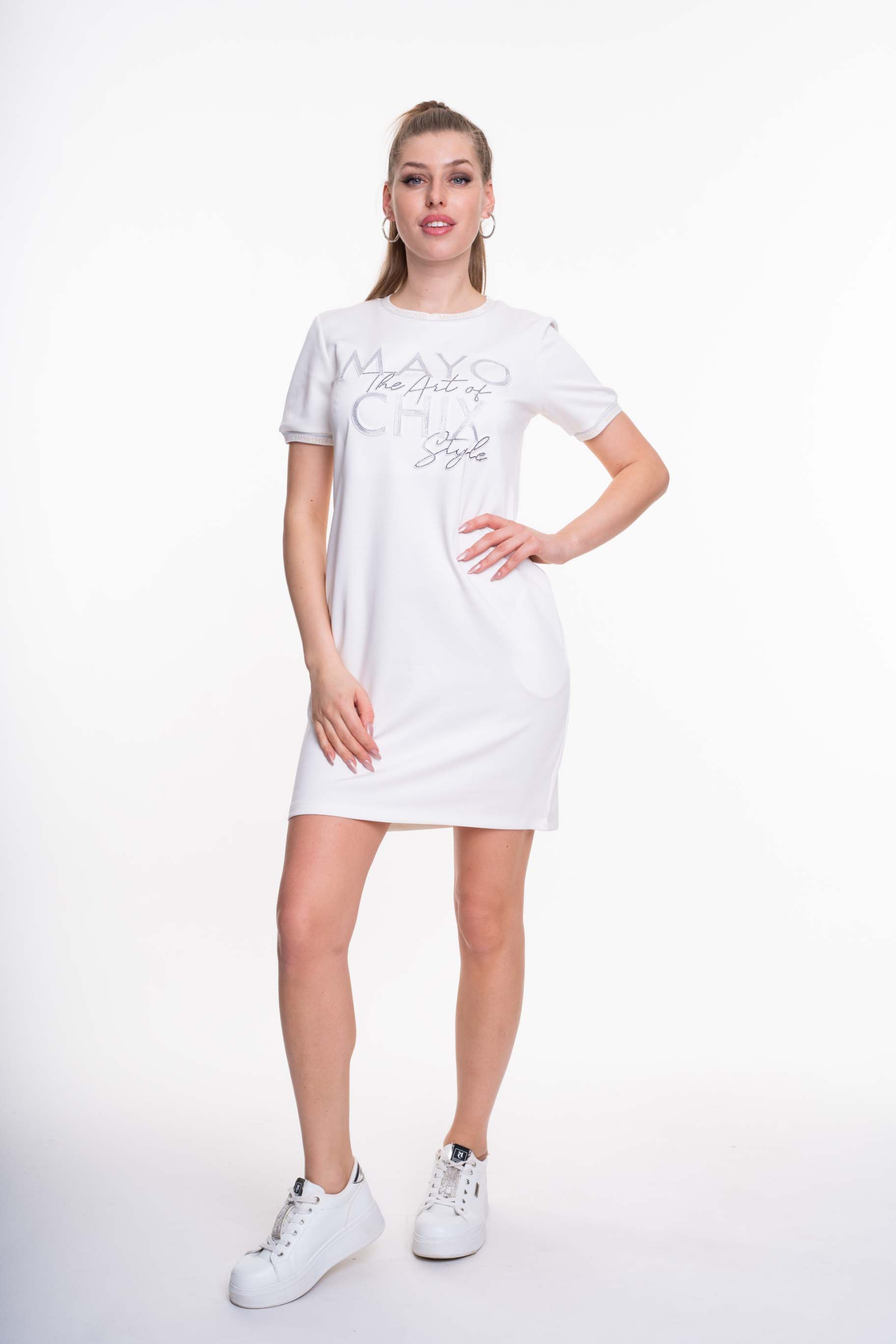 Elasztikus anyagból készült, lezser szabásvonalú zsebes ruha, strasszköves díszítéssel.