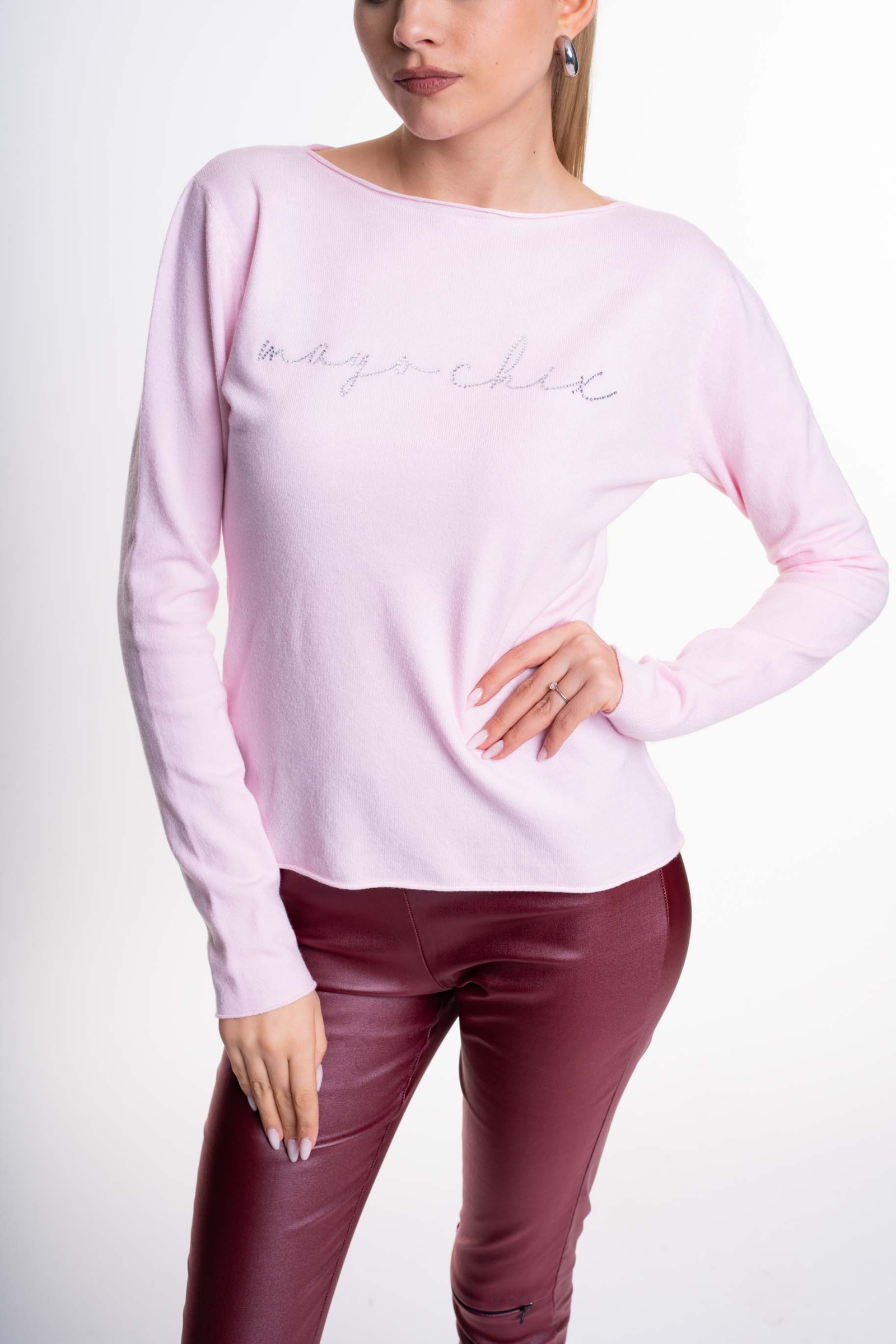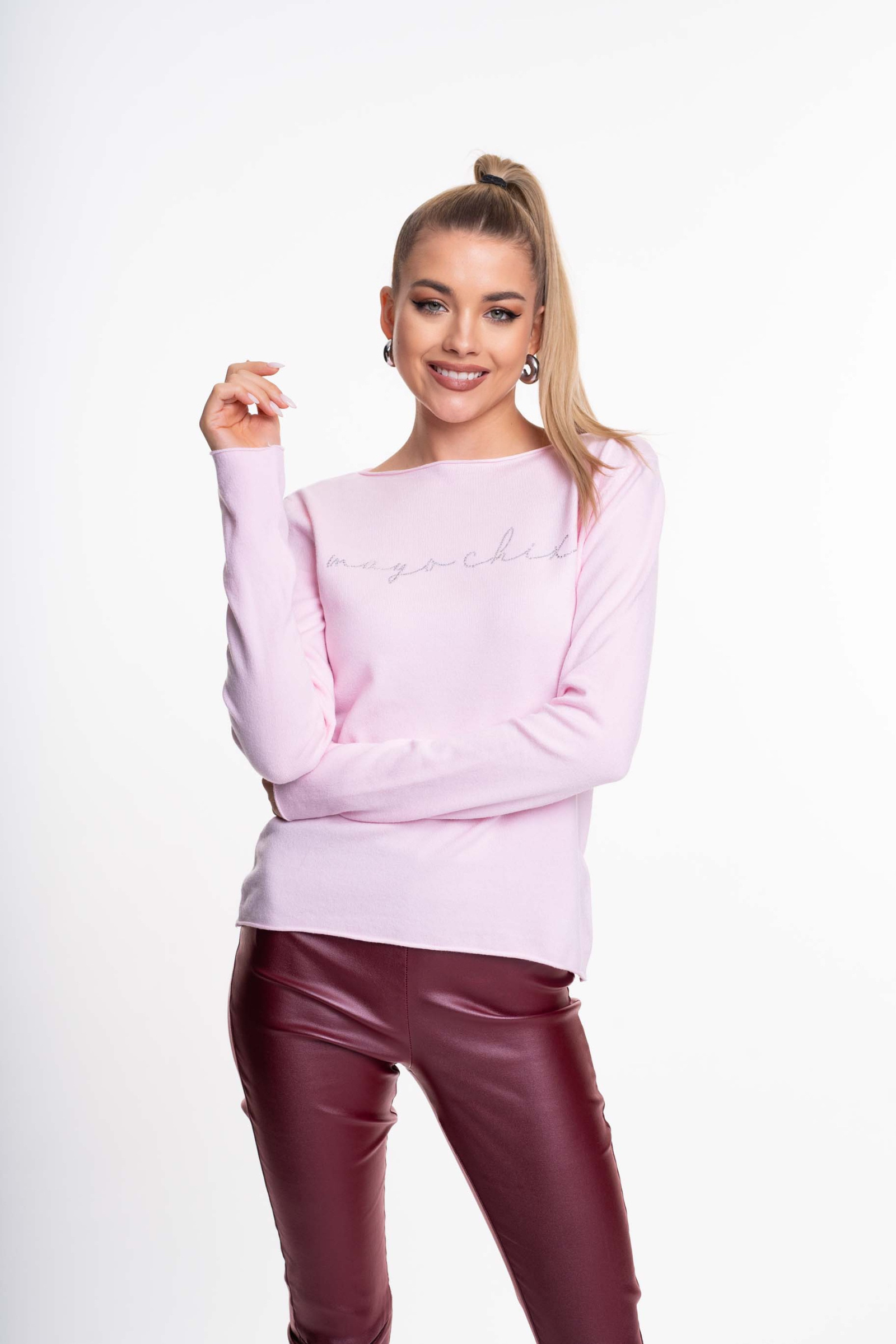 Elasztikus, vékony kötött anyagú pulóver, strasszköves márkajelzéssel.