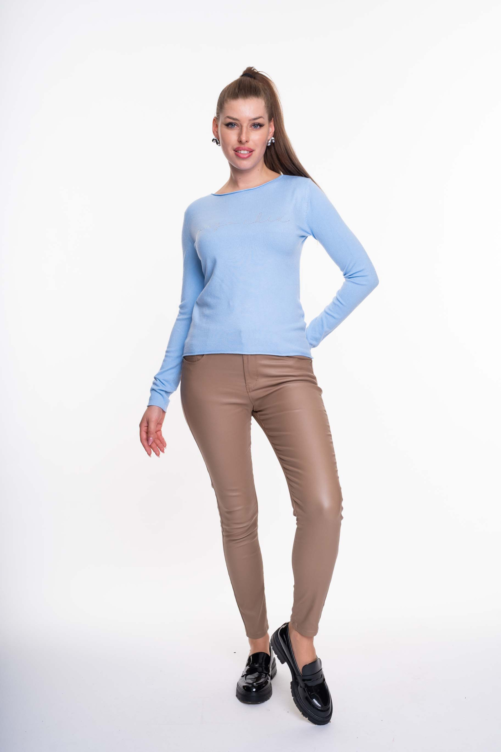 Elasztikus, vékony kötött anyagú pulóver, strasszköves márkajelzéssel.