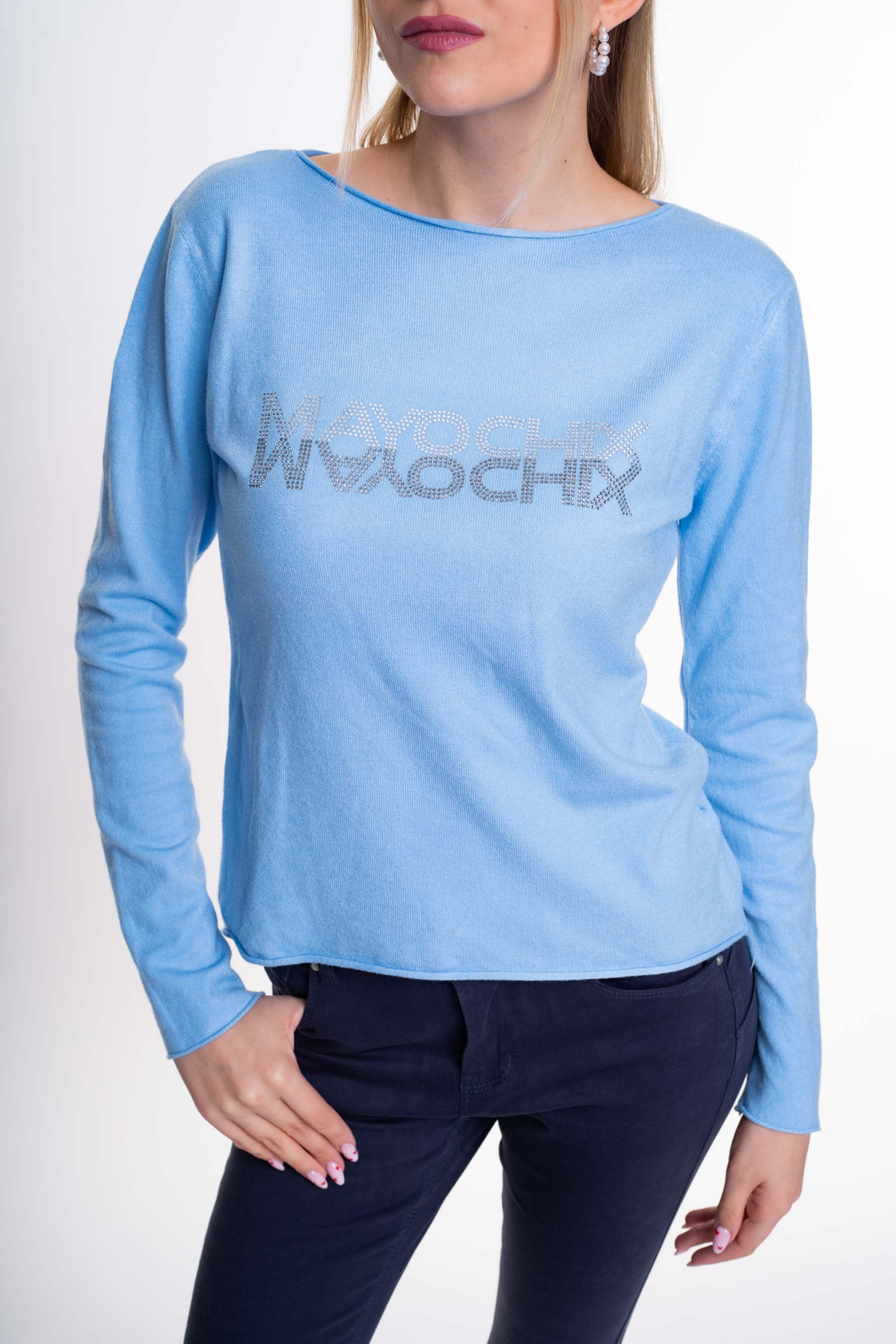 Elasztikus, vékony kötött anyagú pulóver, strasszköves márkajelzéssel.