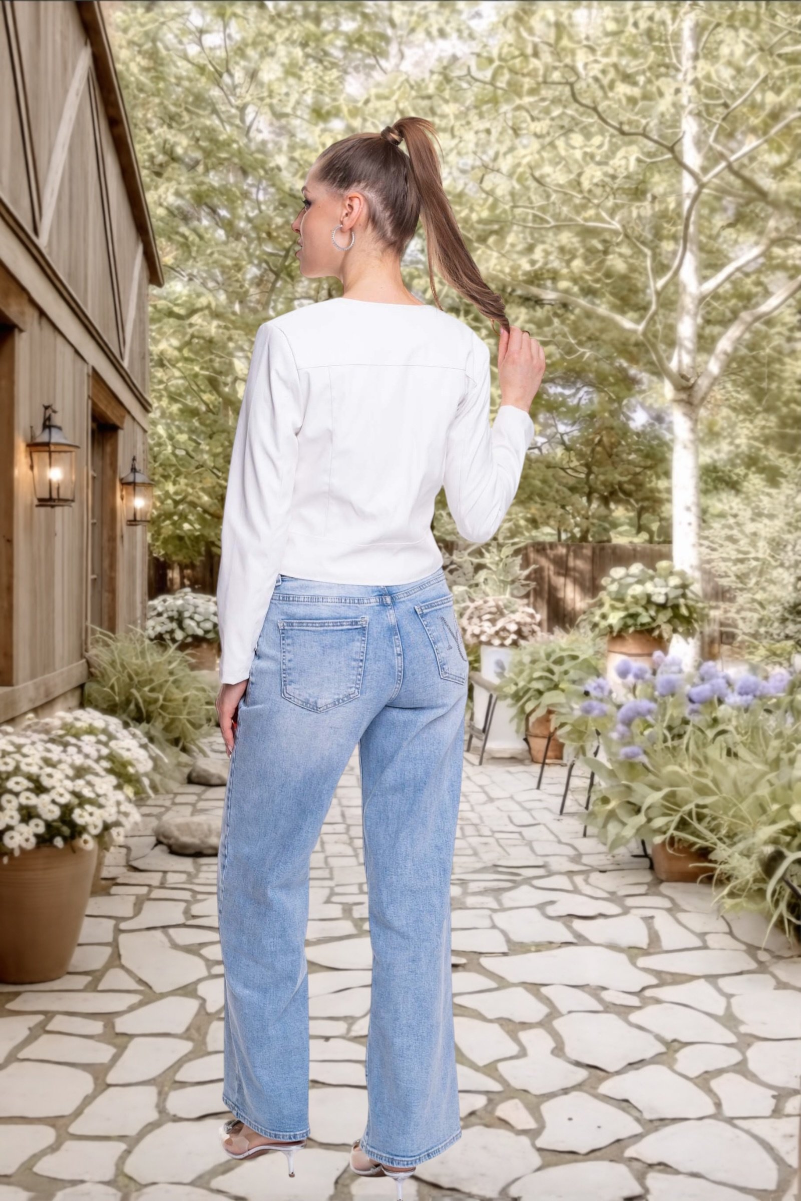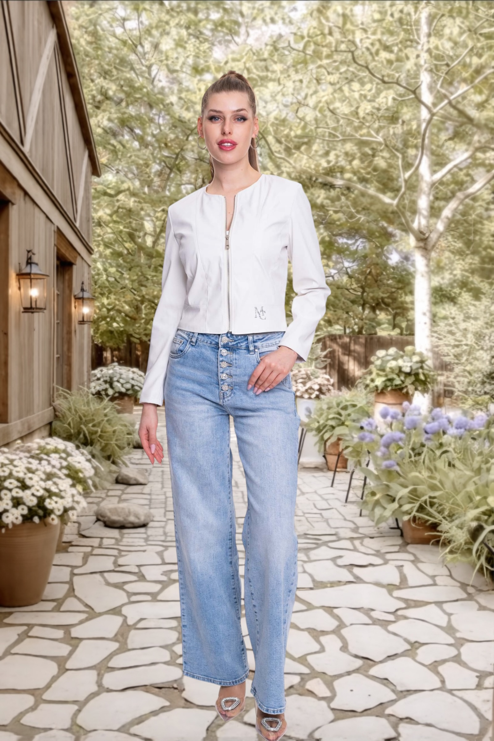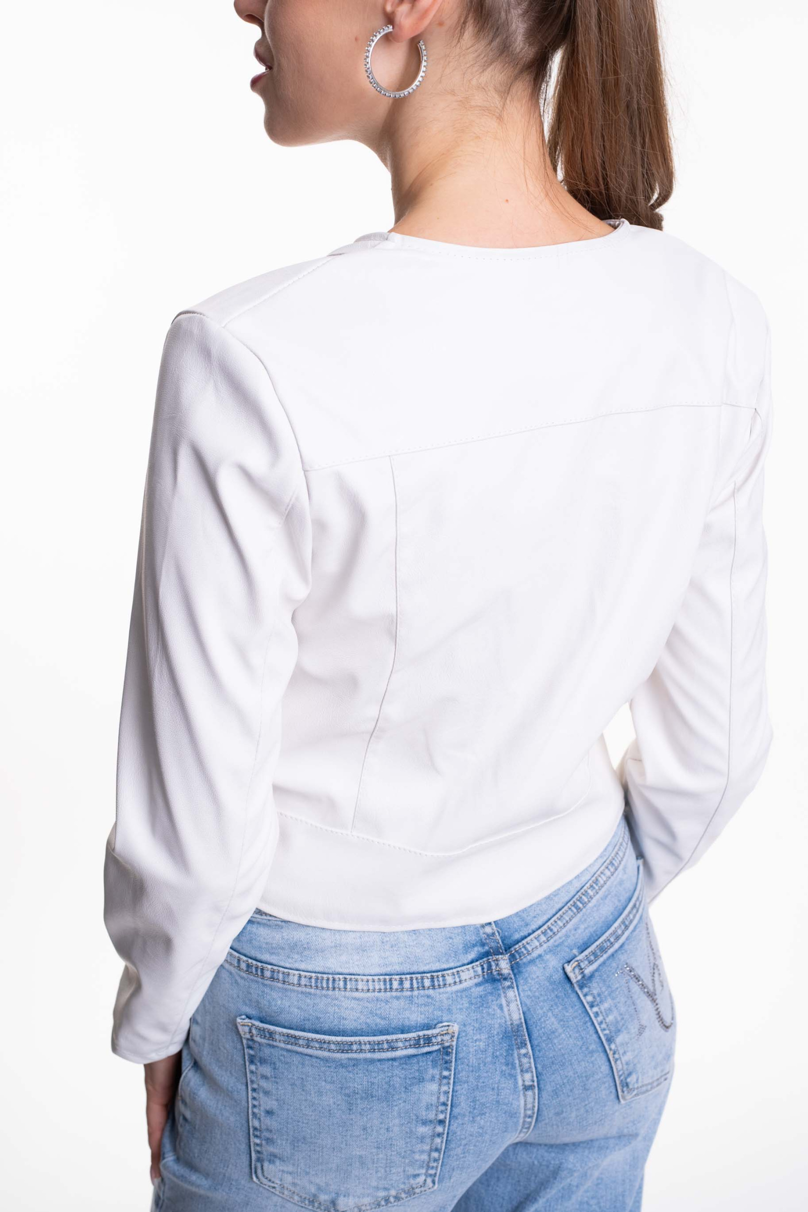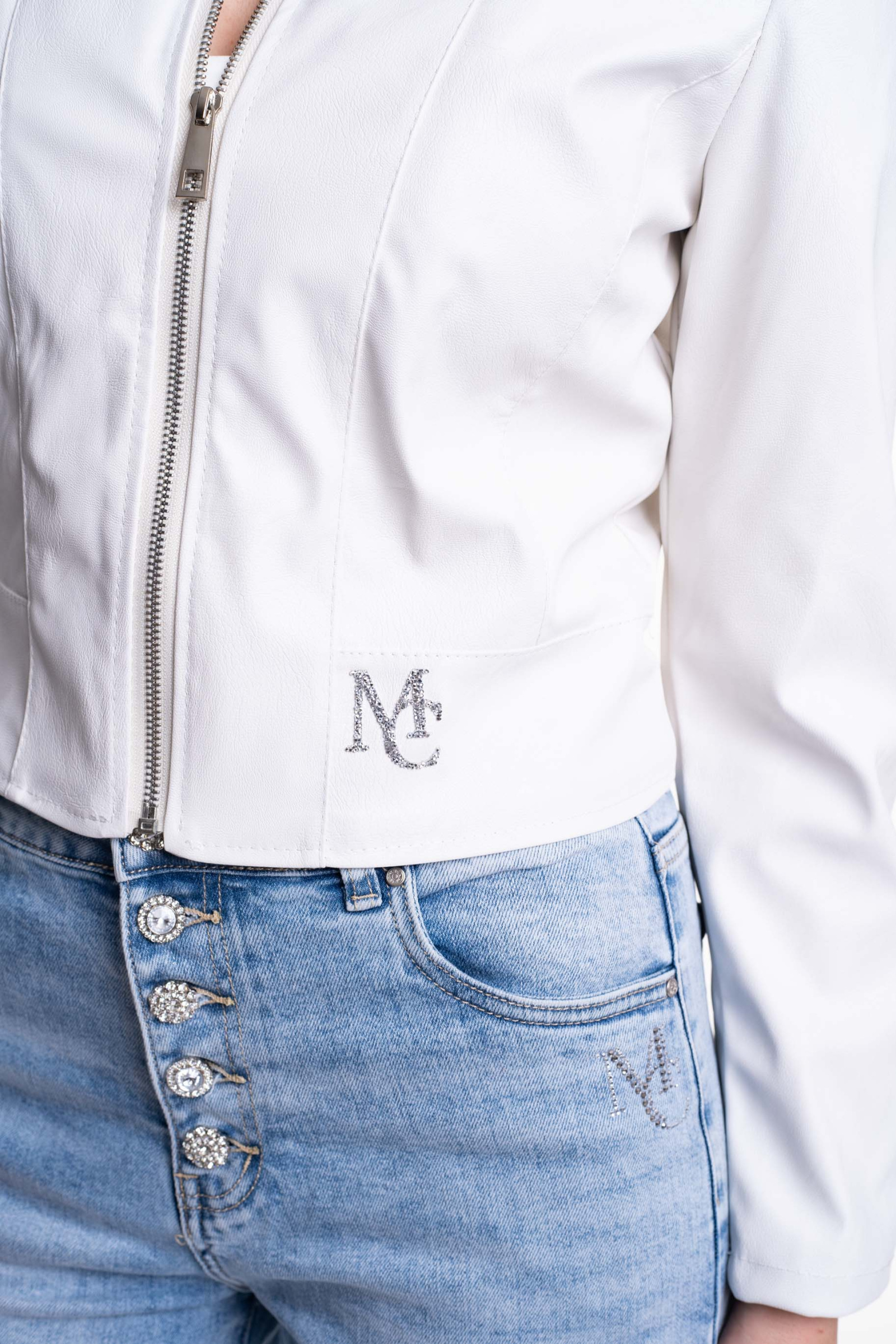 Műbőrből készült, cippzáras záródású, rövid fazonú dzseki, alján strasszos matrica nyomott márkajelzéssel.